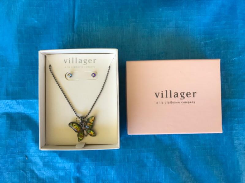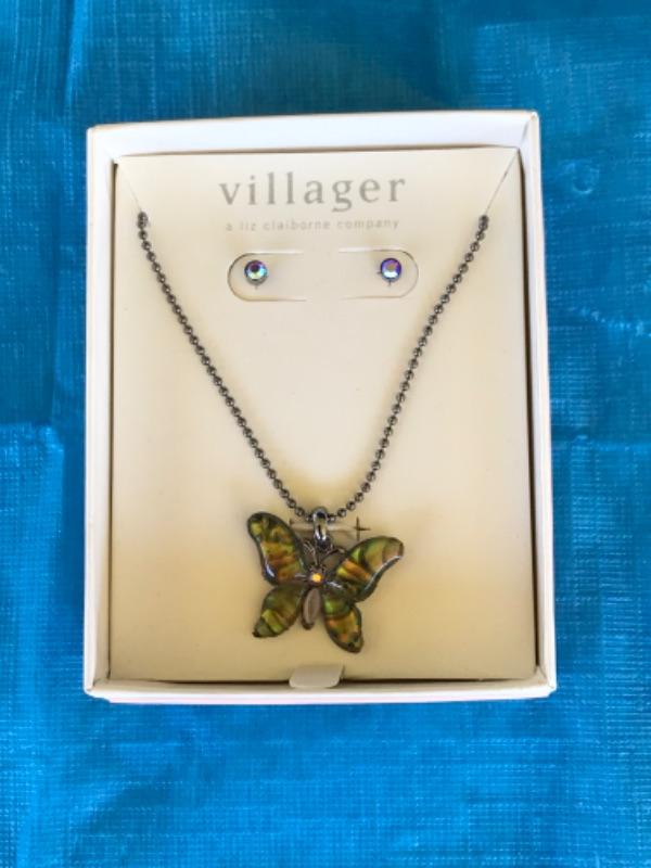 Villager by Liz Claiborne Butterfly Necklace with Stud earrings. Faux mother of pearl wings. It comes in original gift box.