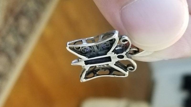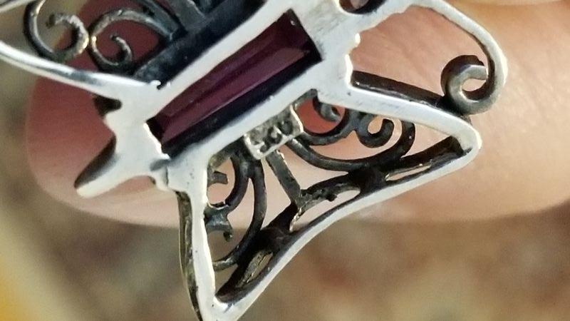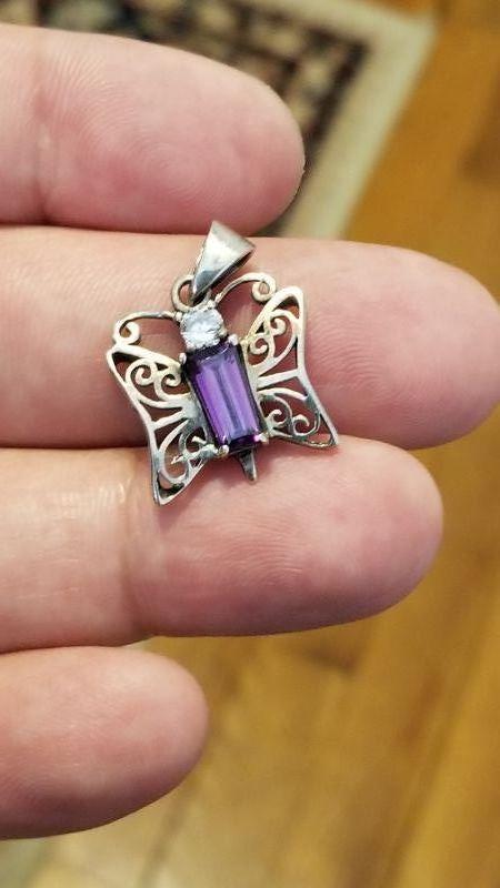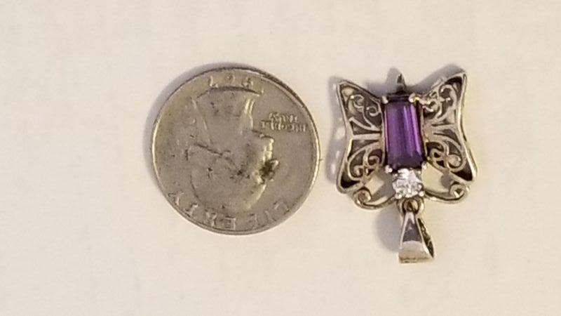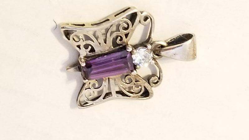 Marked 925, butterfly pendant with large purple stone on the body and a clear round stone on top.