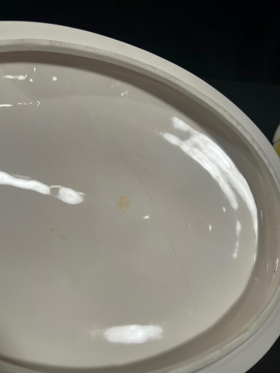 Has a Hair line Crack in lid. Still Perfectly Functional and Pretty. Has a ladle that comes with it.