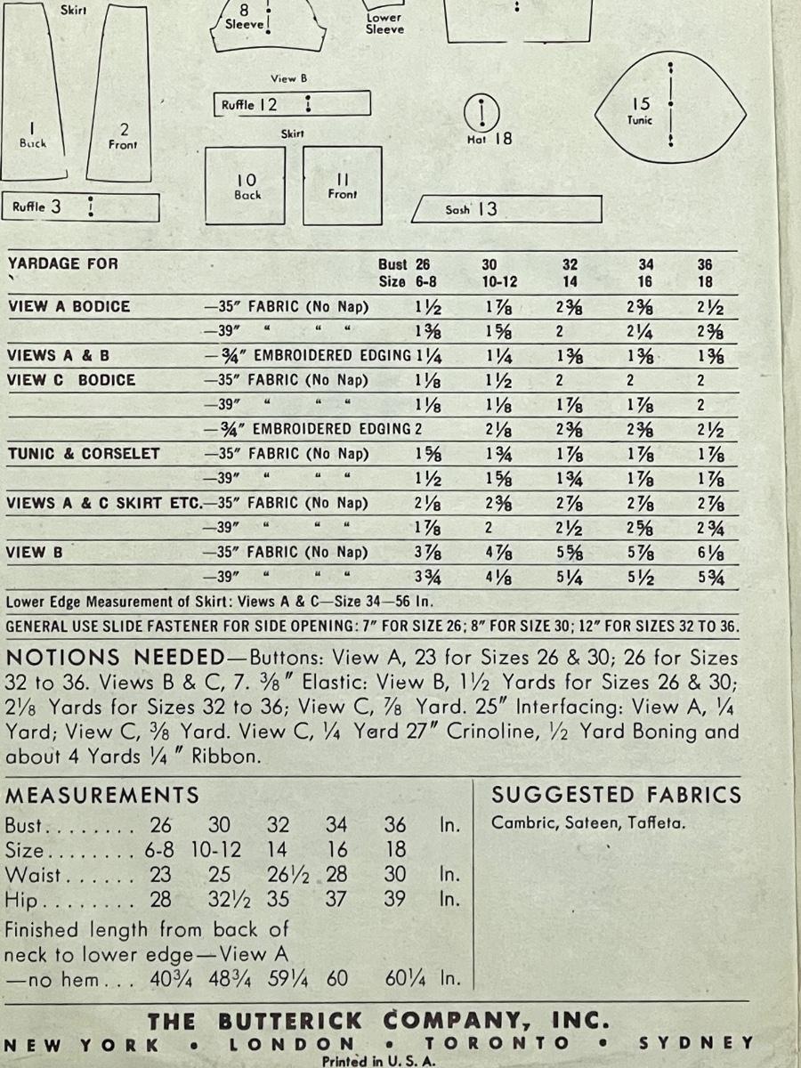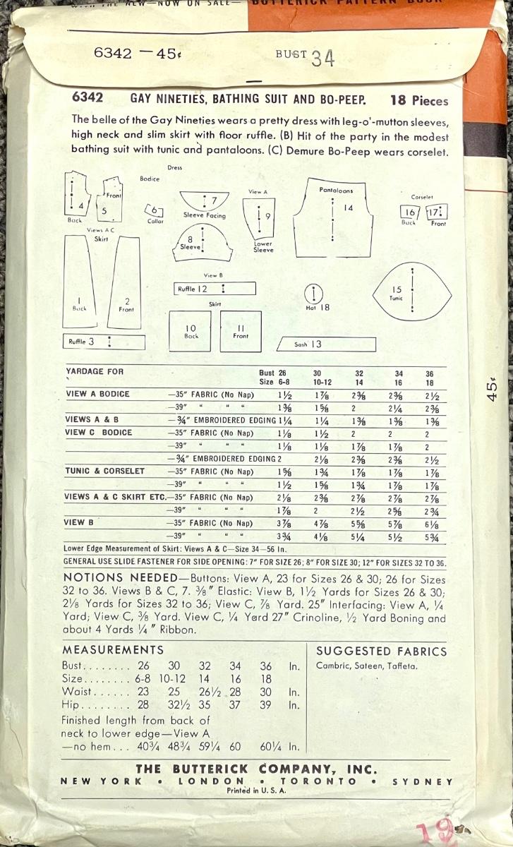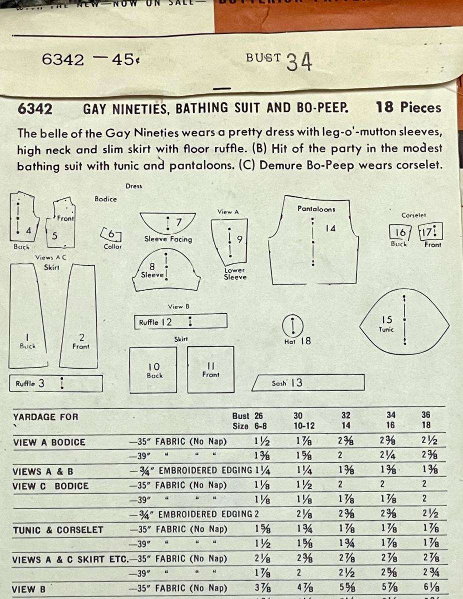Butterick Printed Pattern No. 6342 Gay Nineties Bathing Suit and Bo-Peep bust 34. All pieces verified.