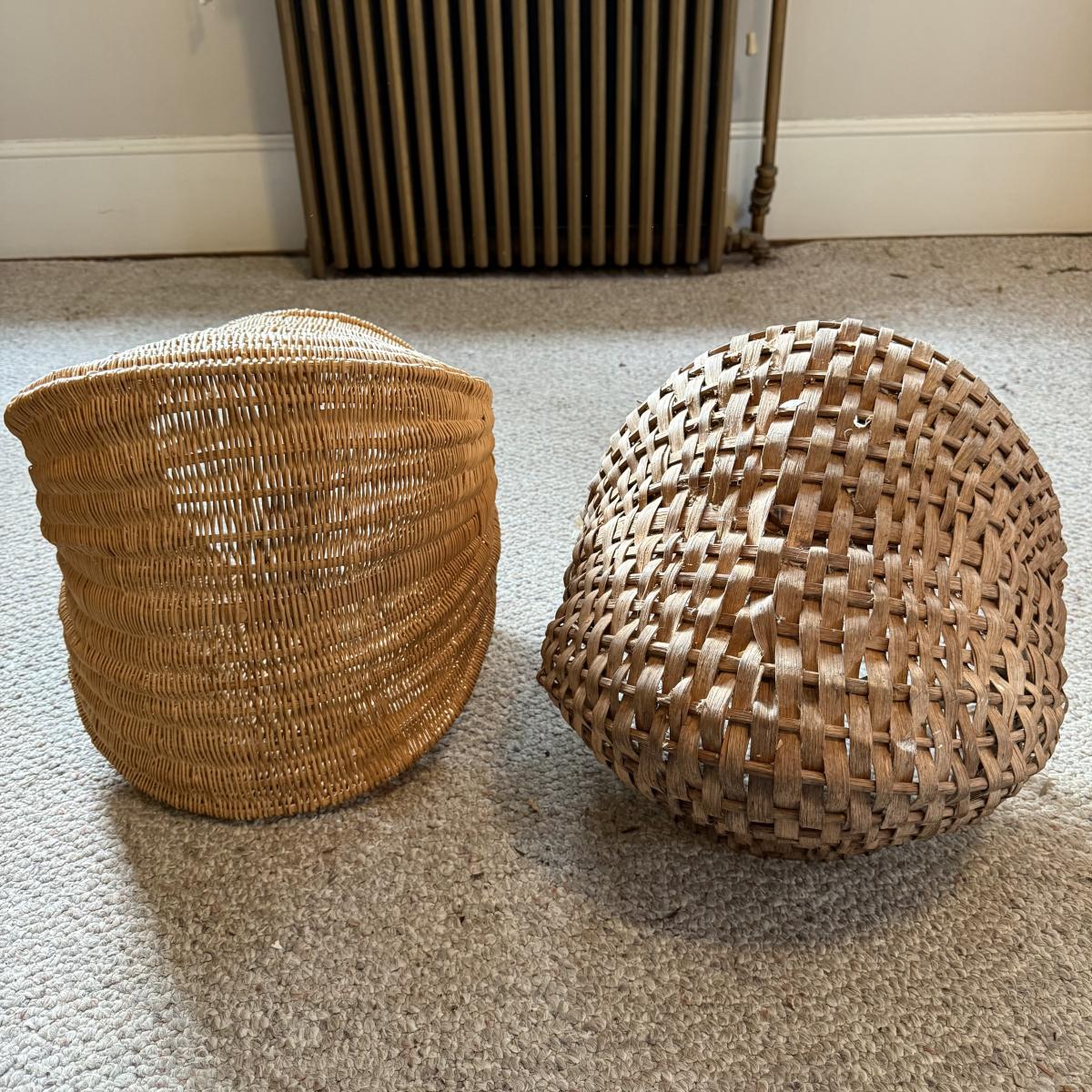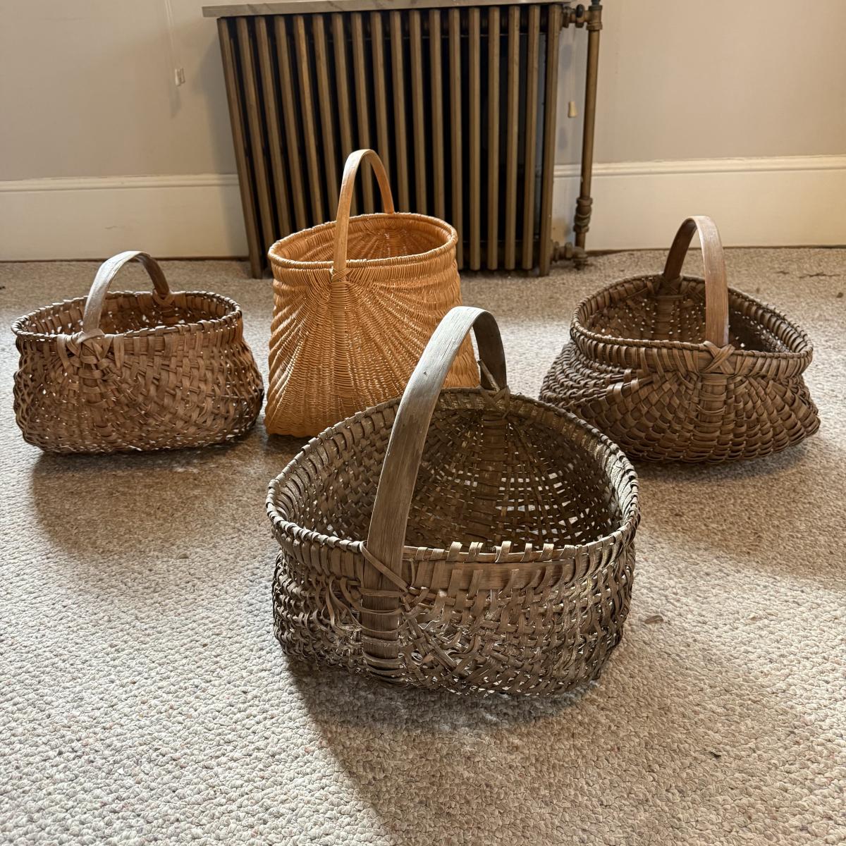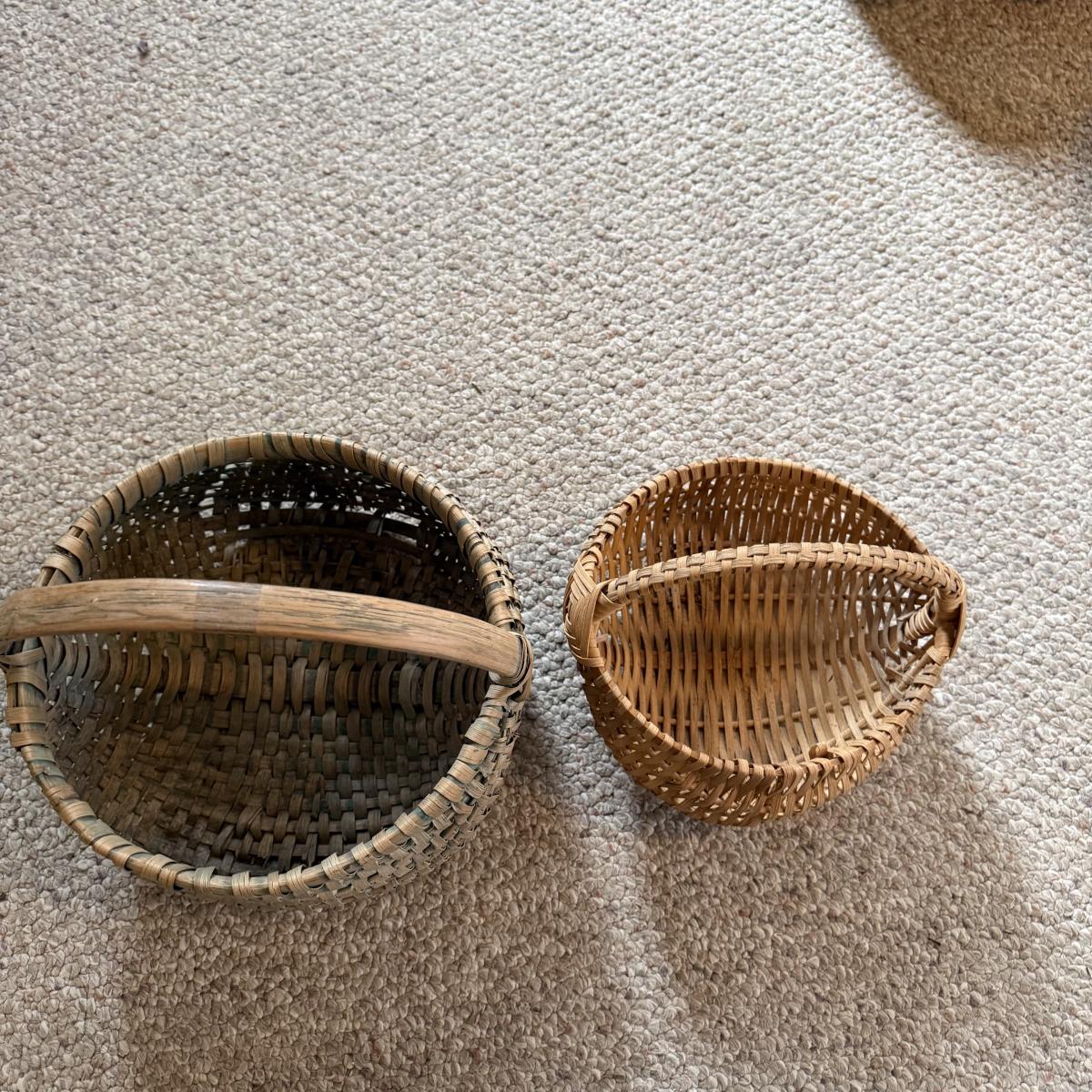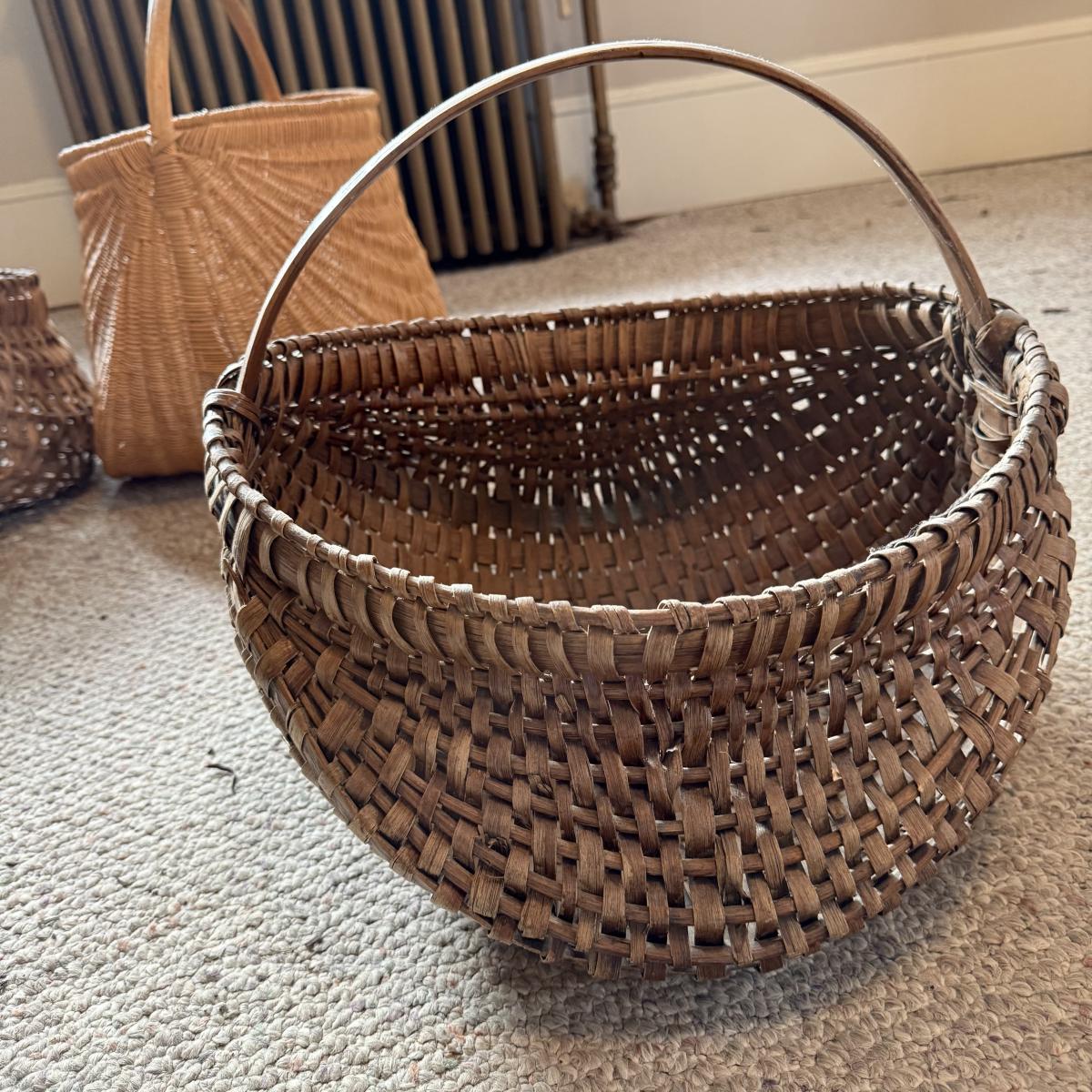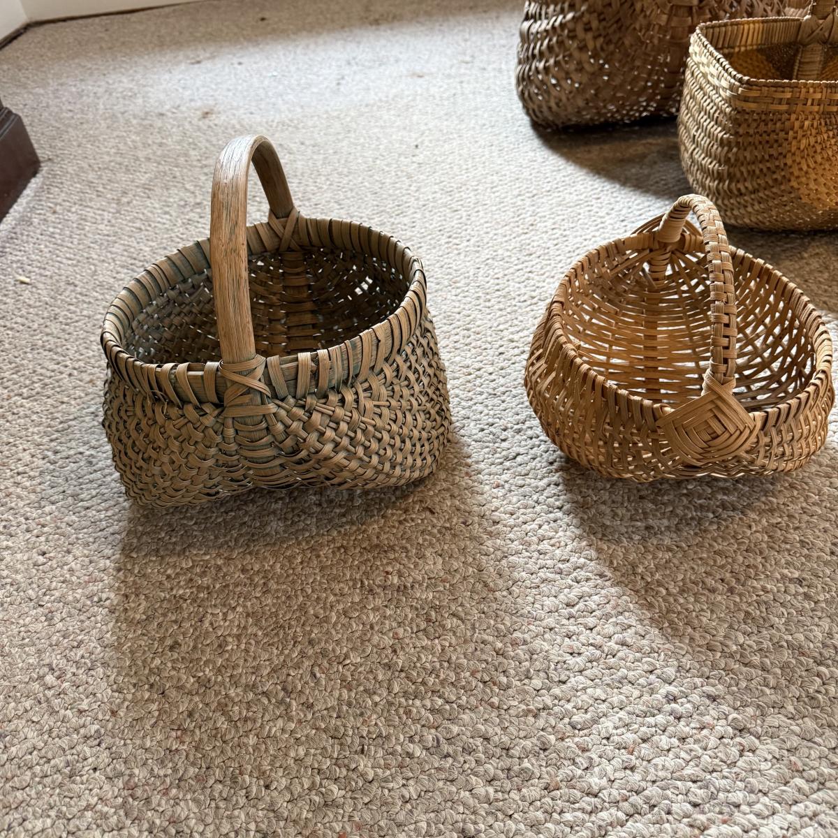 This lot contains a total of eight buttocks baskets. There are a variety of sizes and colors. The smallest is a precious light dual-colored that has a square cross weave at each base of the handle, it measures 8.5” x 9” x 8”H. The largest one is a stunning light-colored buttocks basket with a handle. The base has almost a rectangular shape while the rim is more oval. This piece measures 13.5” x 11.5” x 18.5”. There are a couple of breaks in some baskets, see pictures for details. See pictures for full inventory. Shipping available.