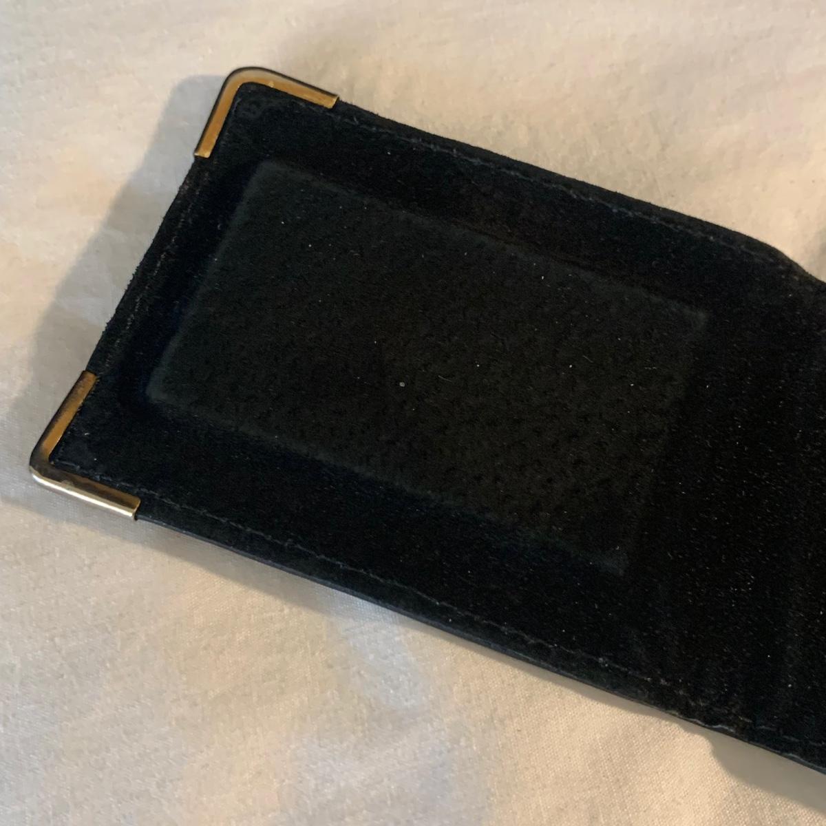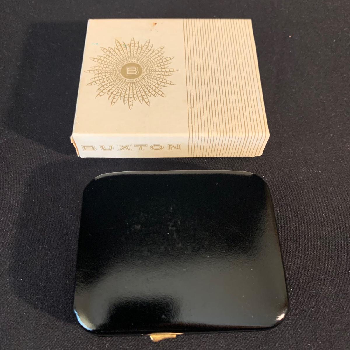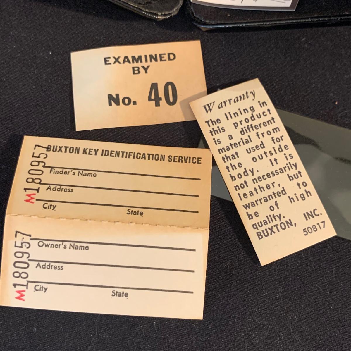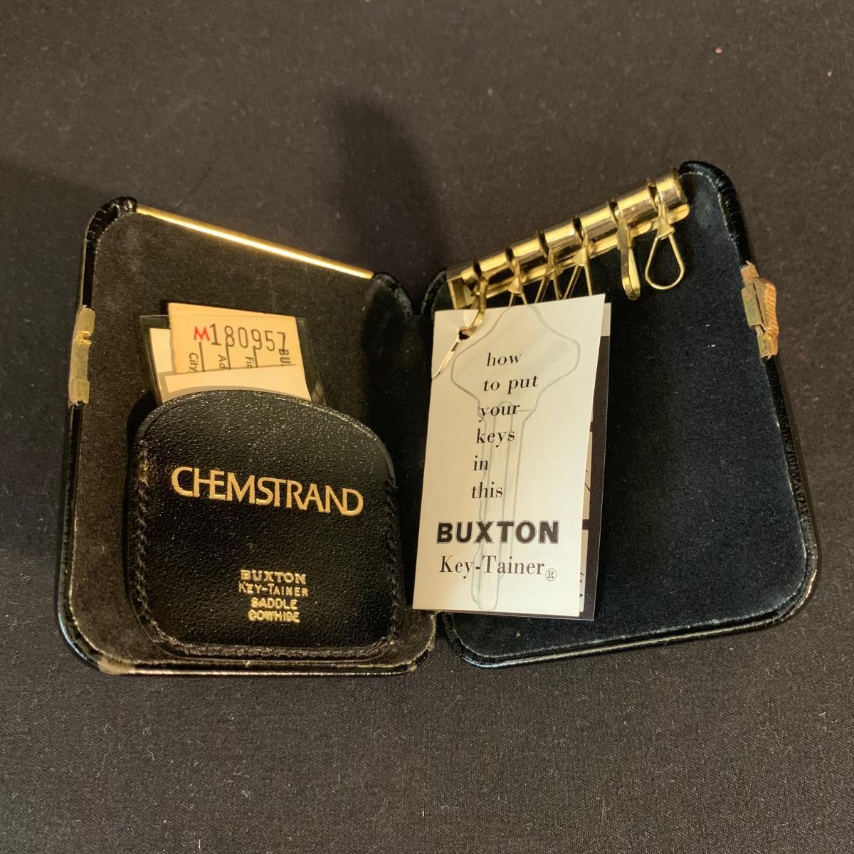 Buxton Key-Tainer in its original box, appears to be unused. Three money clips: one is magnetic with a leather-feeling outside and suede-feeling inside that measures 3.5” x 2.75” when closed, and the other two are gold-colored metal. One of these is marked Anson and monogrammed with an “S”. Shipping available.