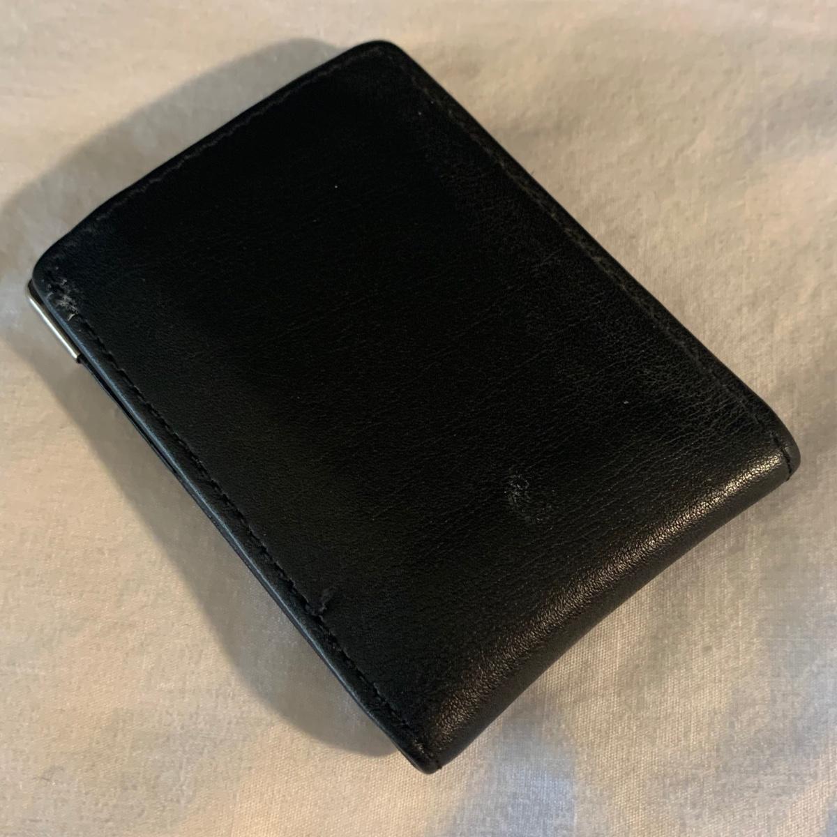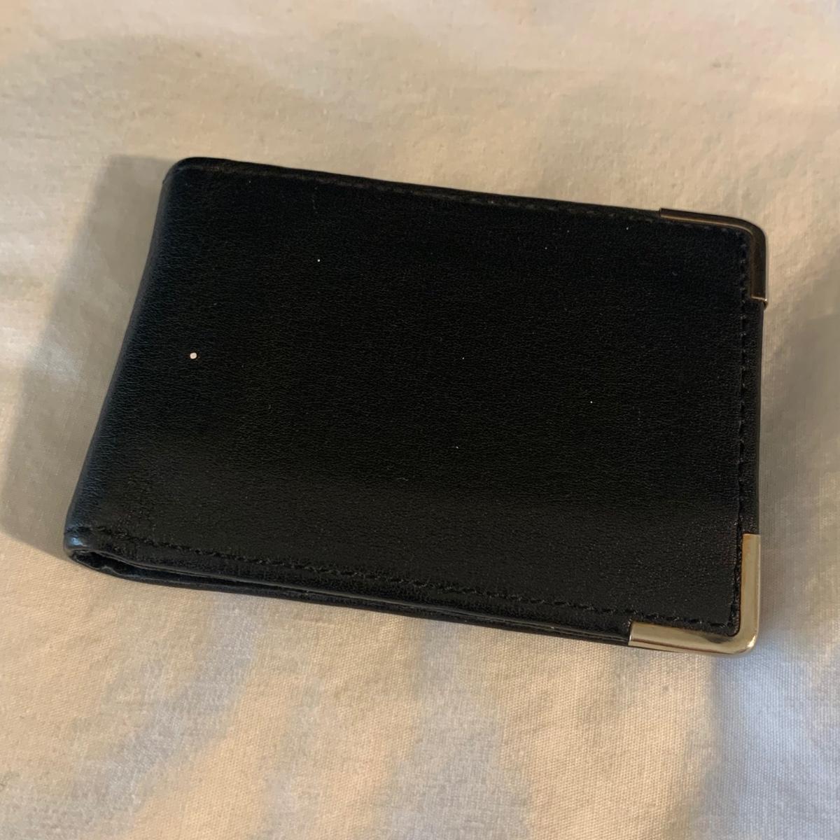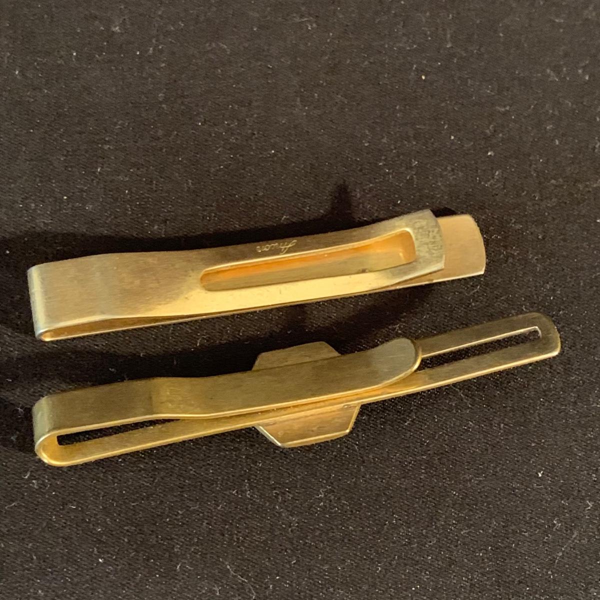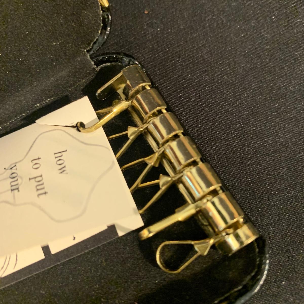 Buxton Key-Tainer in its original box, appears to be unused. Three money clips: one is magnetic with a leather-feeling outside and suede-feeling inside that measures 3.5” x 2.75” when closed, and the other two are gold-colored metal. One of these is marked Anson and monogrammed with an “S”. Shipping available.