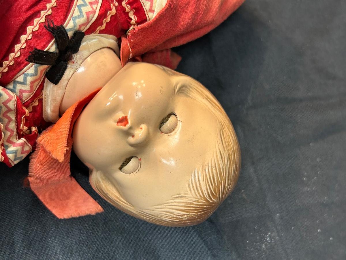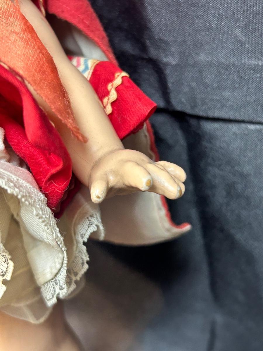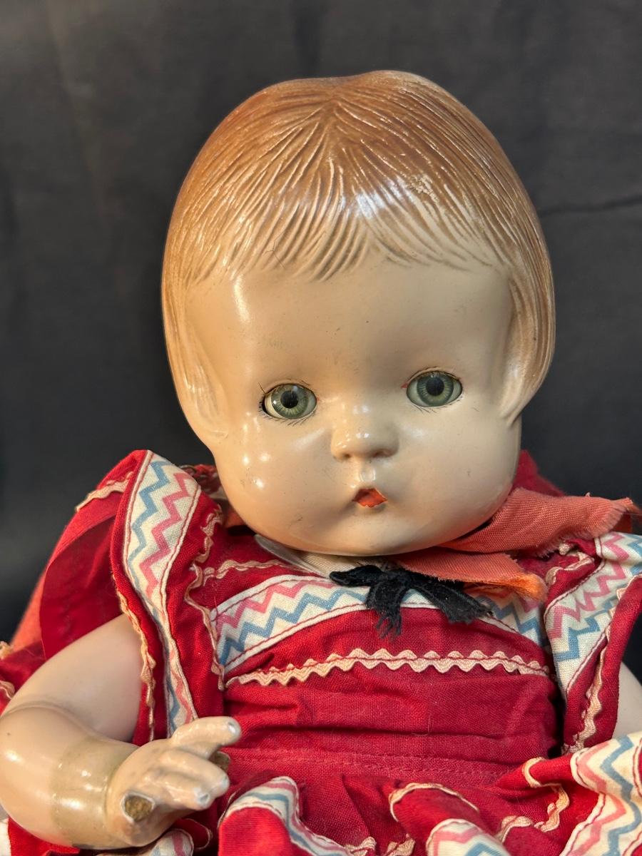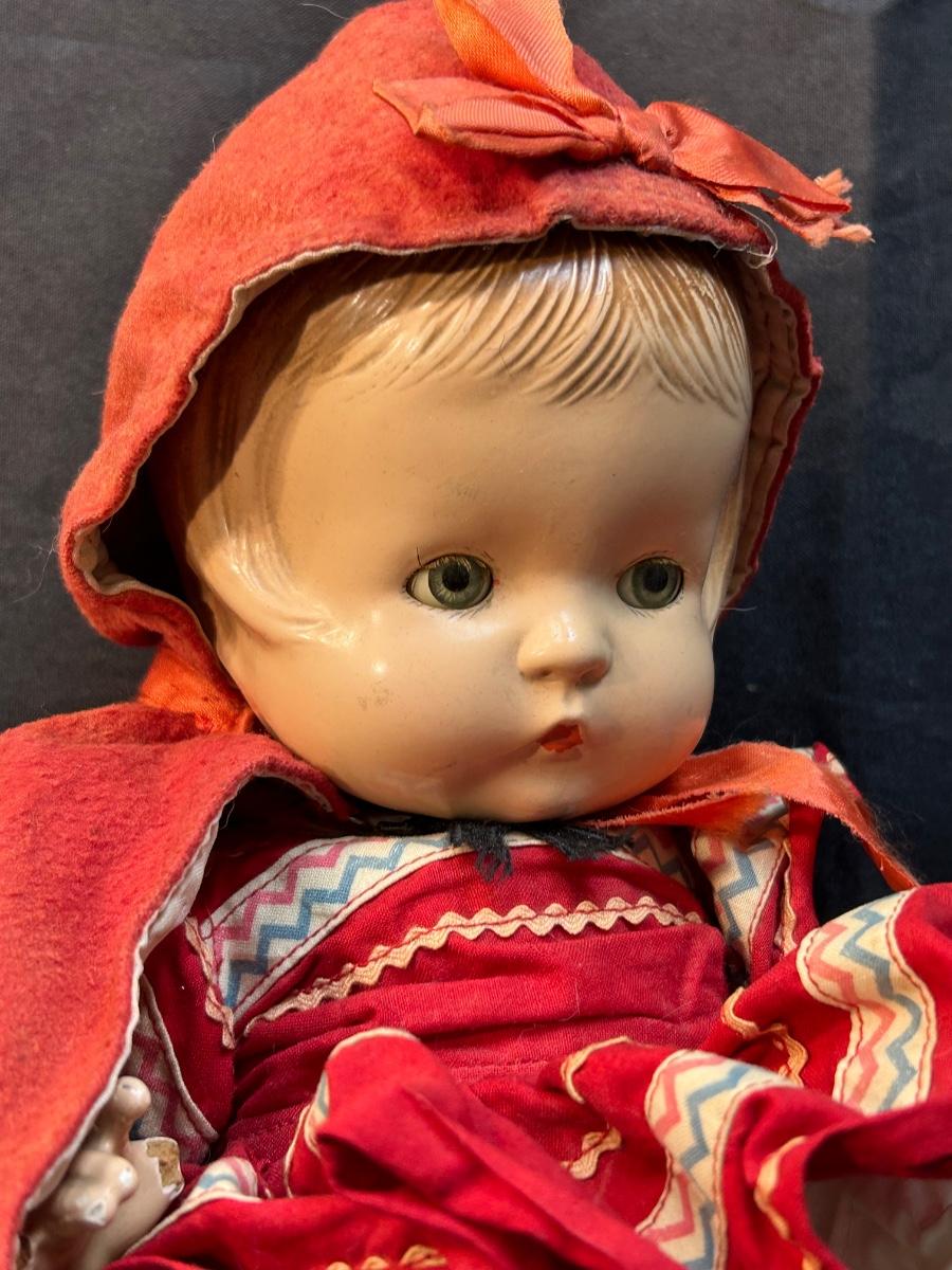 Vintage EffanBee Patsy Composite Sleepy Eye Doll Little Red Riding Hood Outfit. In good vintage condition. Face paint in good condition. Minimal wear to composite despite missing some finger tips. Her joints are a little loose but she will stand on her own. Outfit looks to be Little Red Riding Hood.