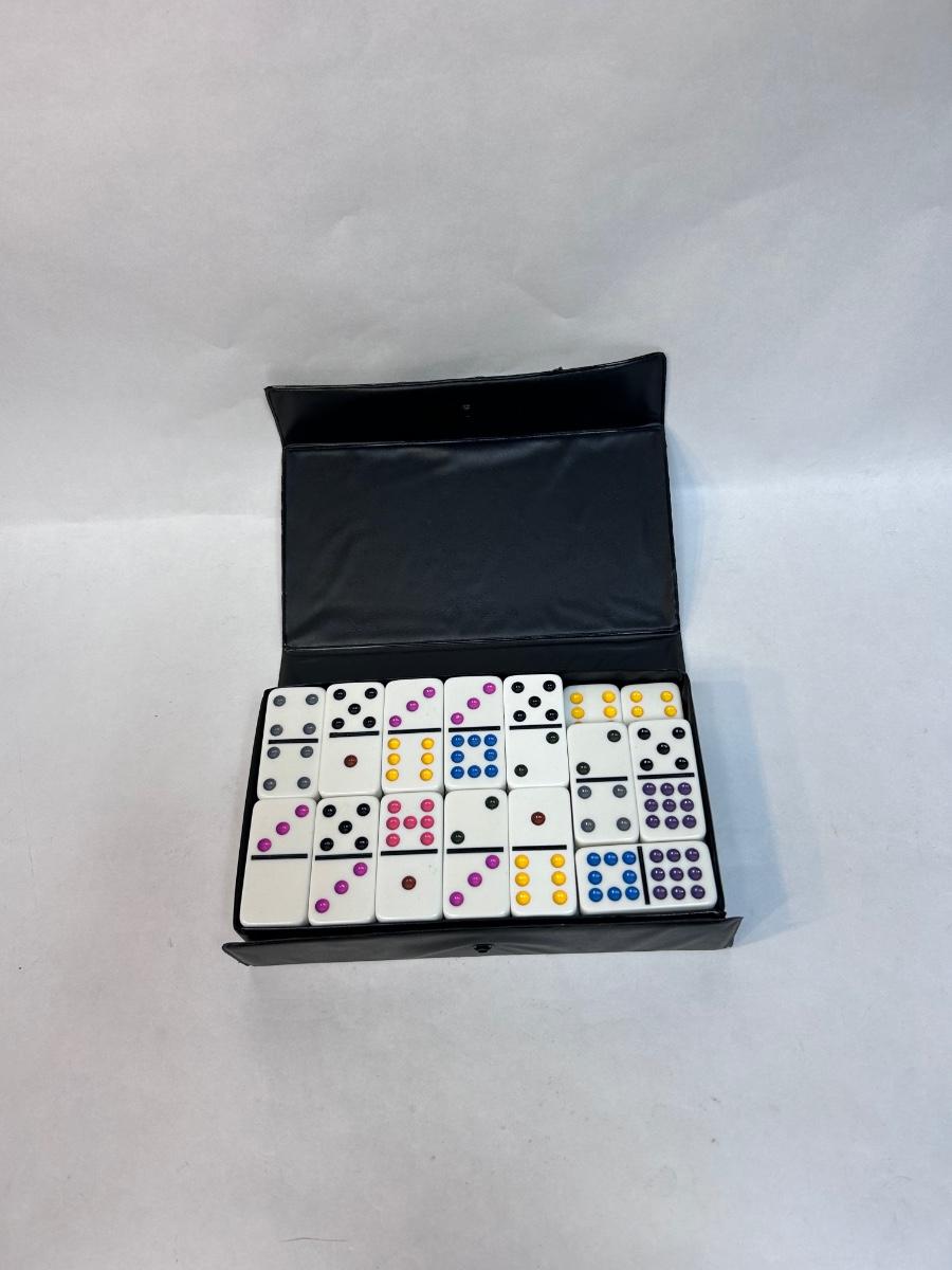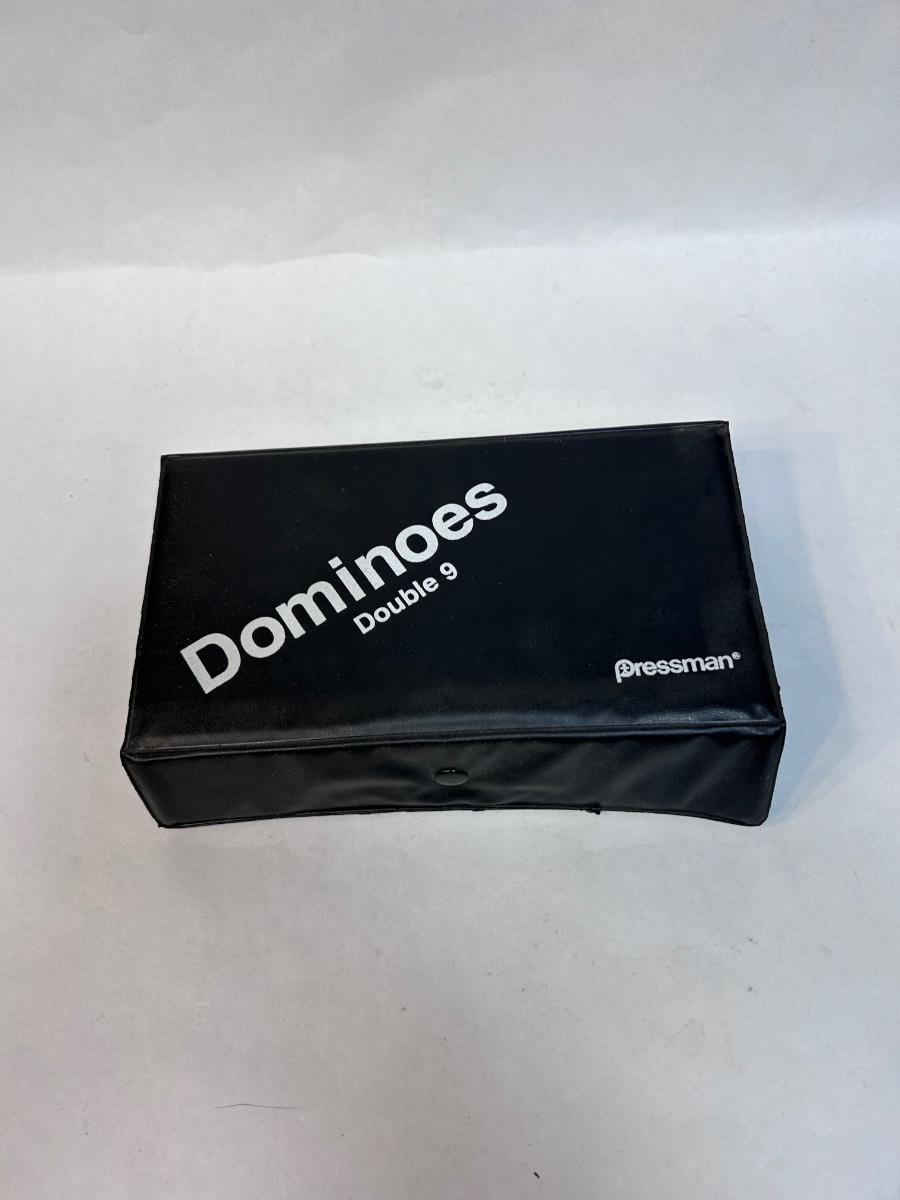 Double Nine Colorful Dot Dominoes in Case by Pressman. Possibly missing one domino, shouldn't affect game play too much.