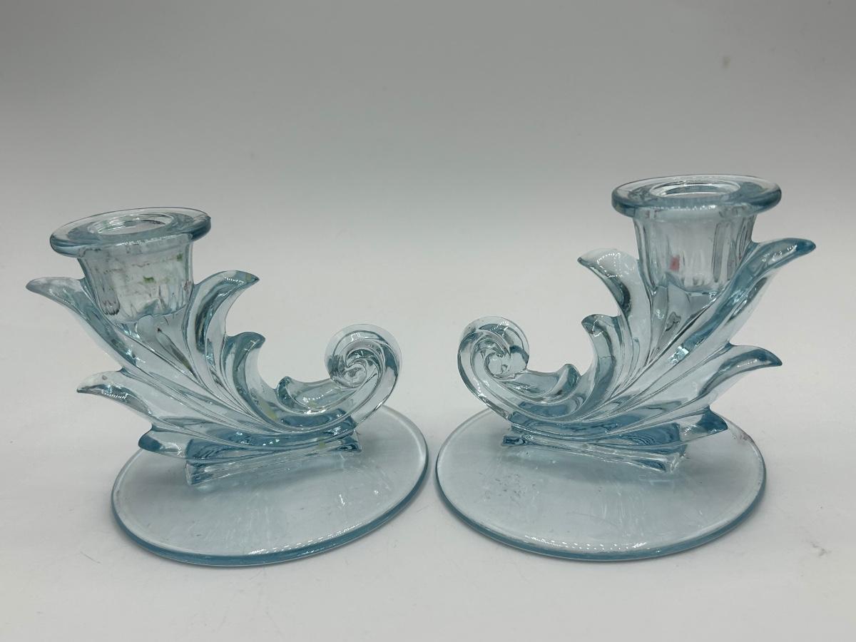 Pair of Pale Blue Fostoria Baroque Glass Candelabra Candle Holders