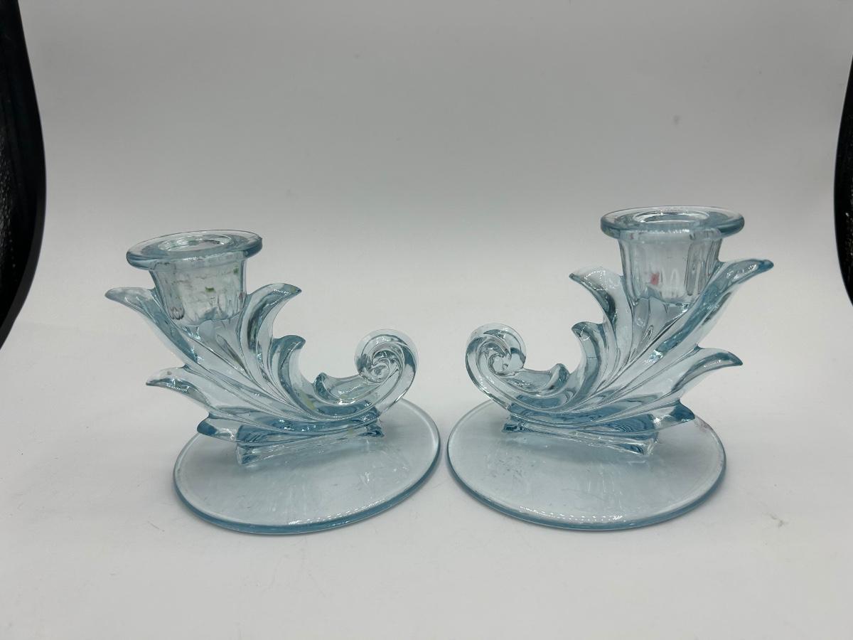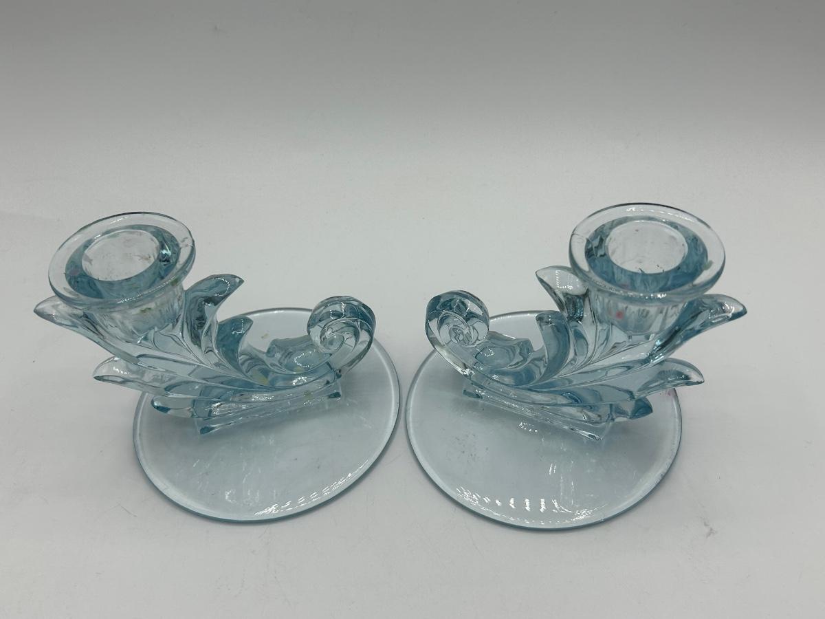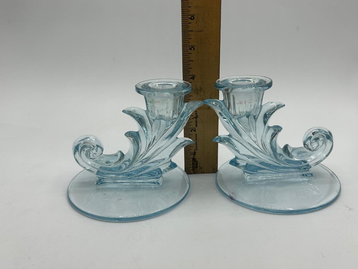 Pair of Pale Blue Fostoria Baroque Glass Candelabra Candle Holders. Beautiful pale blue color. In good condition.