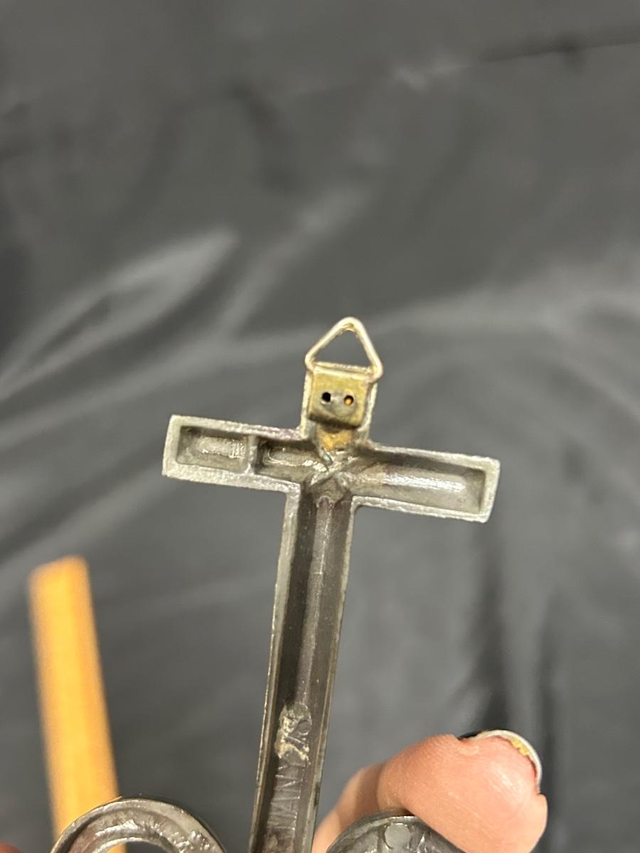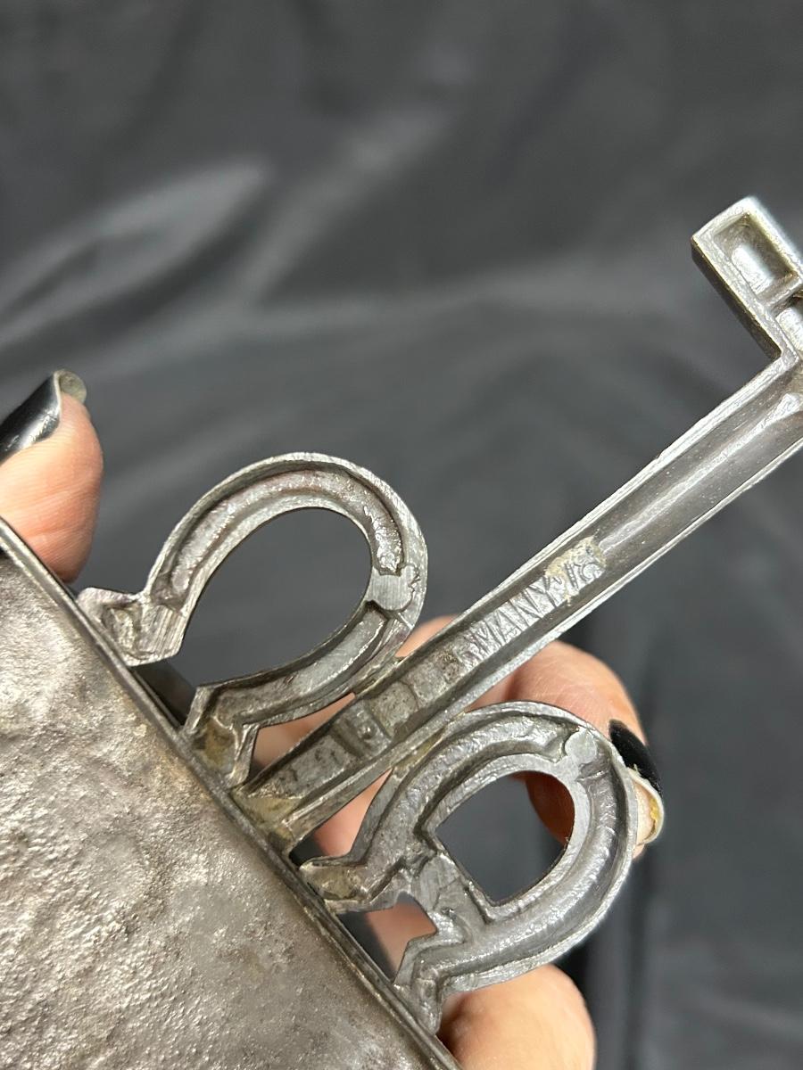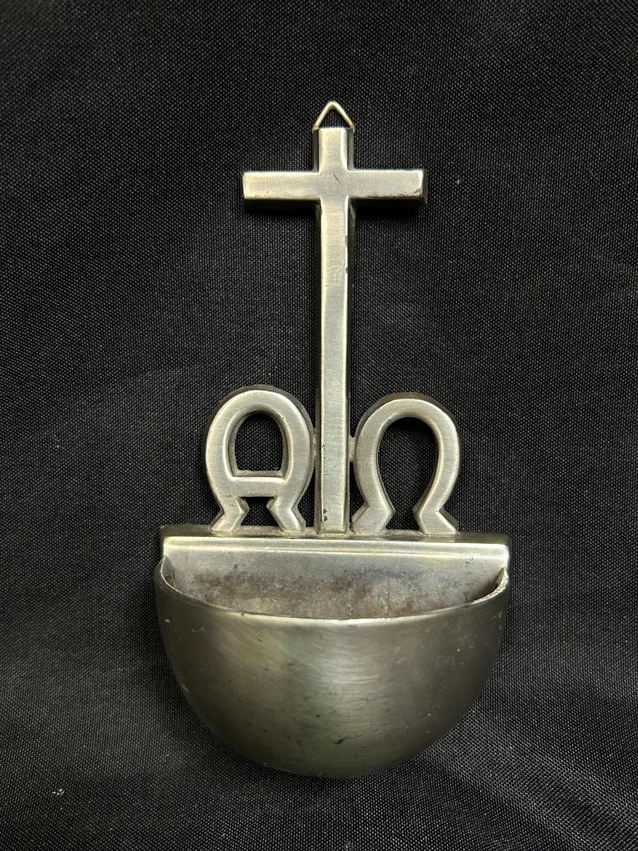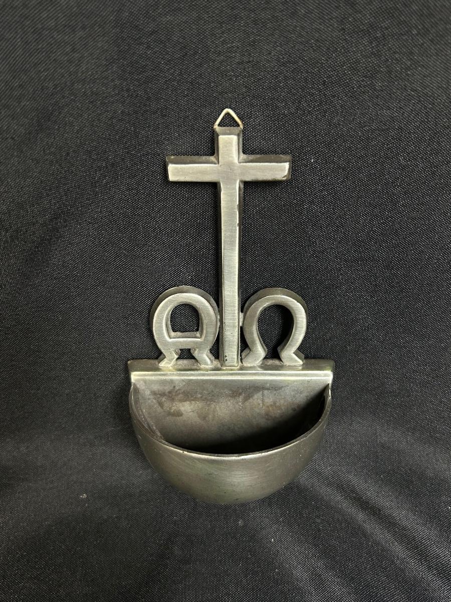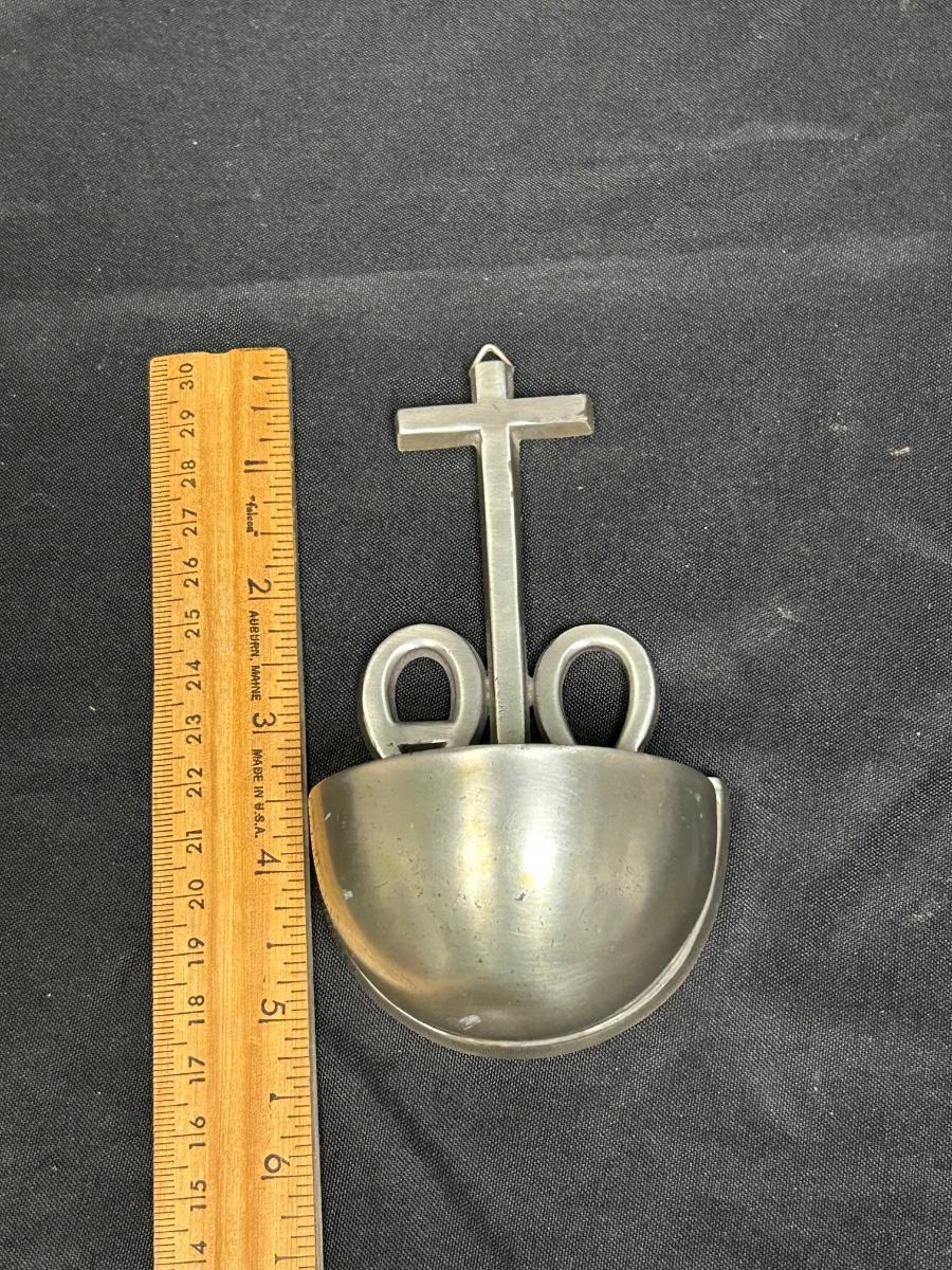 Small Wall Hanging Holy Water Stoup Font for the Home. Brushed metal finish in good condition. Under 6" size.