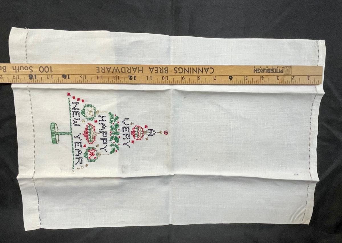 Vintage Hand Embroidered Christmas and New Years Tea Towels with Note. Handwritten note dates these from 1949. In good vintage condition. May have light discolor and wear from age. No major stains.