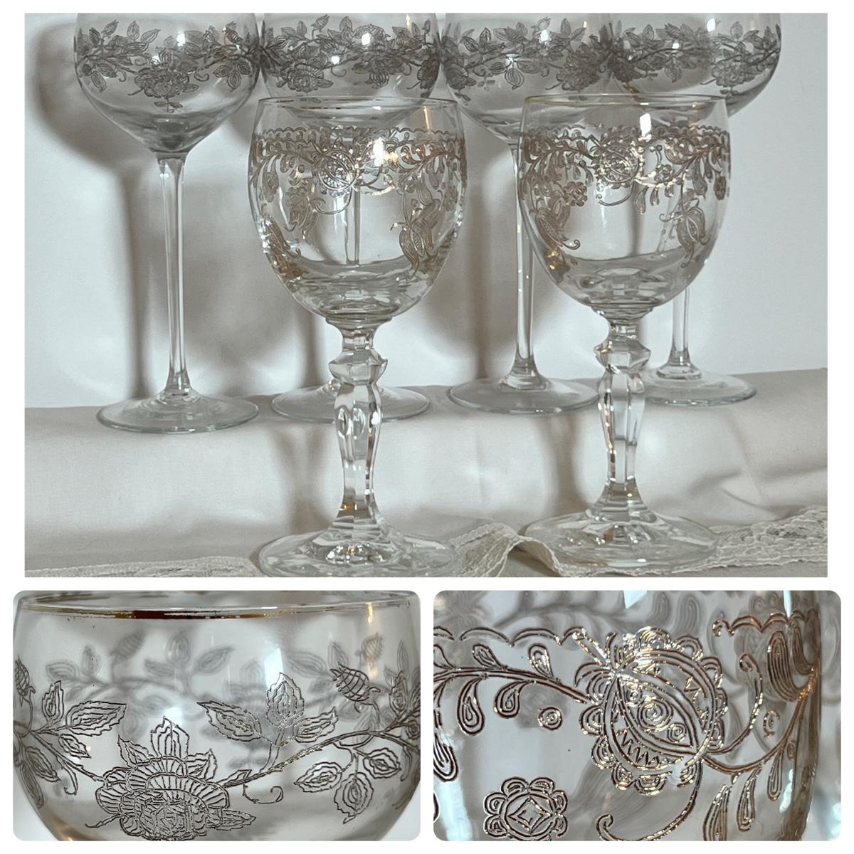 4 champagne glasses are silver overlay, 2 wine glasses have gold toned overlay. High quality glass / crystal.