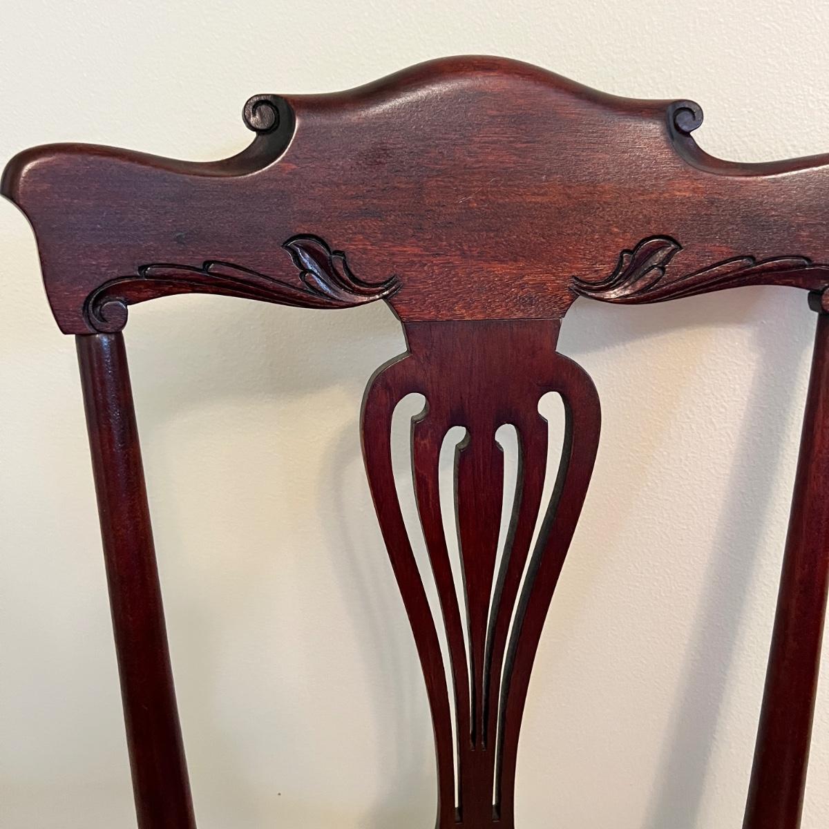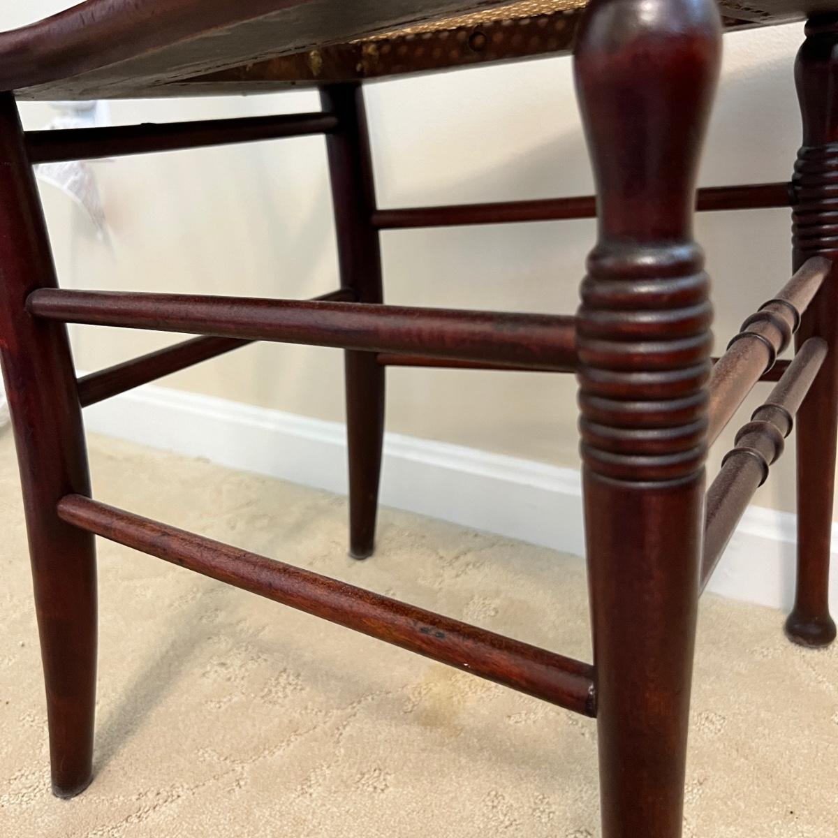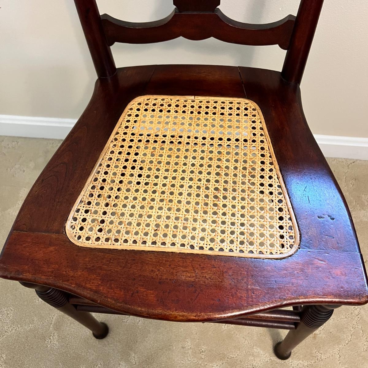 Mahogany wood with beautiful scrolling details. Both chair and cane seat are In great condition!