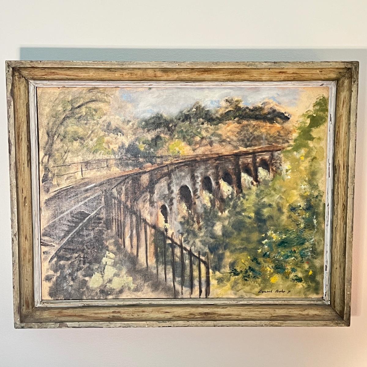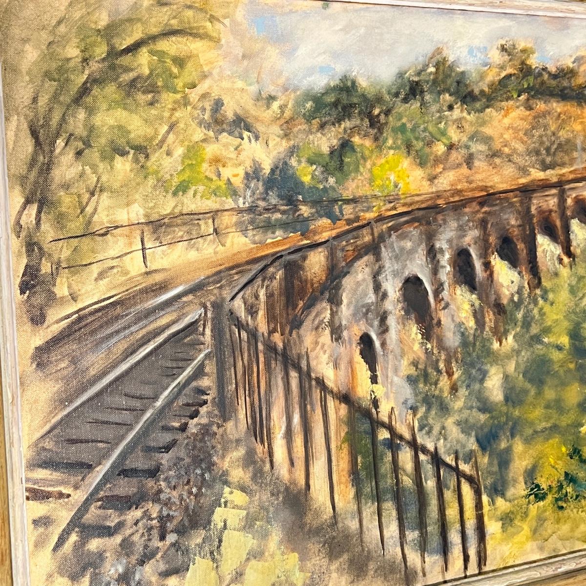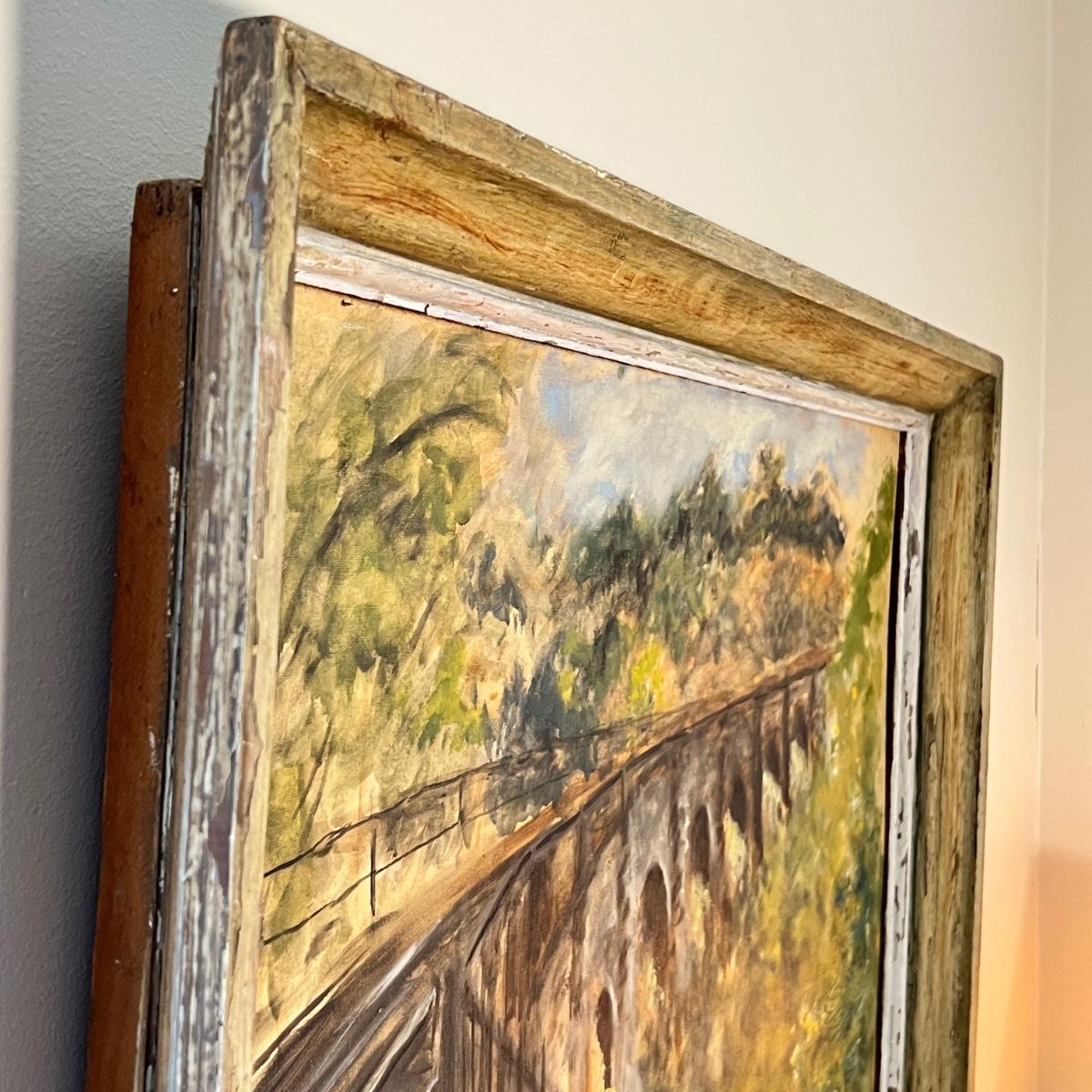 Vintage Original Railroad Crossing Oil Painting On Board 21"x27"
