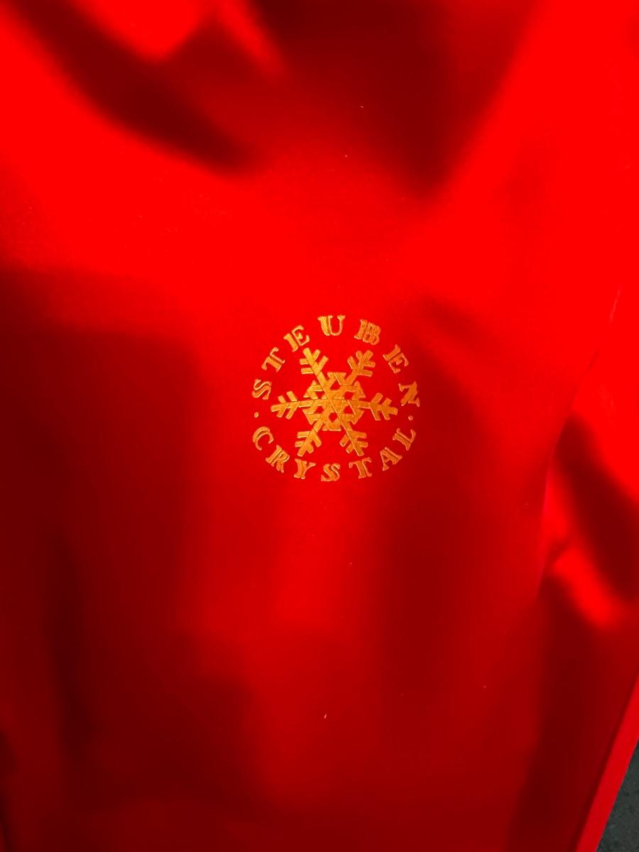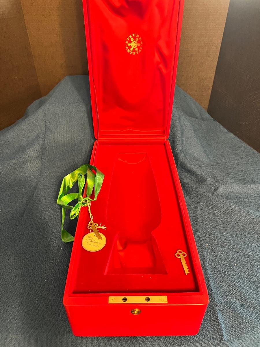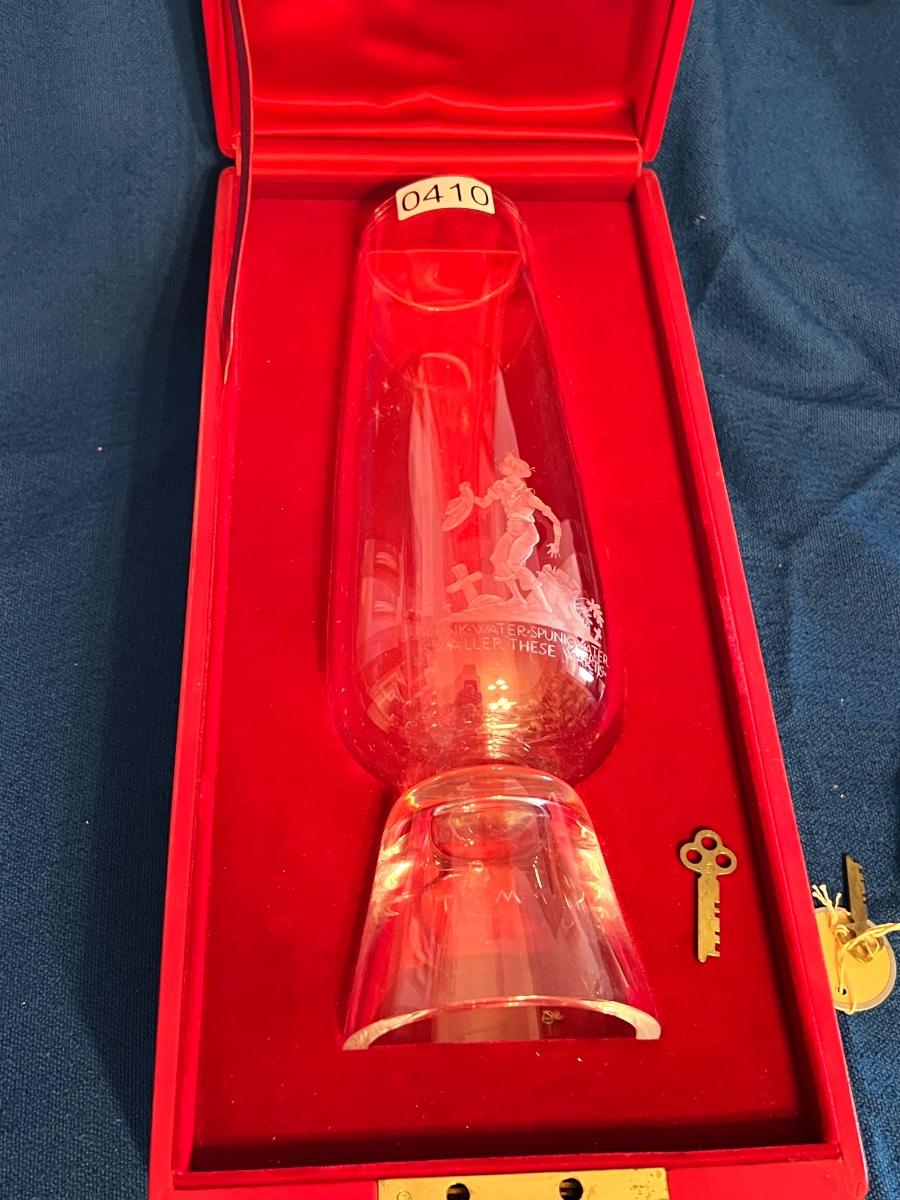 Authentic Steuben glass vase engraved with the figure of Tom Sawyer Designed by Bruce Moore. Comes with original satin lined case and 2 keys. Lock works. Case has some discoloration due to tape as shown in pic.