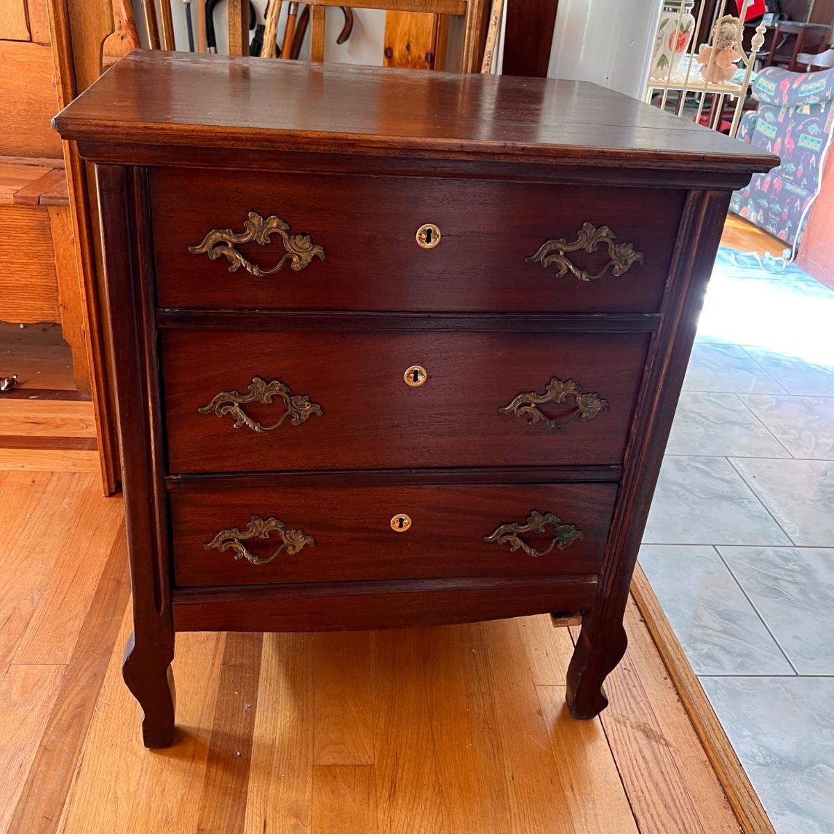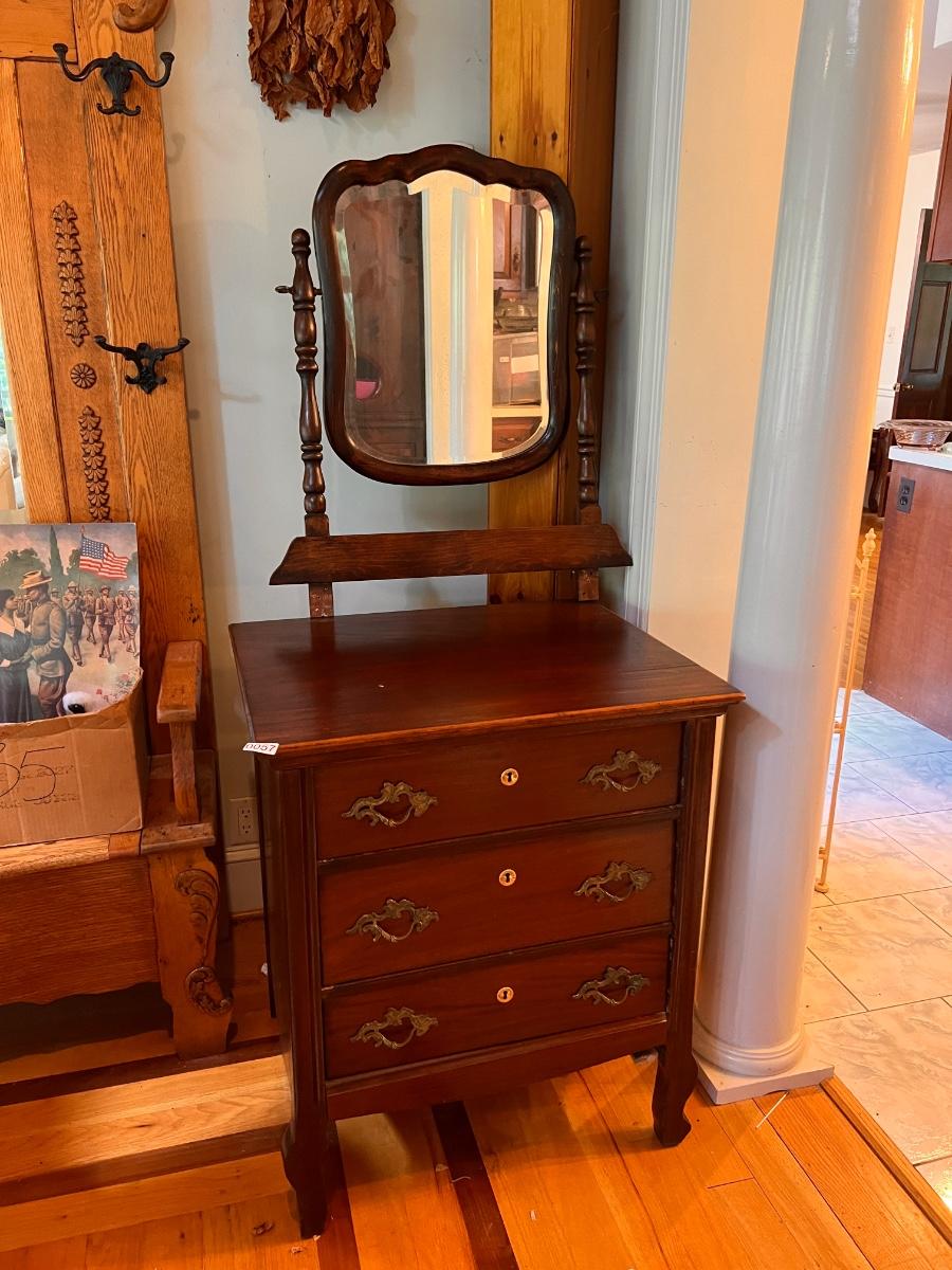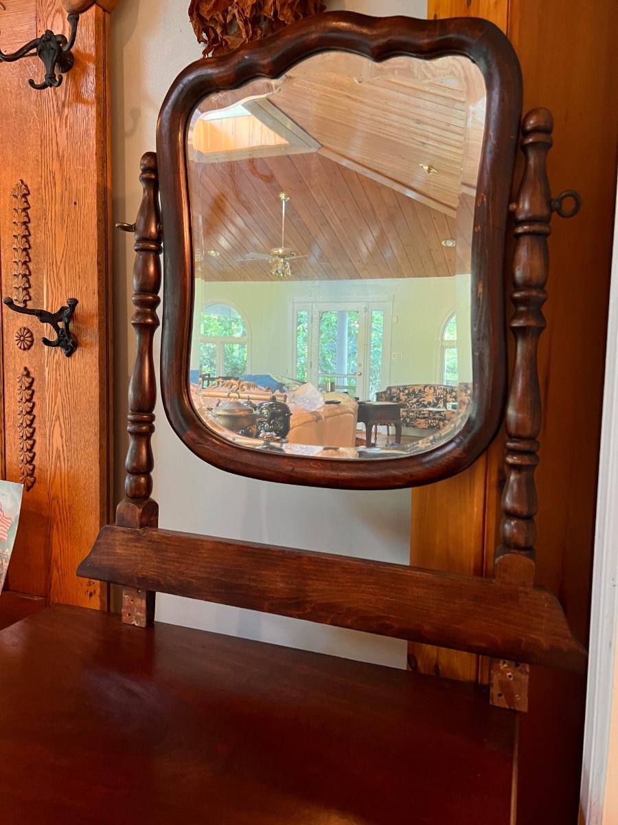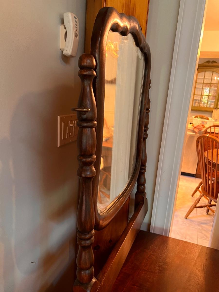Antique dresser with swivel mirror (already detached - comes with screws). In good antique condition, shows some wear as shown in pics. Keyhole hardware looks newer, not original. The rest of the hardware looks original.