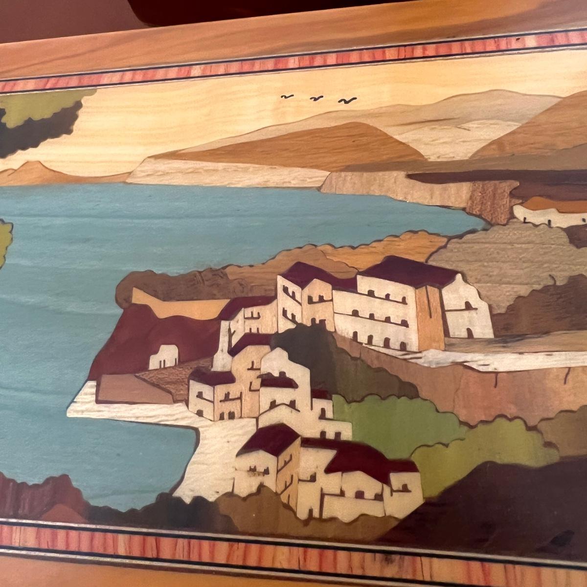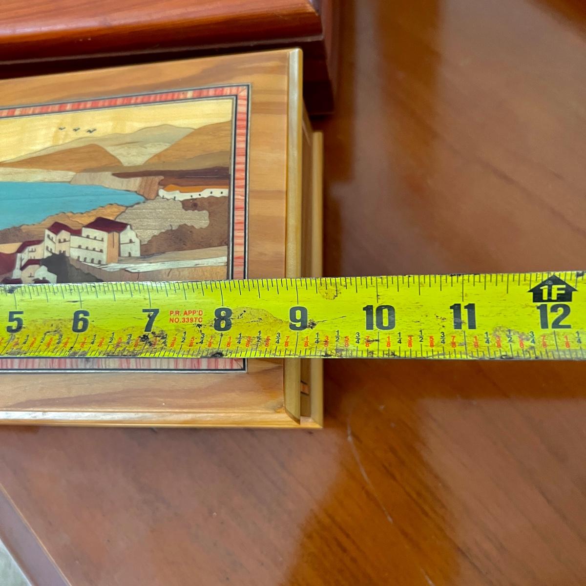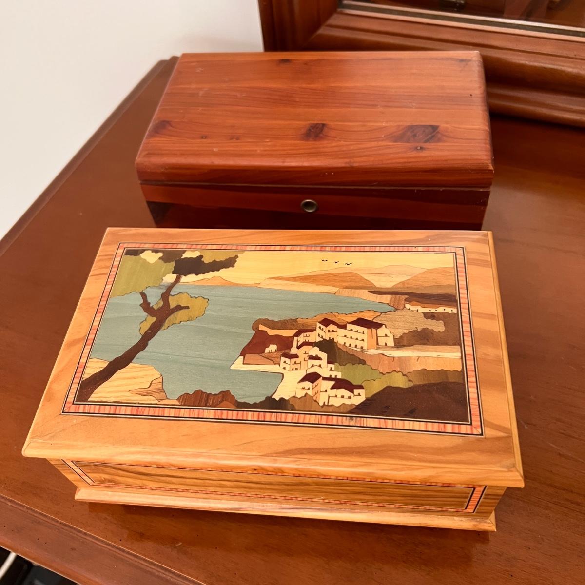 Vintage handmade Italian Unione Artigiani Intarsio Sorrentino #SR27 inlaid wood music box with the scene of Sorrento and Bay of Naples from a garden. Pristine condition. Plays Torna a Surriento. Also a Lane cedar wood jewelry box/chest in good condition.