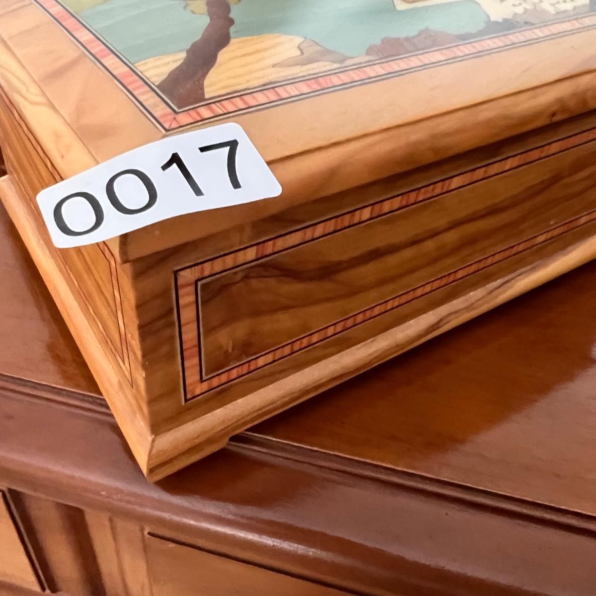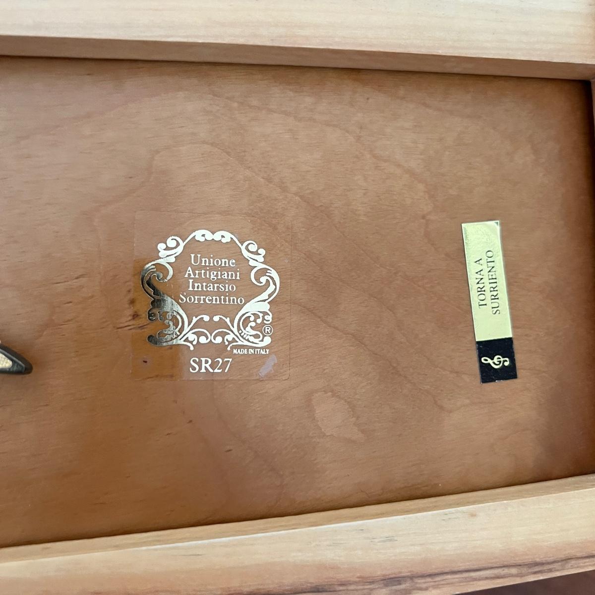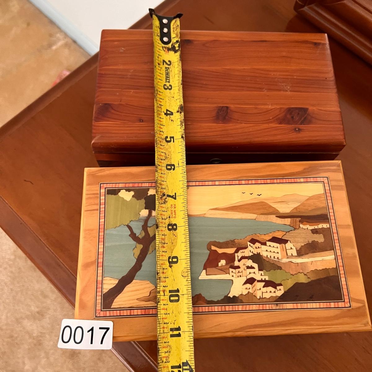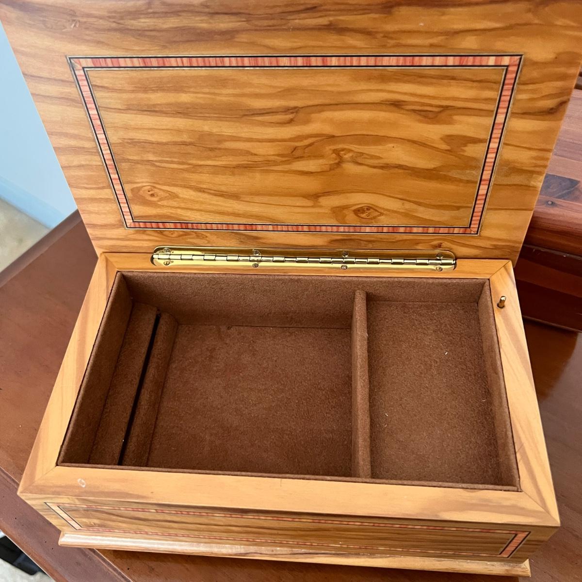 Vintage handmade Italian Unione Artigiani Intarsio Sorrentino #SR27 inlaid wood music box with the scene of Sorrento and Bay of Naples from a garden. Pristine condition. Plays Torna a Surriento. Also a Lane cedar wood jewelry box/chest in good condition.