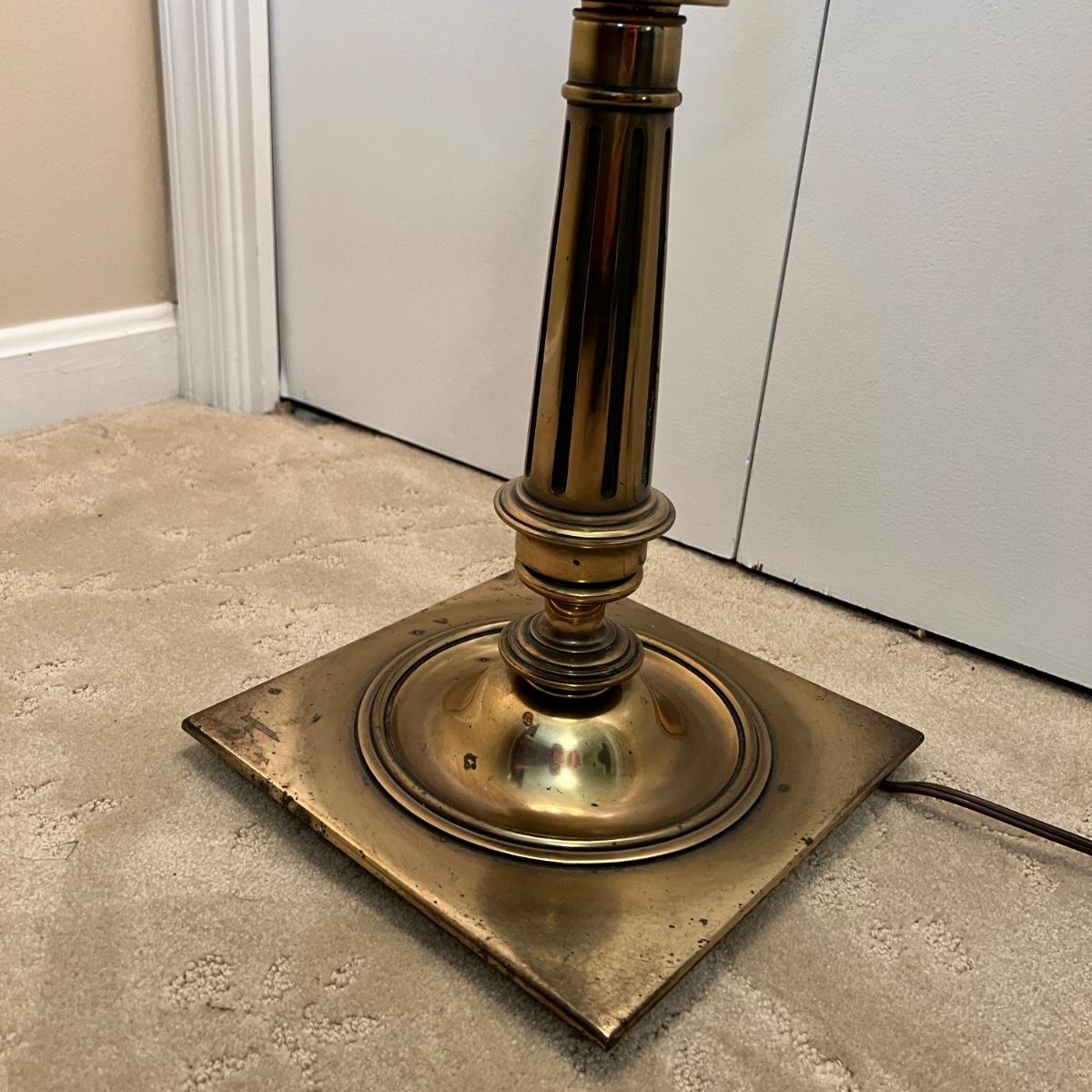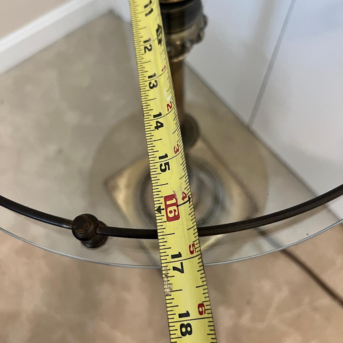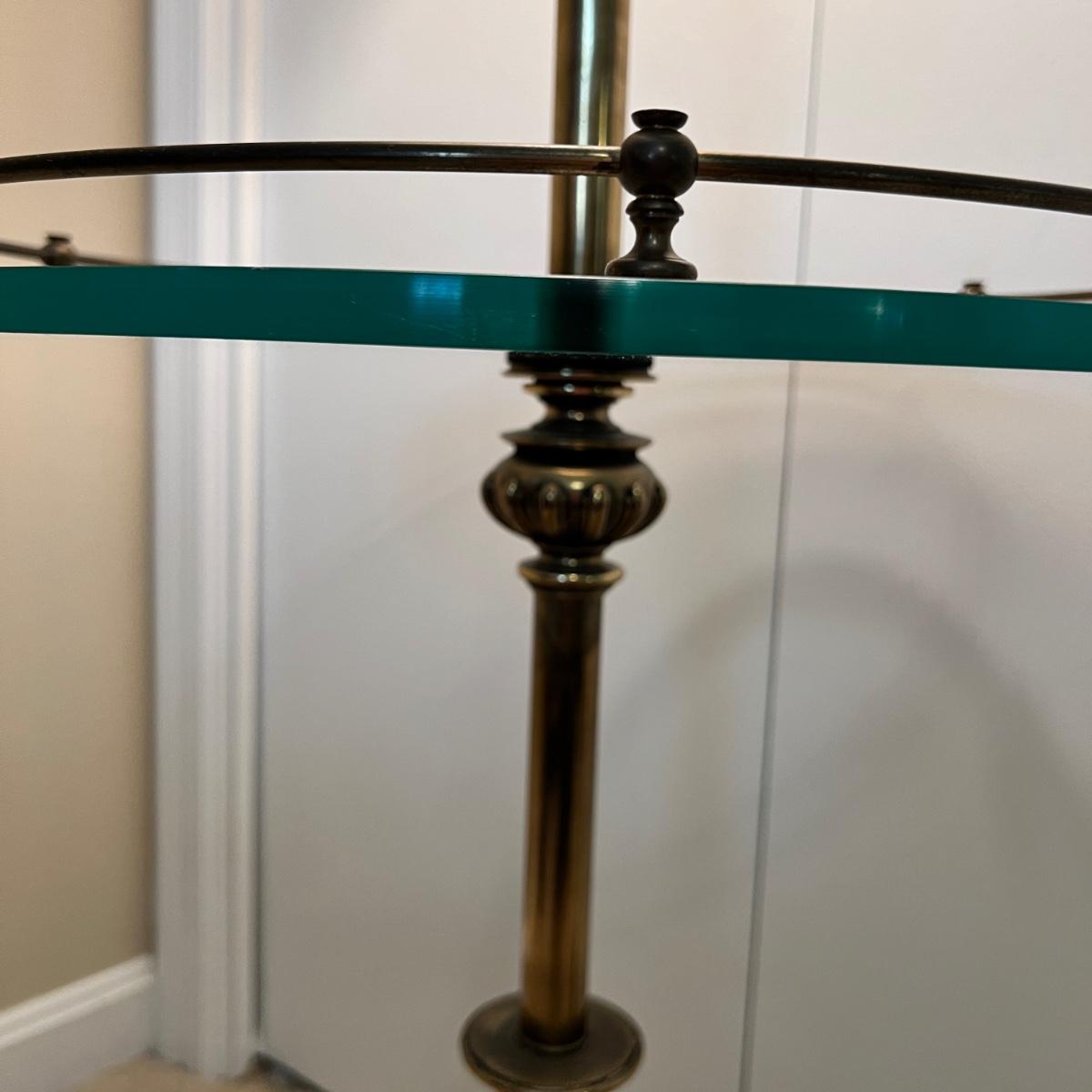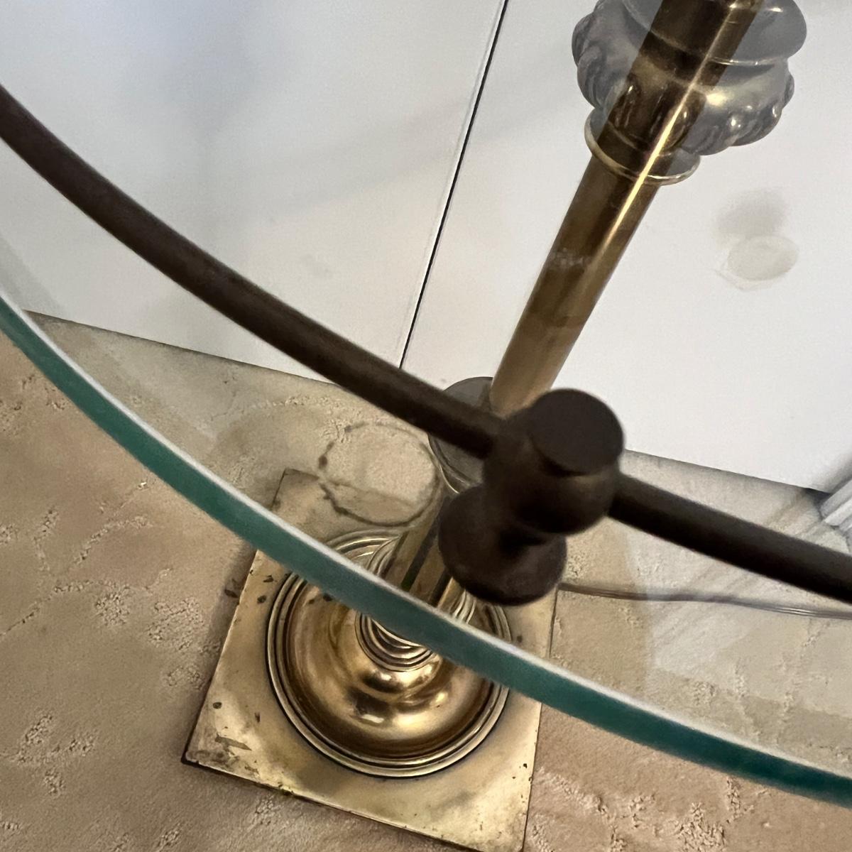 Brass floor lamp with round glass table. One of the pieces of hardware that hold the table guard moves as shown in pic 7 and 8. Otherwise great condition!