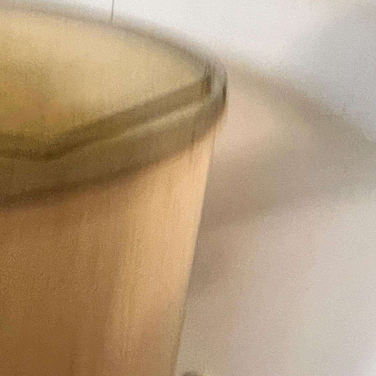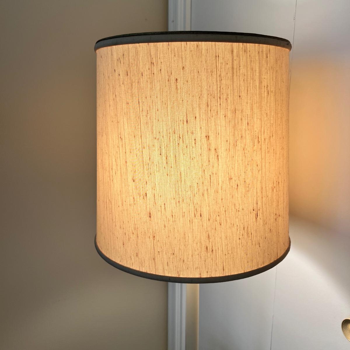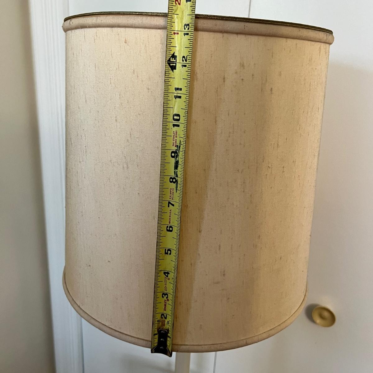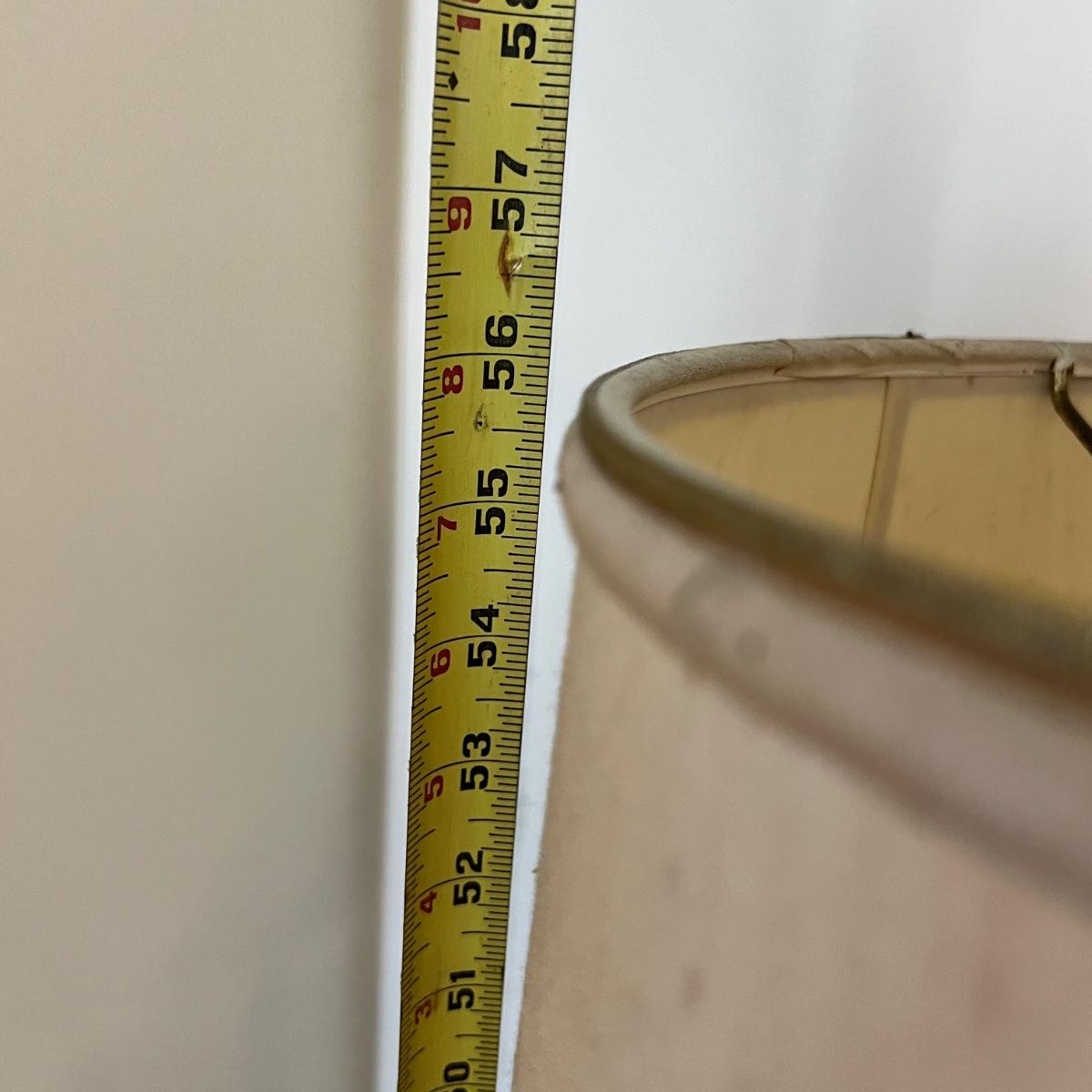 Brass floor lamp with round glass table. One of the pieces of hardware that hold the table guard moves as shown in pic 7 and 8. Otherwise great condition!