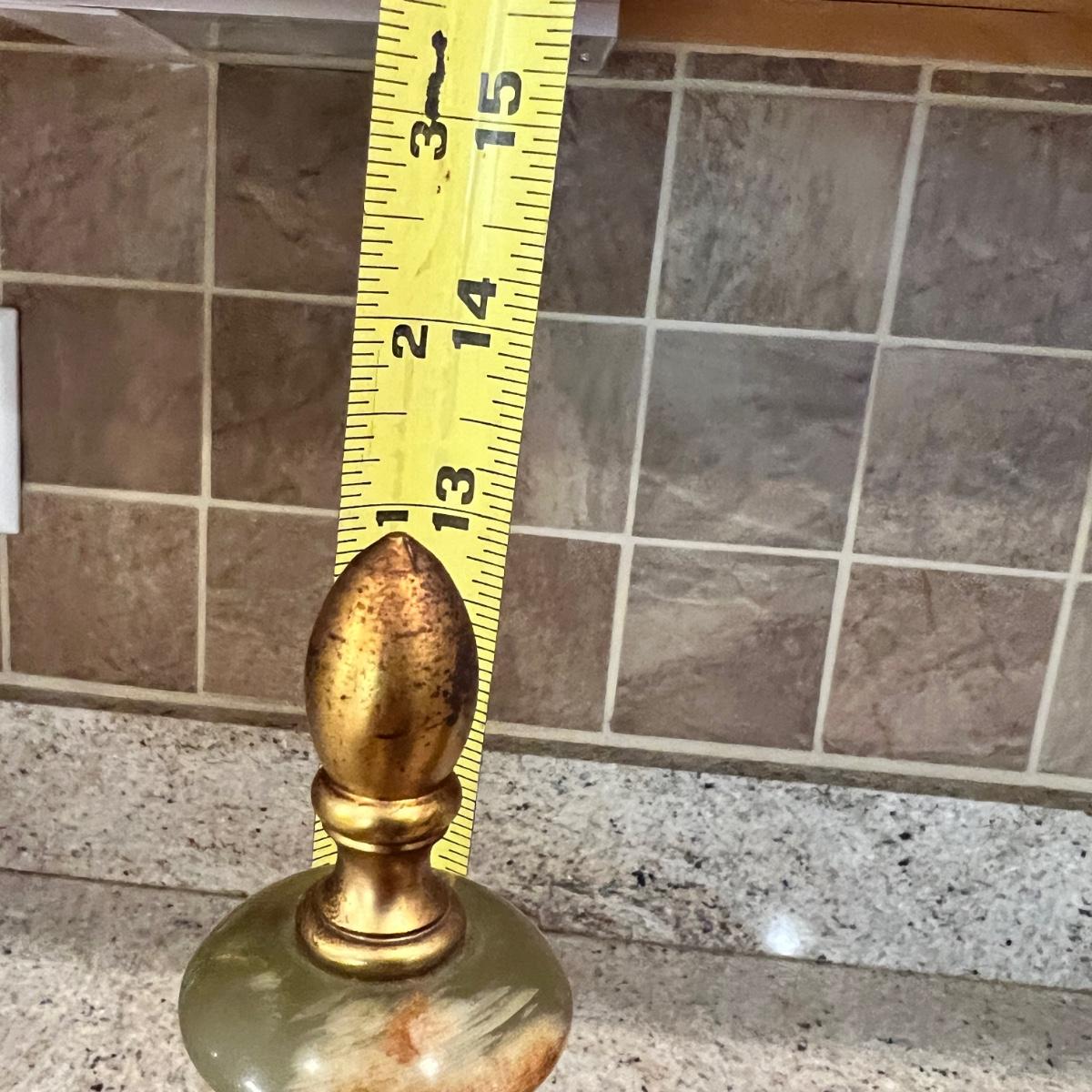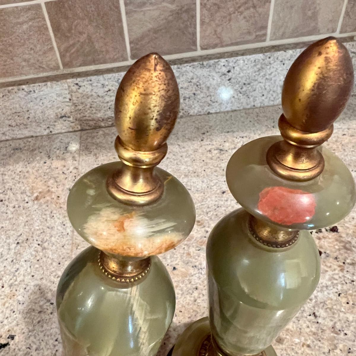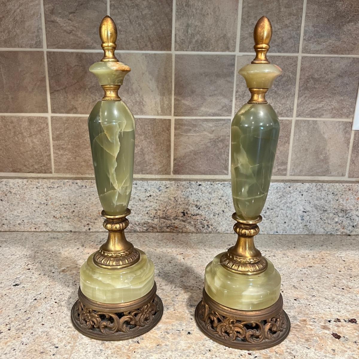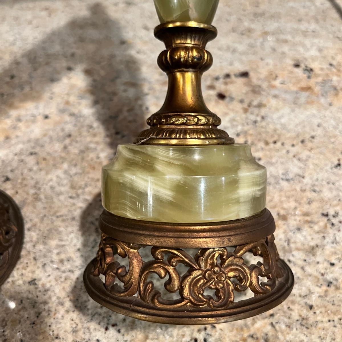 2 green onyx and gilt metal urns that would look like lovely decorative pieces on a mantle! No chips or cracks seen to the naked eye.