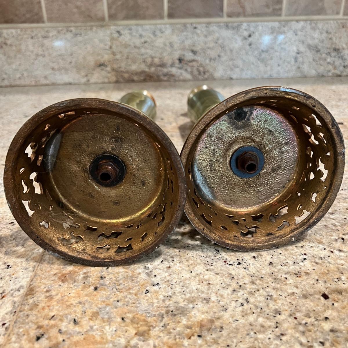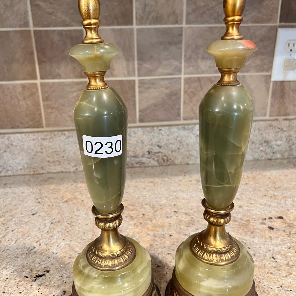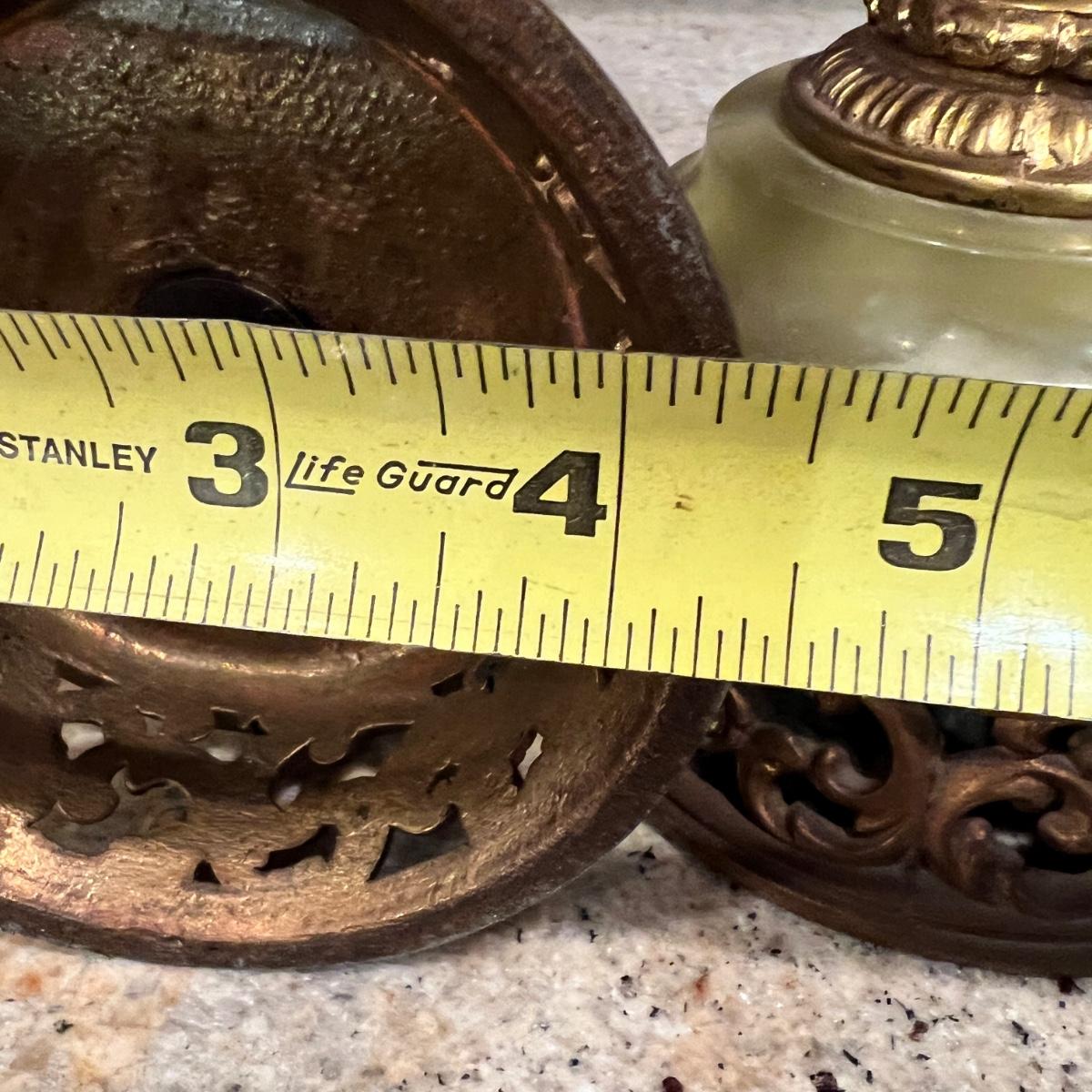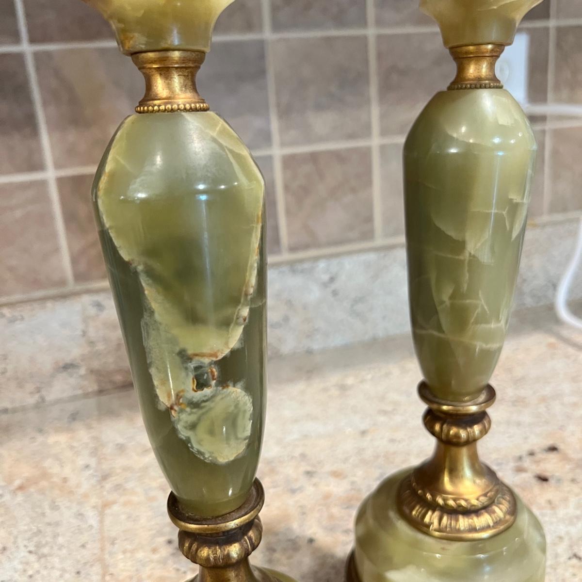 2 green onyx and gilt metal urns that would look like lovely decorative pieces on a mantle! No chips or cracks seen to the naked eye.