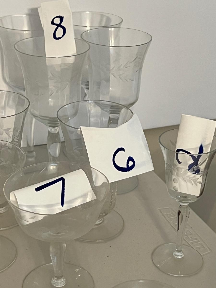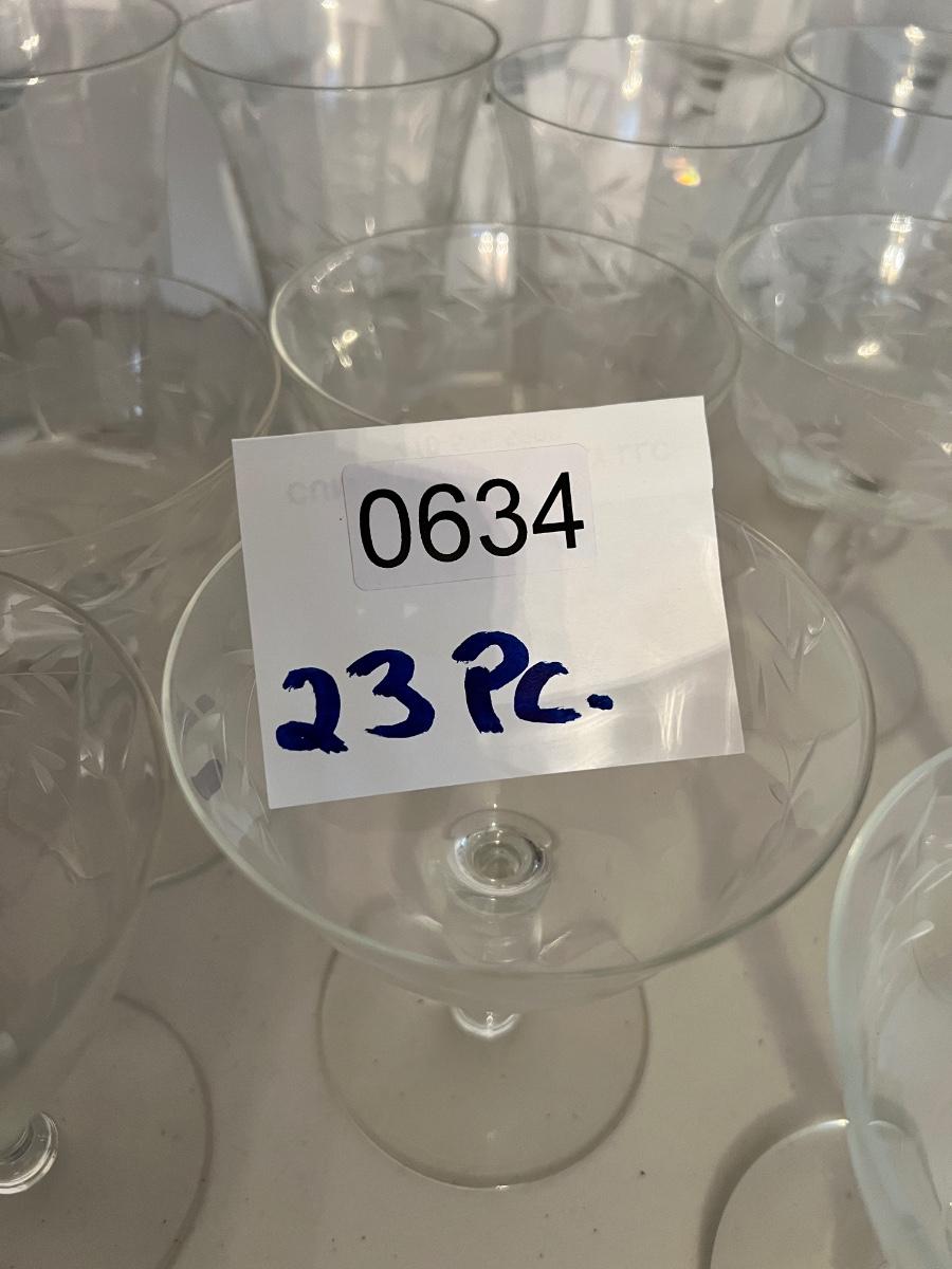 Very pretty high quality drinkware set with cut glass floral pattern. Lot includes 8 large wine glasses, 6 small wine glasses, 7 champagne glasses and 2 cordial glasses.