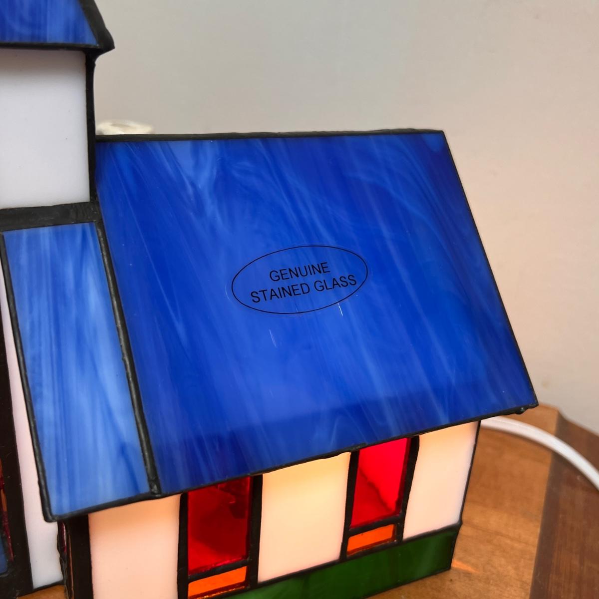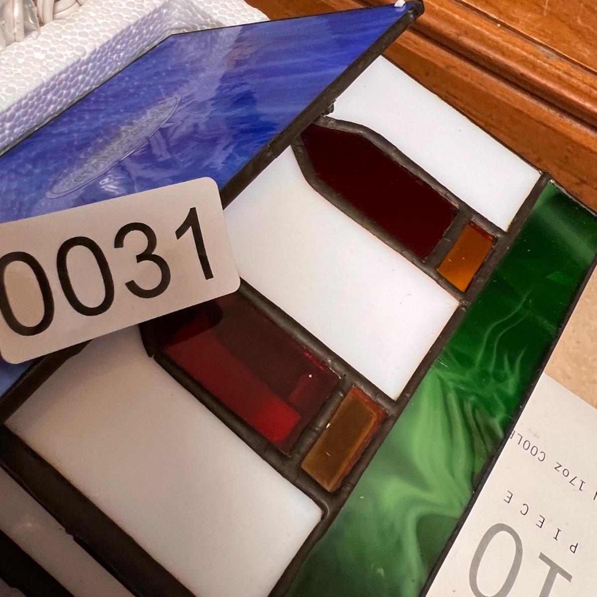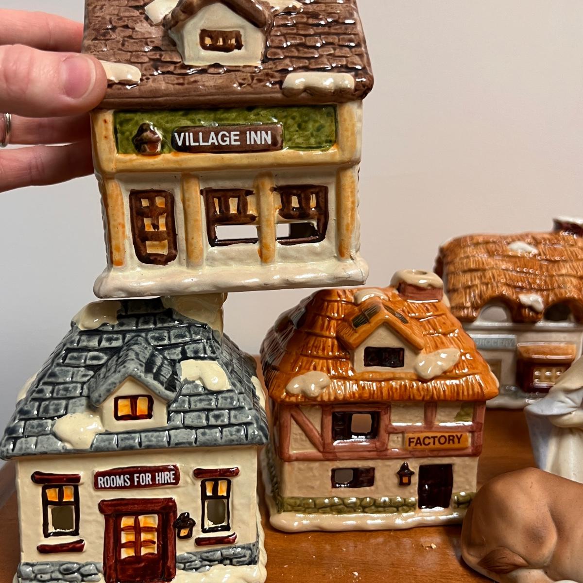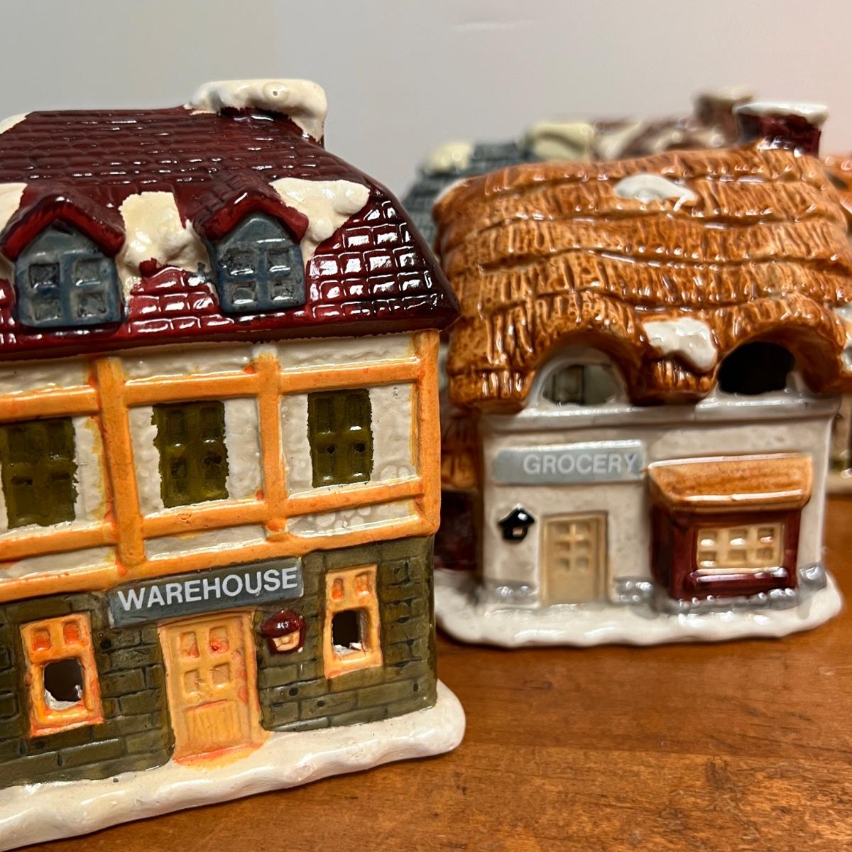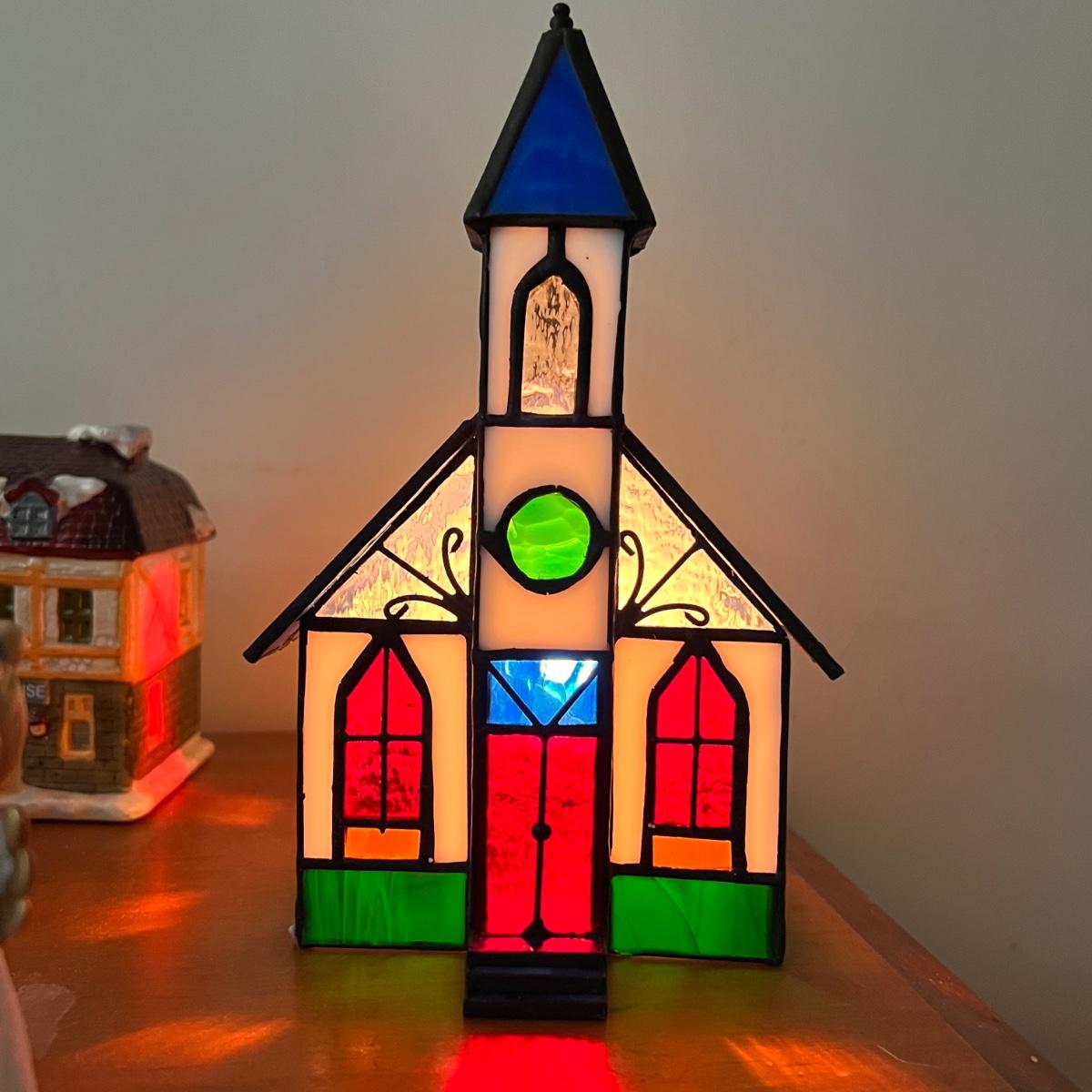 5 Dickens Village ceramic candle holders, 2 Lefton angle figurines, new light up stained glass church, porcelain nativity scene.
