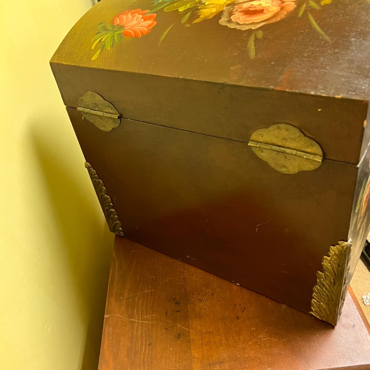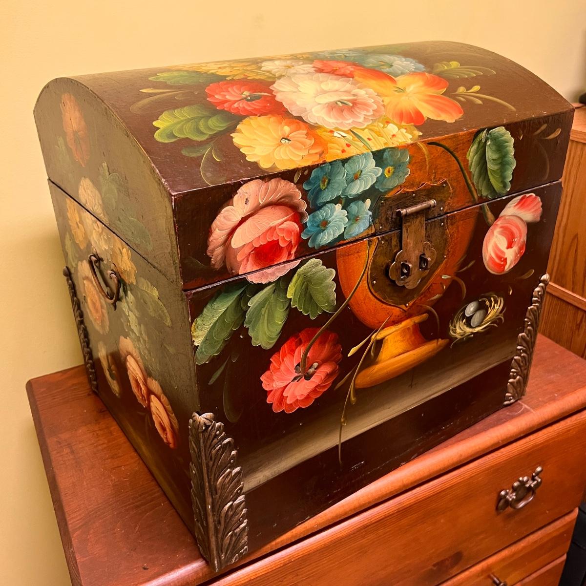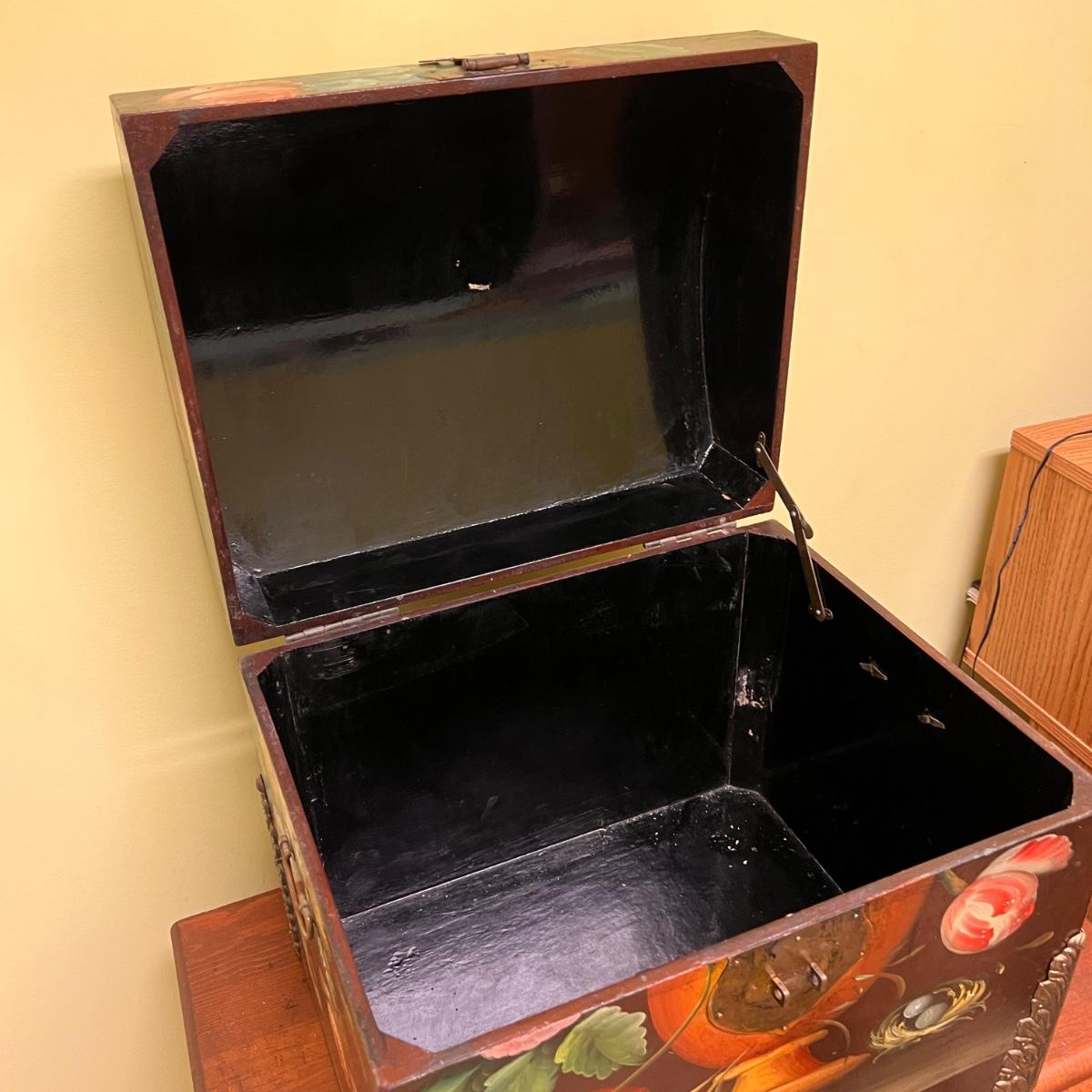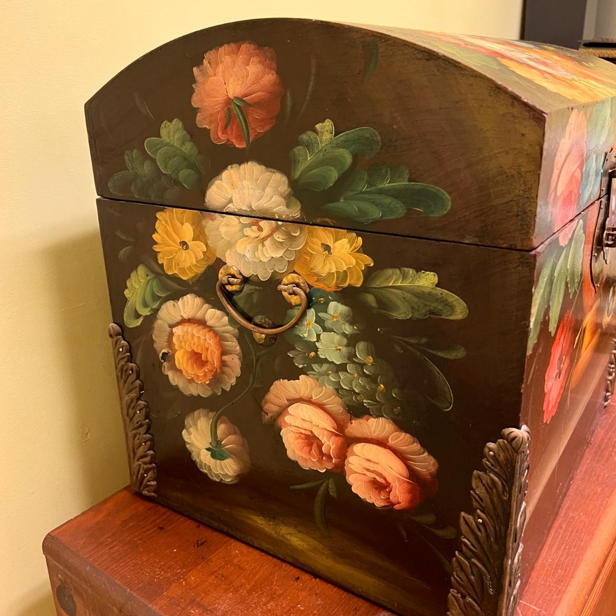 Vintage Wooden Chest With Hand Painted Floral Design Metal Hardware