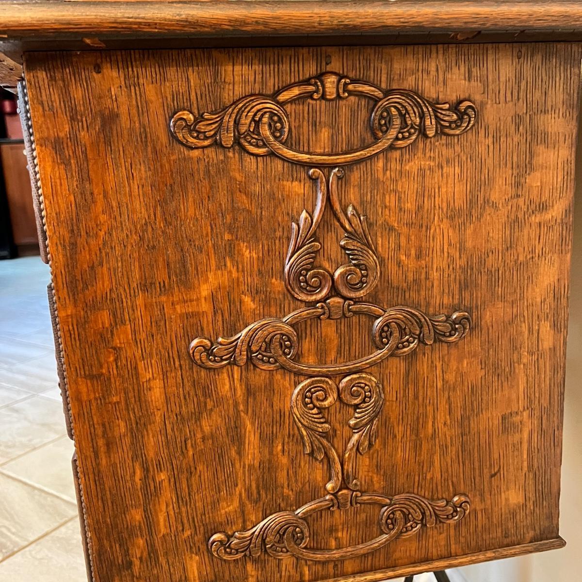 6 side drawers, great ornate details, top opens but there is not a sewing machine. Comes with sewing notions in the drawers.