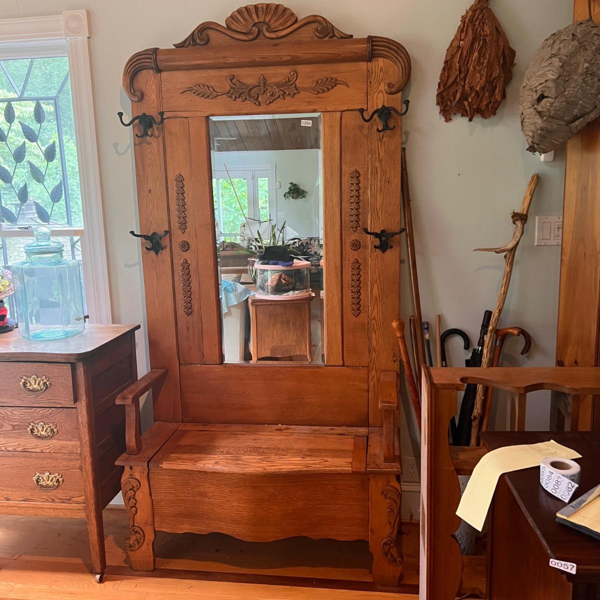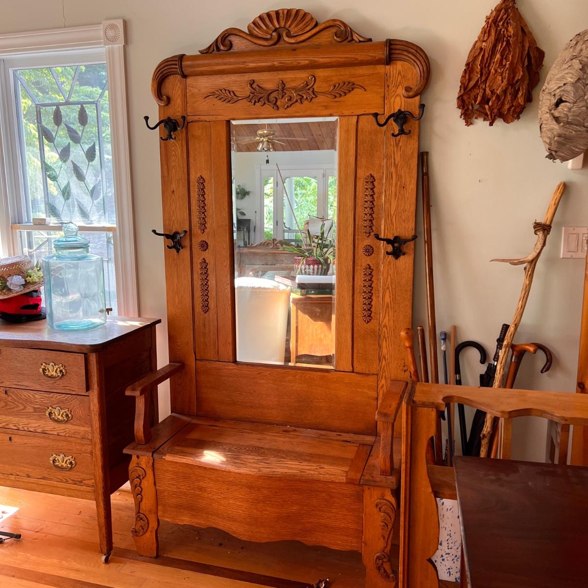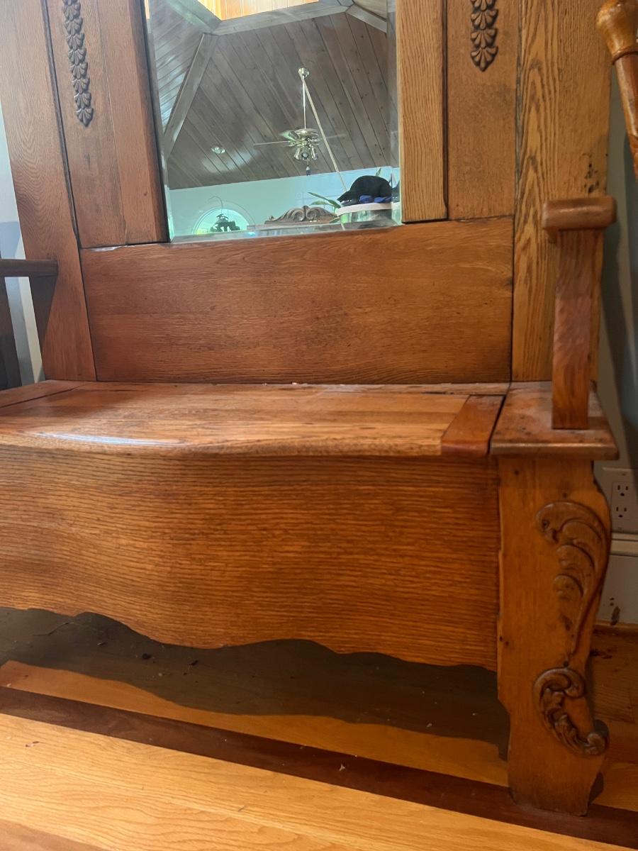 Gorgeous Antique Large Oak Hall Tree Bench w/ Mirror 41wx17dx83h