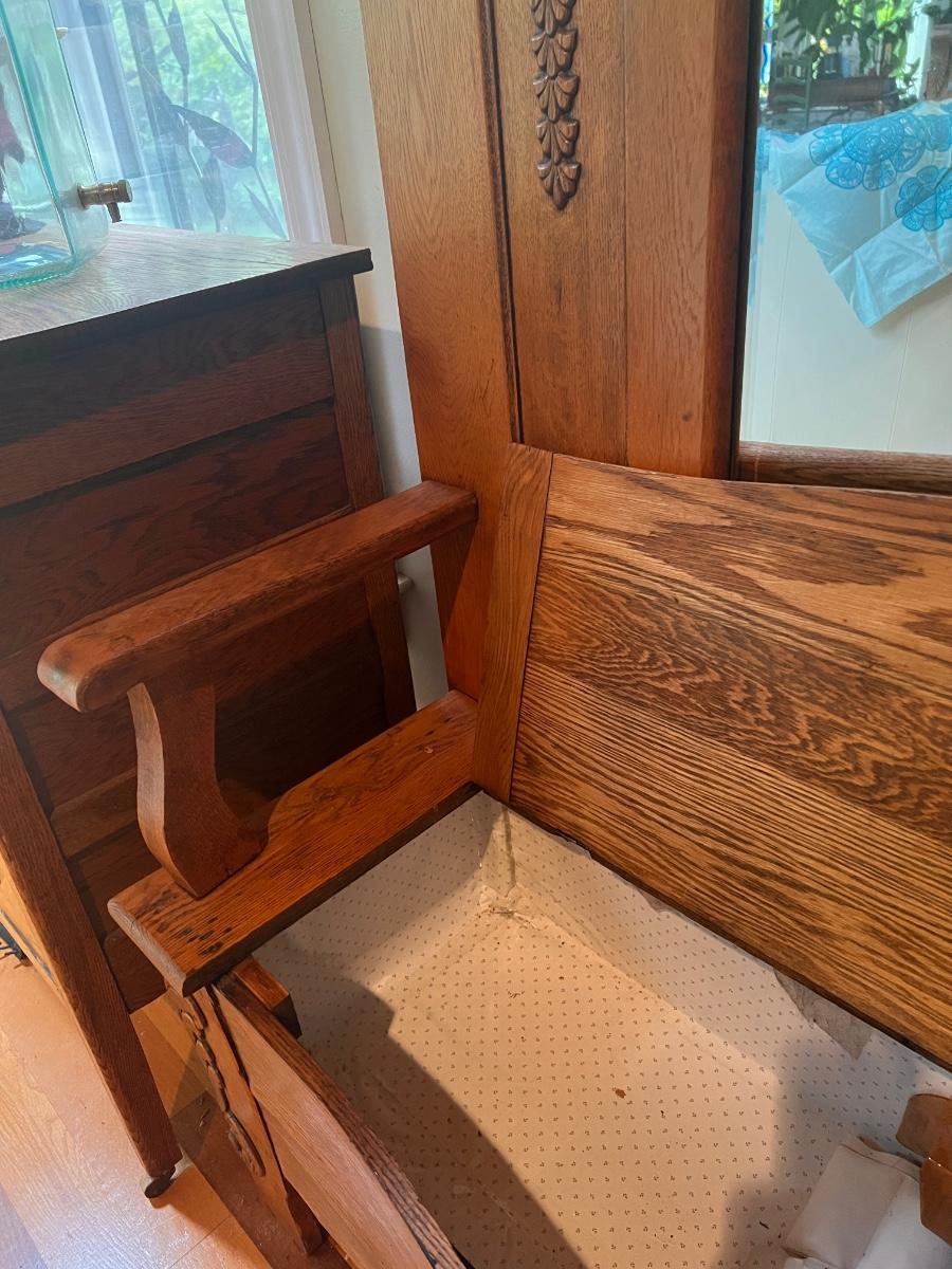 Seat lifts for storage. In great condition. Beautiful carved wood details. Large and heavy - be sure to bring someone to help you at pick up.