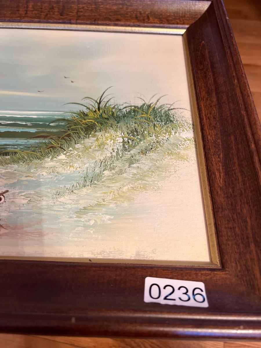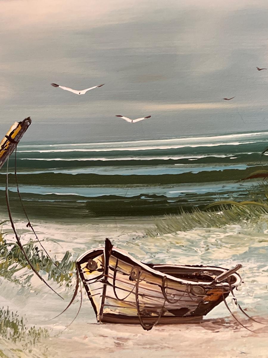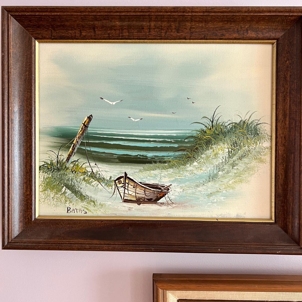 Beach seaside landscape oil painting signed Batas in wood and linen frame measuring 19"x15"