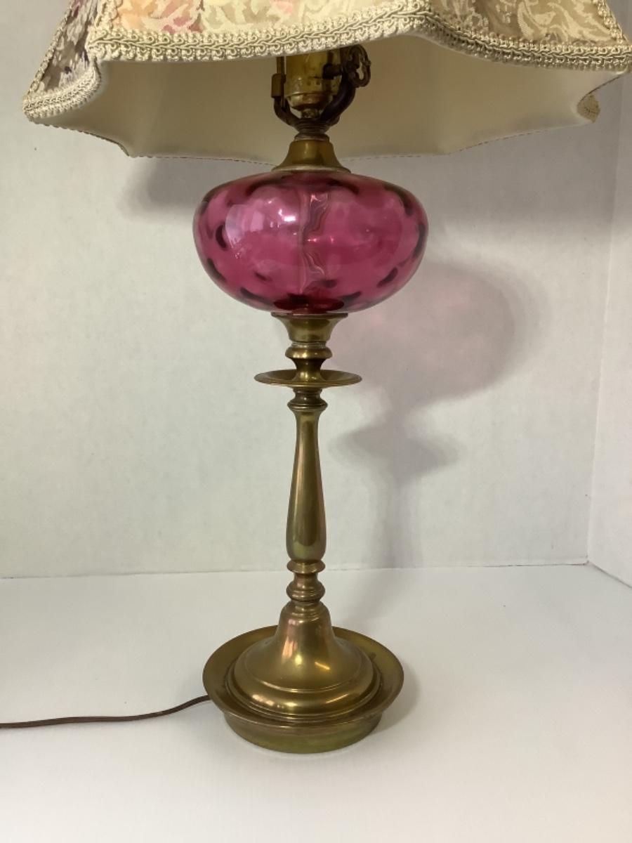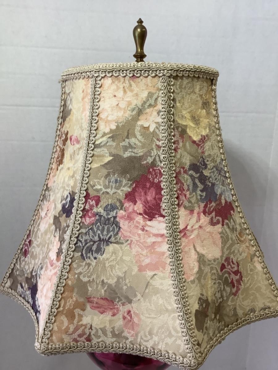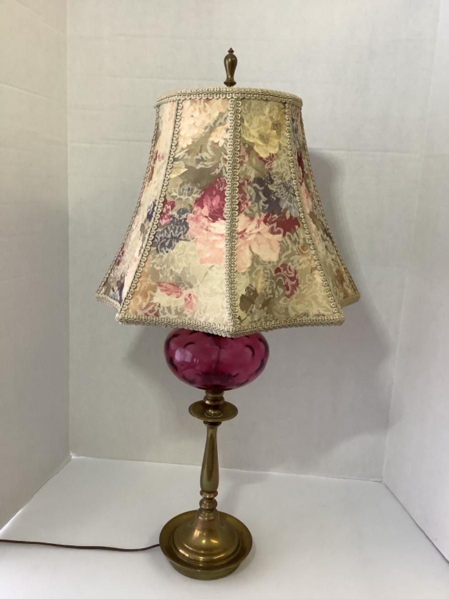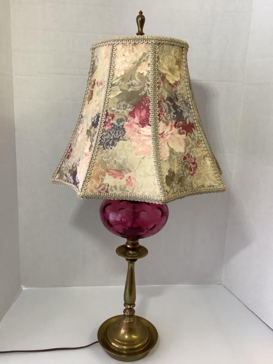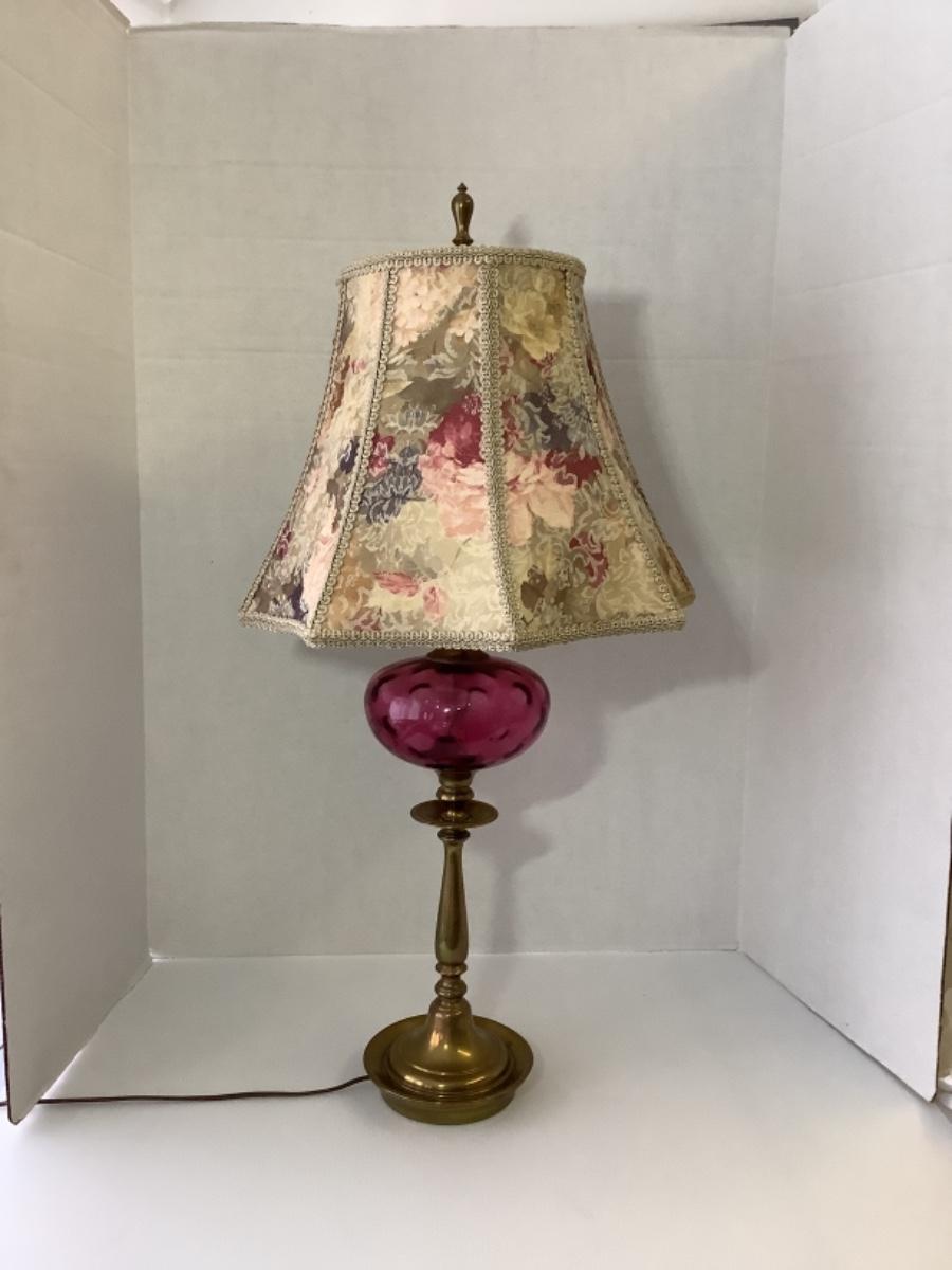 Cranberry Glass / Brass Candlestick Lamp with Floral Fabric Shade