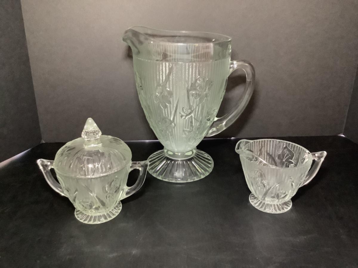 C - 137. Vintage Jeanette Glass - Iris & Herringbone Pitcher & Cream / Sugar Set
