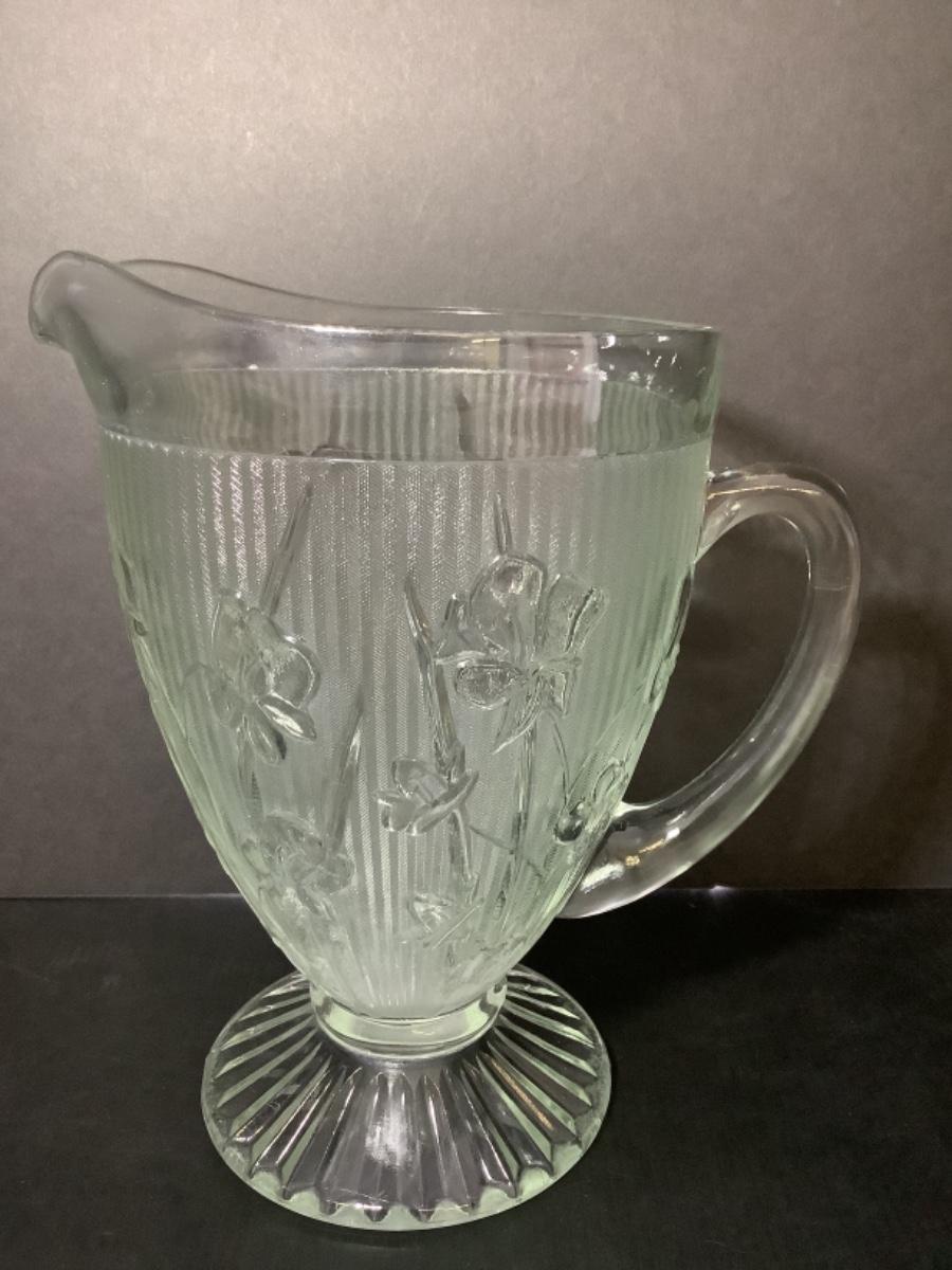 Vintage Jeanette Glass - Iris & Herringbone 56oz Jug, Clear Crystal, Depression Glass, 9” Footed Water Pitcher, Heavy Pressed Glass 1928-1932