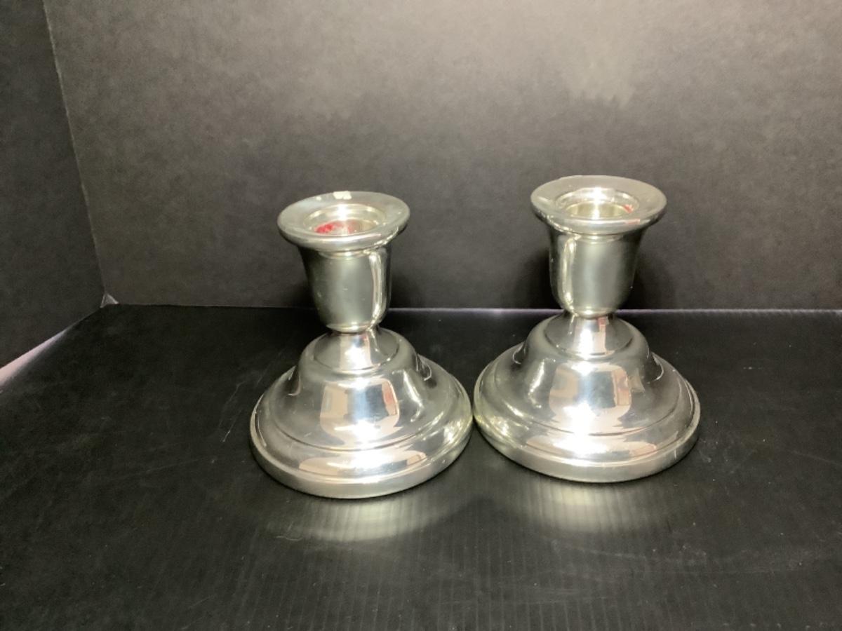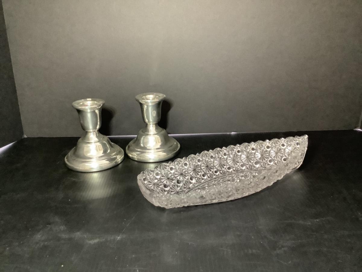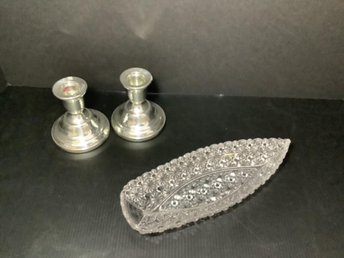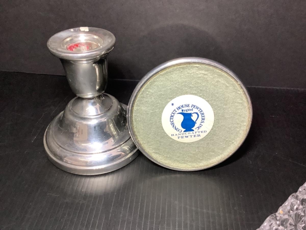 C - 139. Pair of Connecticut House Pewter Candle Holders & Boat Shaped Pressed Glass Dish