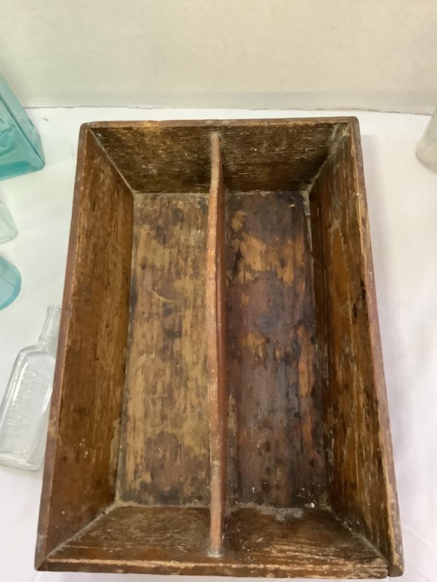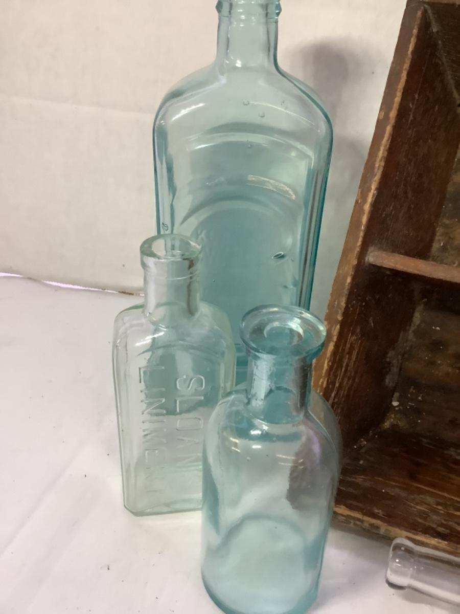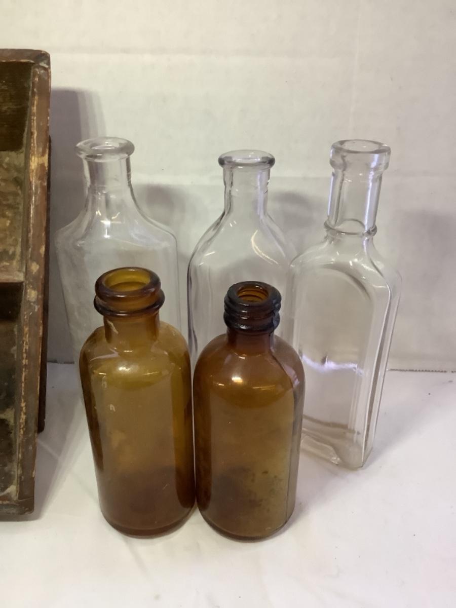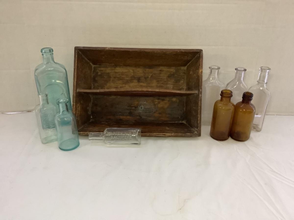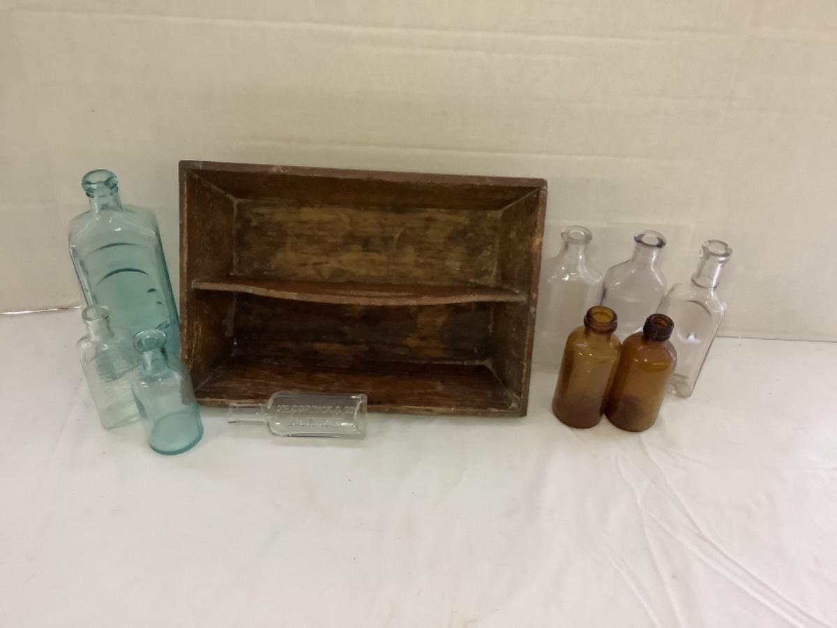 C - 182. Vintage Wooden Toolbox with Variety of Antique Bottles ( McCormick/Kilmers )