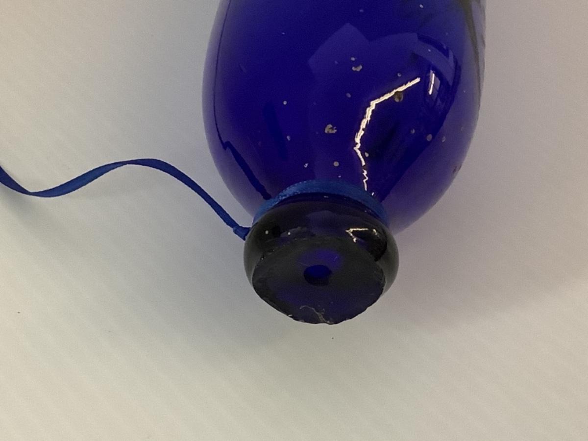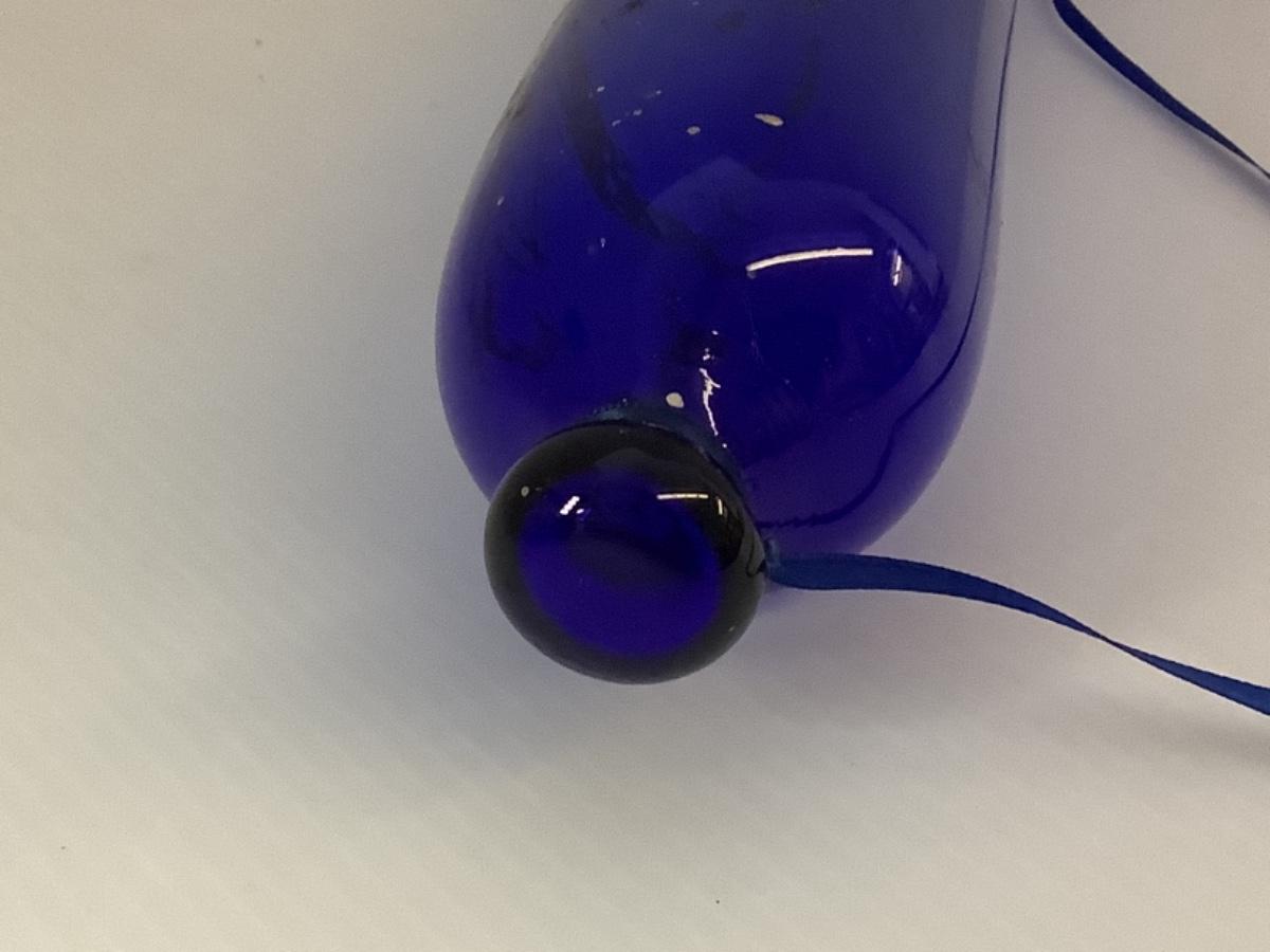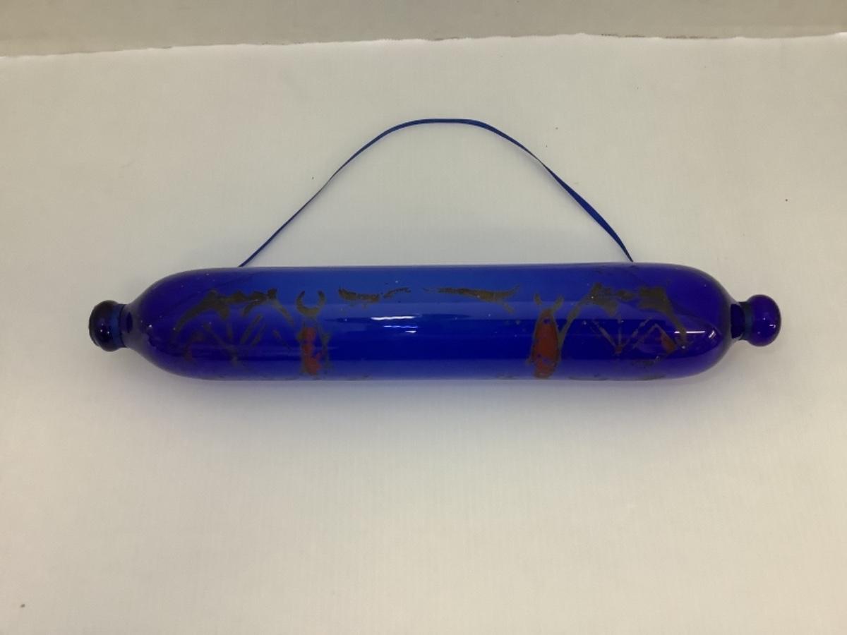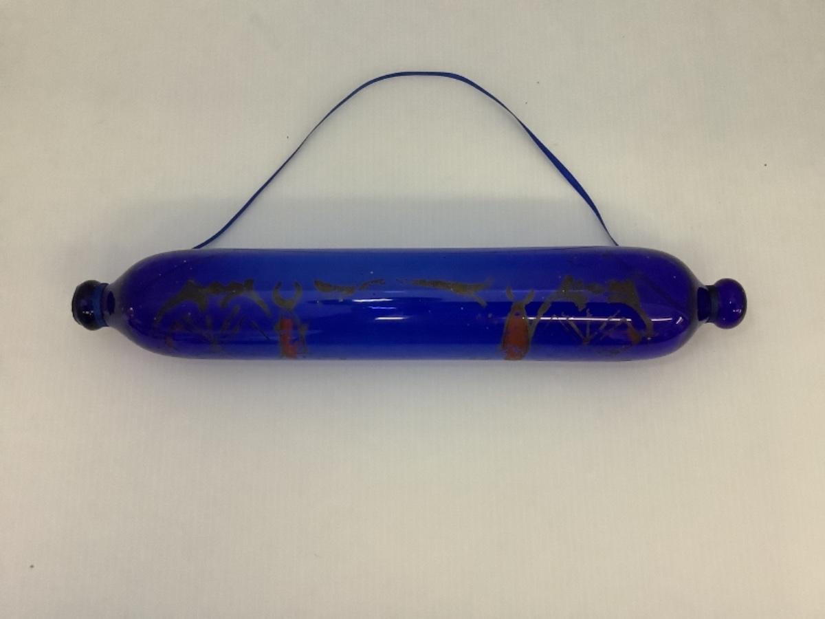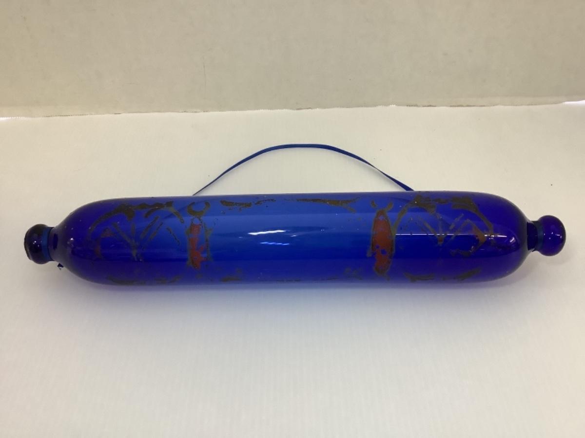 Beautiful Handblown cobalt blue Nailsea glass rolling pin of typical avoid form with knopped ends and painted flowers. Generally given as gifts by sailors to wives or girlfriends. One end of the pin always has a small hole in it, the reason for this was to fill the pin with warm water to assist in the rolling of pastry. Most of these rolling pins were made in Nailsea, Bristol.