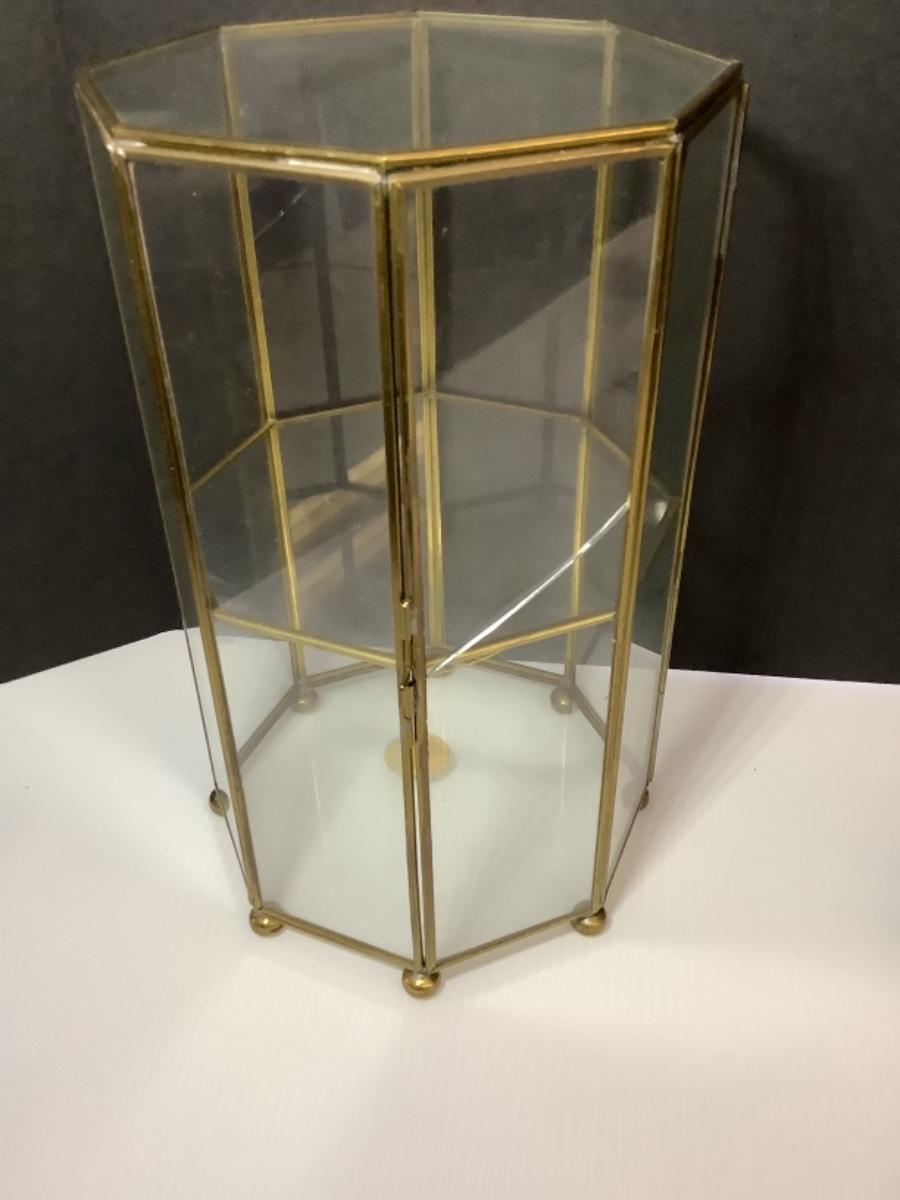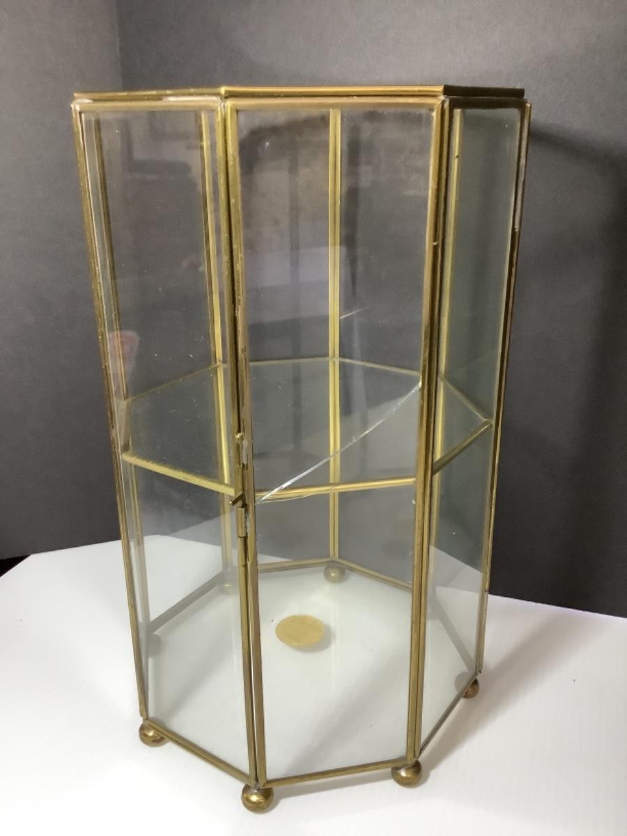 Octagon Glass Display Case has a single shelf & a single door ( one of the door panels of glass is cracked, see picture )