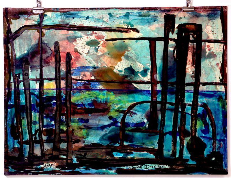Original painting signed by artist Vincent Drennan. Medium: Watercolor/Goach, Support: Paper, Artist: Vincent Drennan, Signature: Yes, lower center, dated lower left, Approximate Work size: 24" x 18", Date of creation: 1955, Country of Origin: American, Condition: good/very good - as seen on pictures.