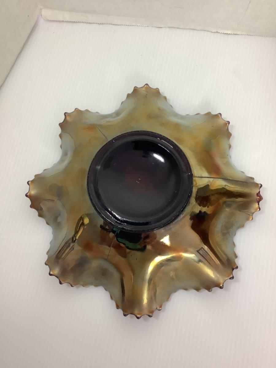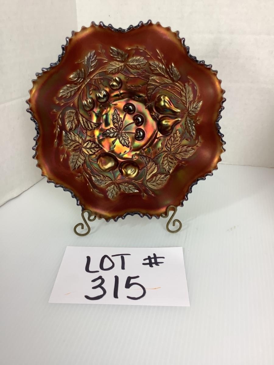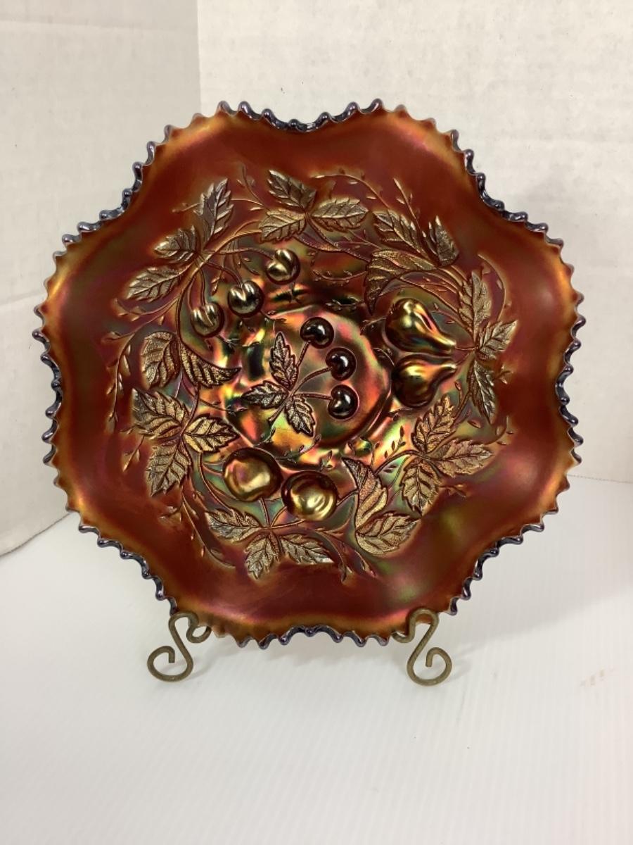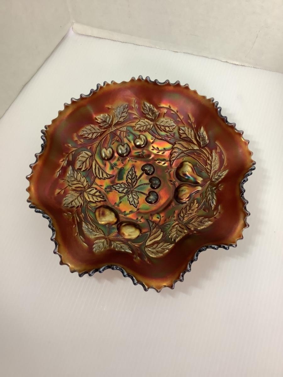 C - 315 Vintage Northwood Three Fruits Carnival Glass Ruffled Bowl