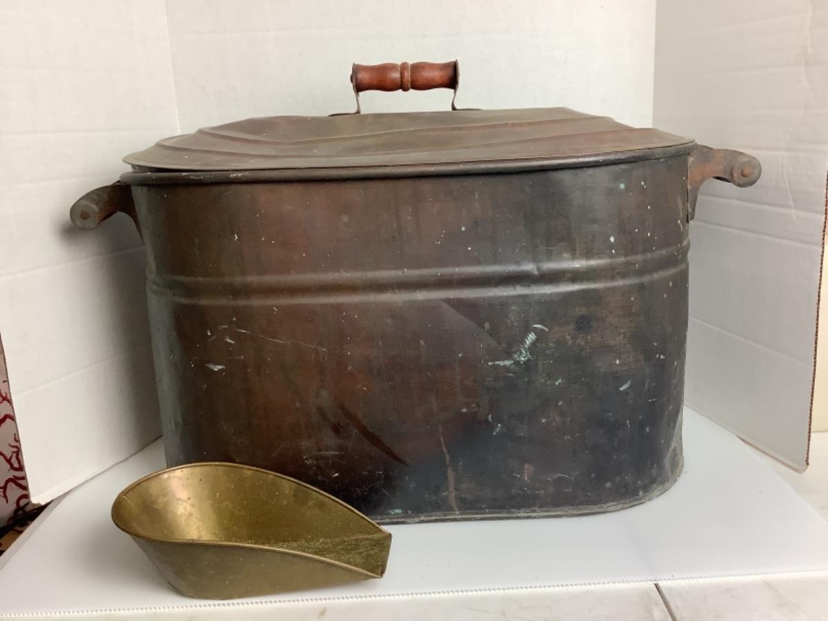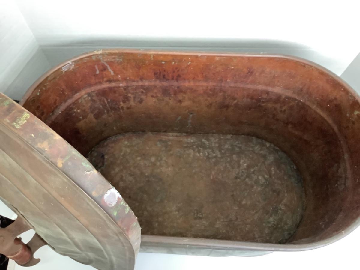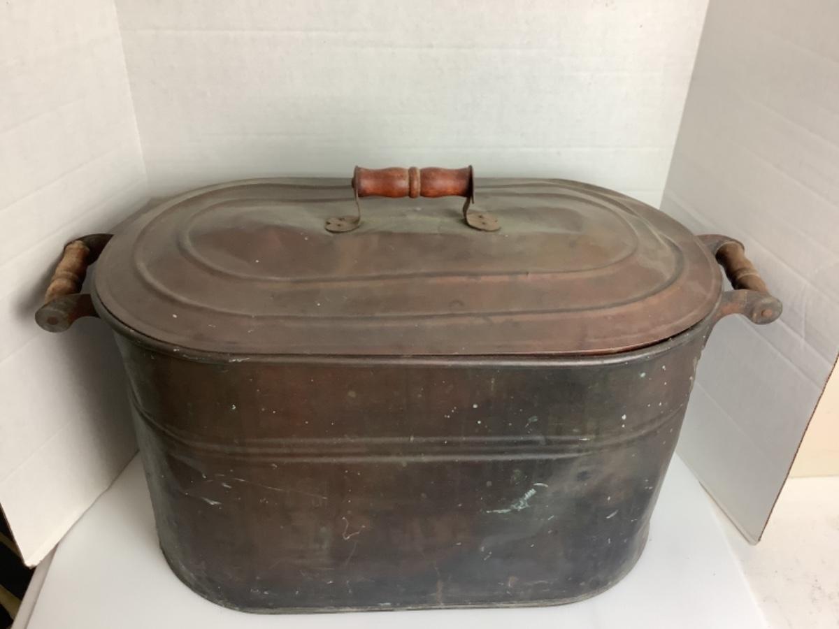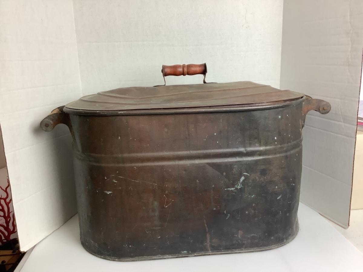 C - 327 Antique Double Handled Copper Broiler Wash Tub with Lid & Brass Scoop