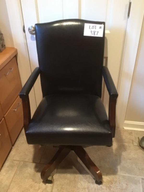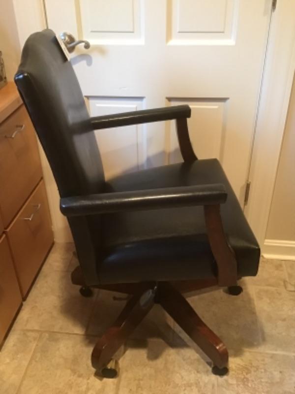 Ashley Furniture Office / Desk Adjustable Arm Office Chair, Leather with Wood arms and base, on wheels -