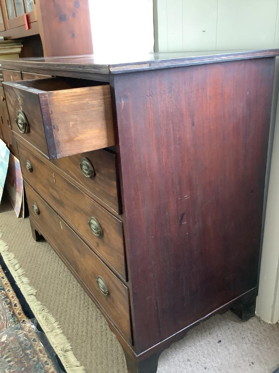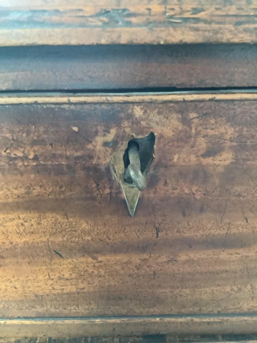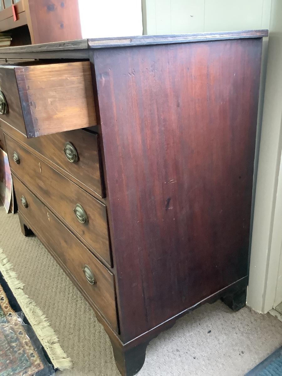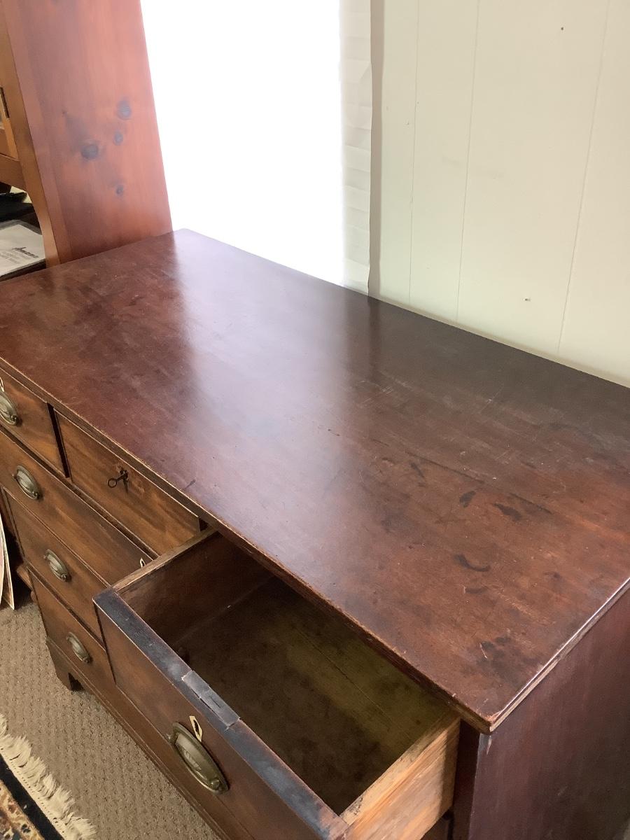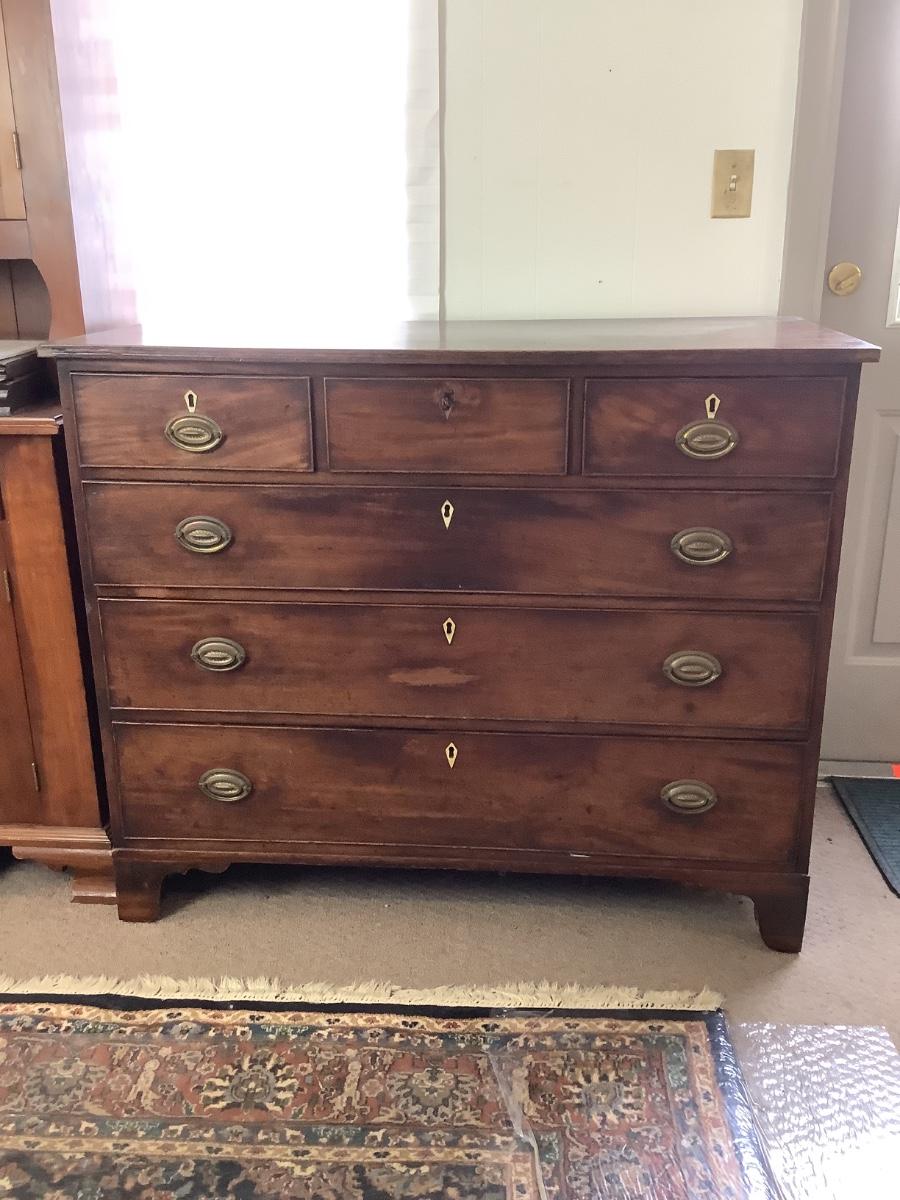 Antique Mahogany Six Drawer Dresser, solid board ends, original knobs cut off ( see picture ) Bone Diamond Escutcheon (one missing on top center drawer) with banding around drawer and inlay around top edge.