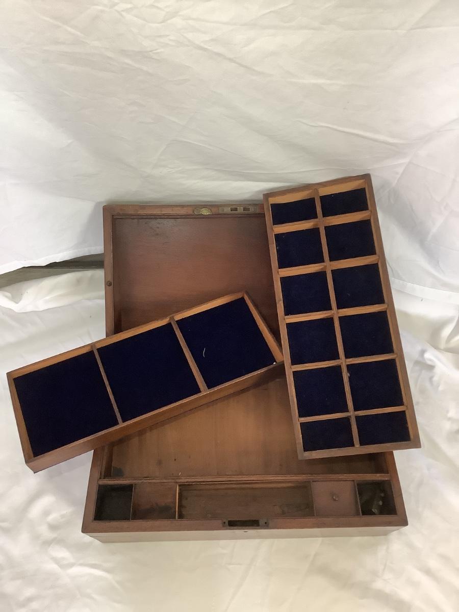 Antique Mahogany Chest Desk with brass decorative pieces and name plate. Two removable trays inside, and a single organizer drawer on the side bottom. One felt pad is missing.