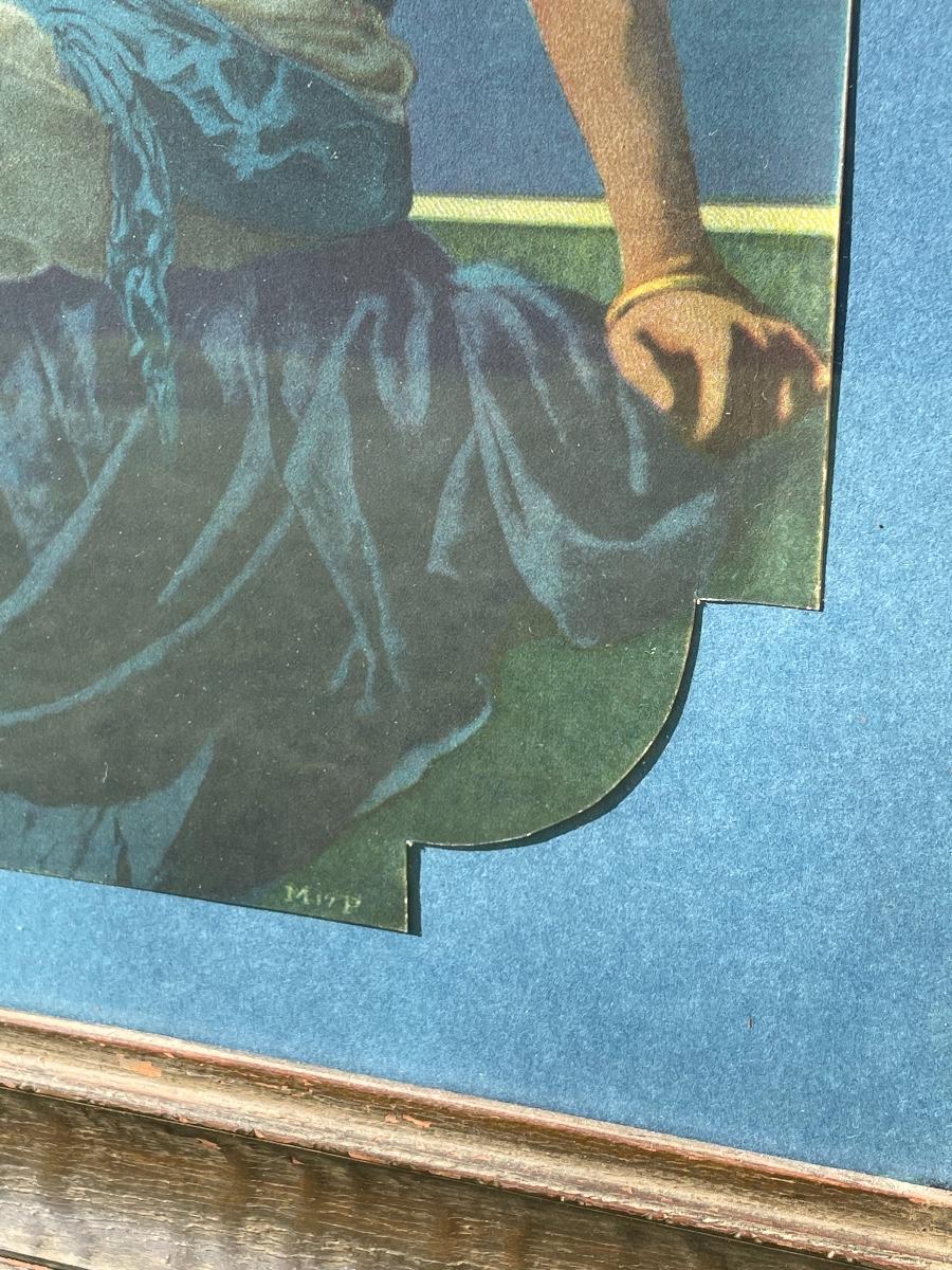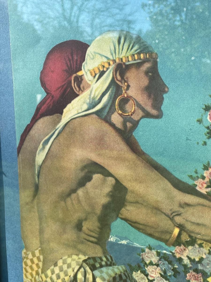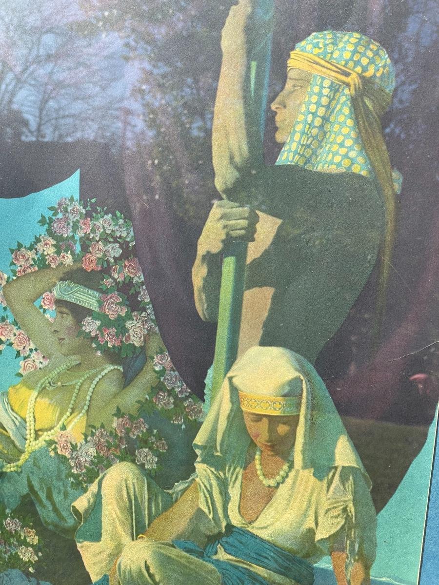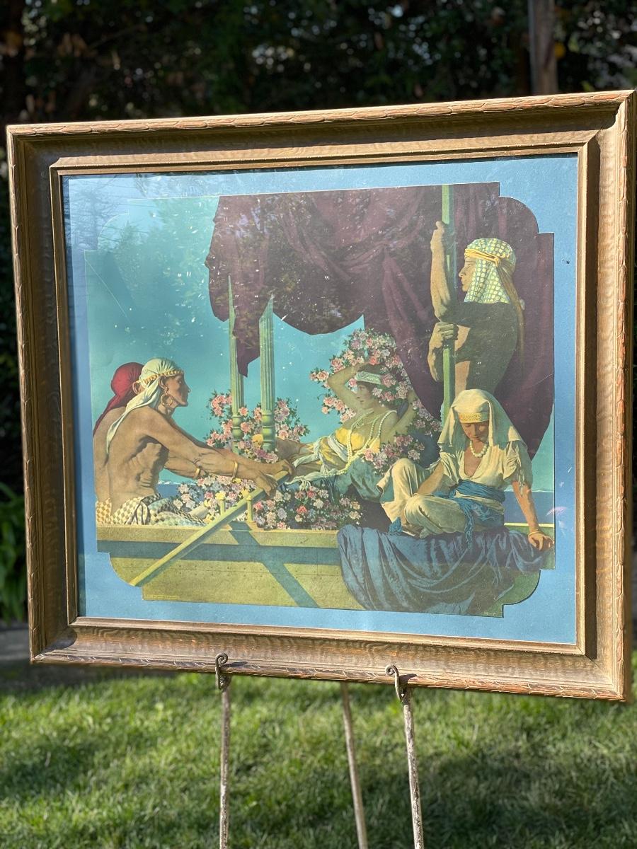 This is a large size (circa 191), vibrant Art Deco fine art print in a wooden frame. This is one of the most desirable Maxfield Parrish prints measuring 24.5" height x 28" length and framed size is 33" height x 36" length. With deep strong colors, this fine "Cleopatra" print has intense coloring of rich cobalt blue in the night sky, a color made famous by Maxfield Parrish and called "Parrish Blue". Also features desired signature Parrish hues and tones in the drapery, clothing, flowers, and distant water in the background. The corners of the print have also been cut. This piece is in fine condition overall.