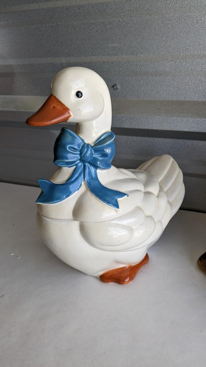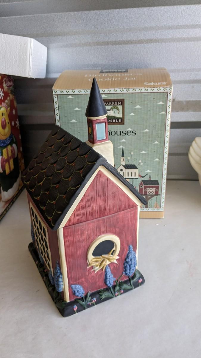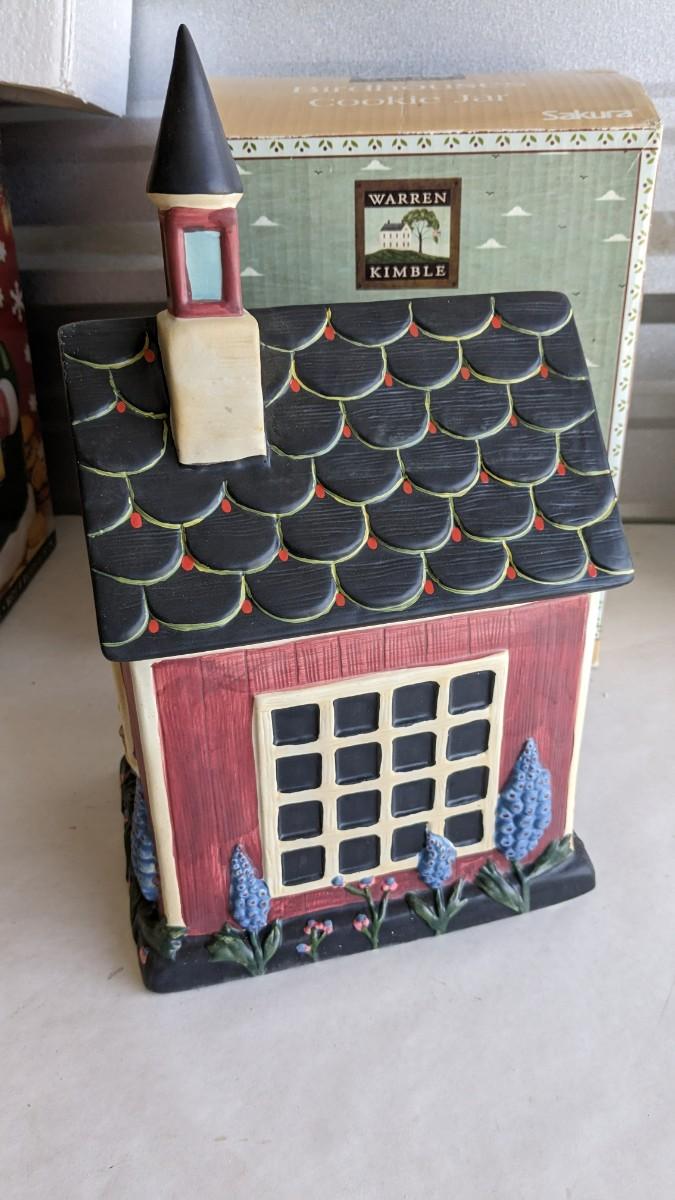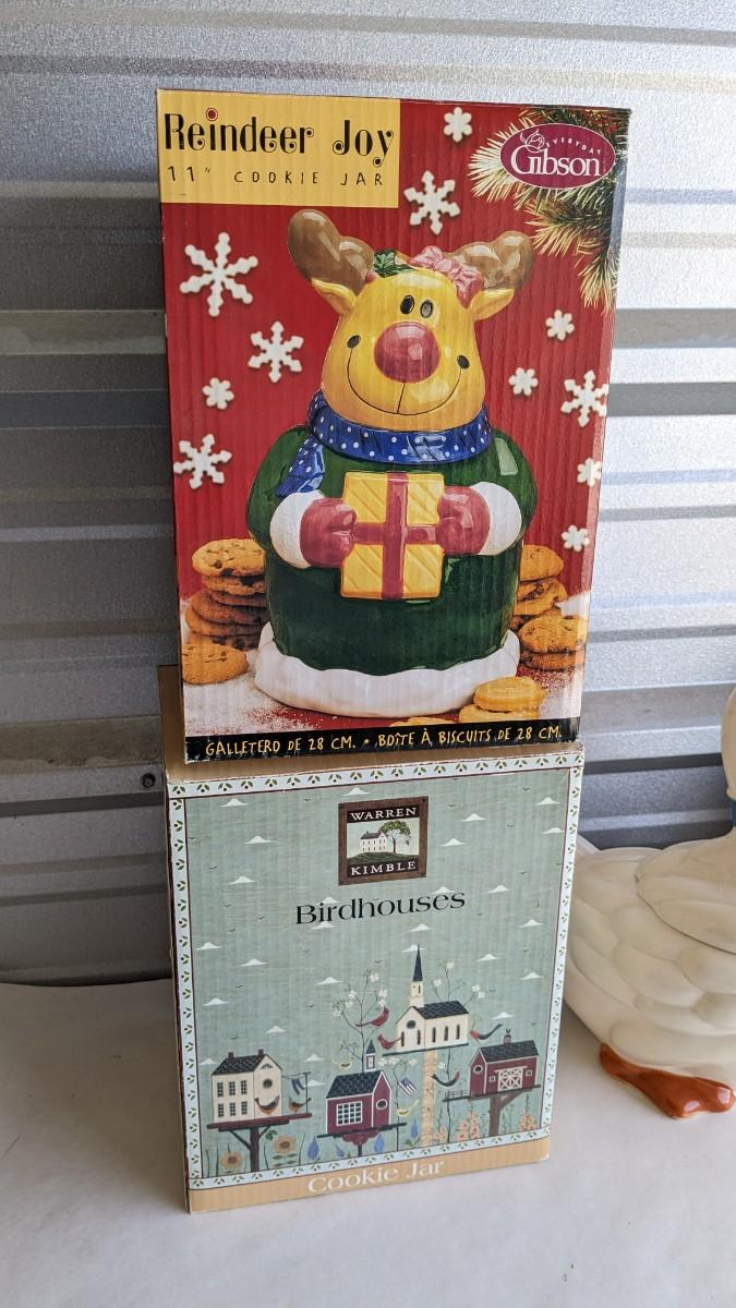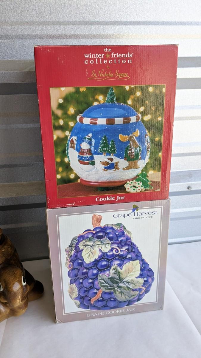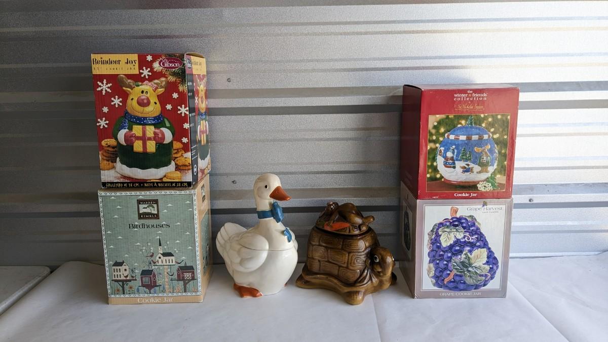 6 cookie jars. Includes Warren Kimble birdhouse, 2 christmas pieces, and grapes all in box. As well as the quintessential kitchen goose and a ridiculously charing turtle and hare, note turtle has small chip on inner lip that does not affect lid sitting on top. Some really great pieces for any collector. No shipping. 2616