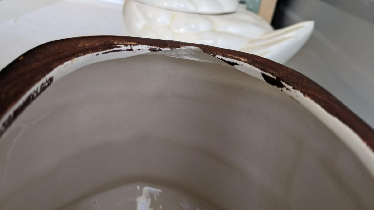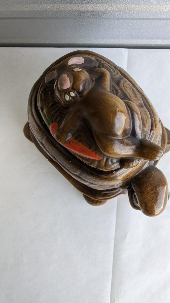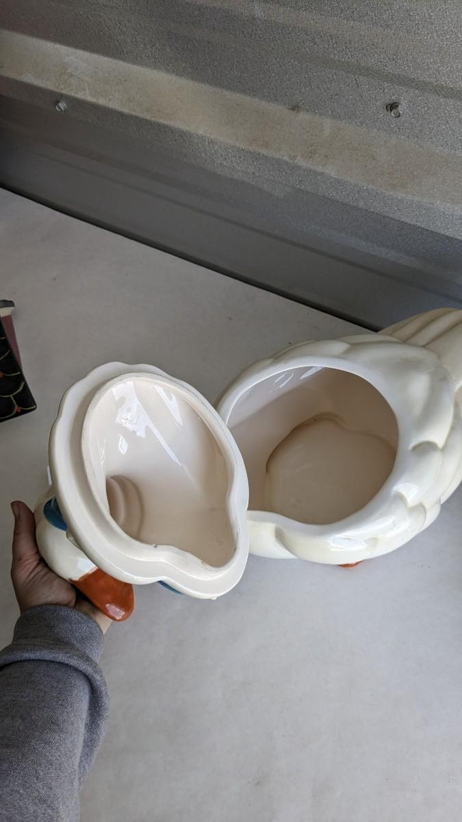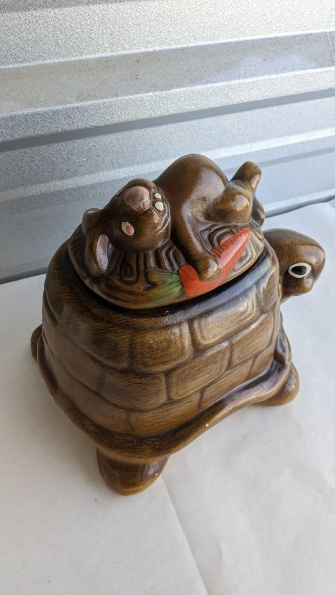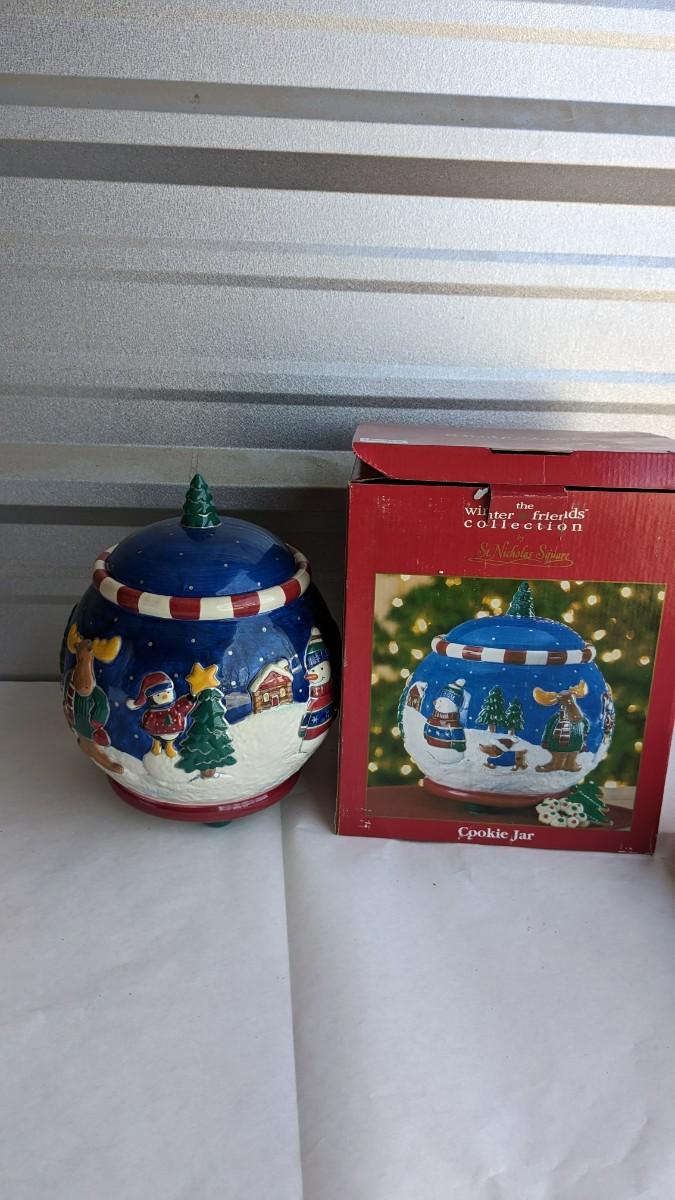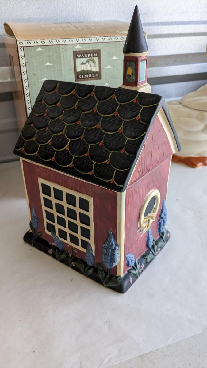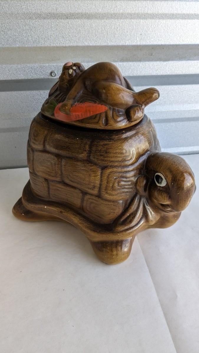 6 cookie jars. Includes Warren Kimble birdhouse, 2 christmas pieces, and grapes all in box. As well as the quintessential kitchen goose and a ridiculously charing turtle and hare, note turtle has small chip on inner lip that does not affect lid sitting on top. Some really great pieces for any collector. No shipping. 2616