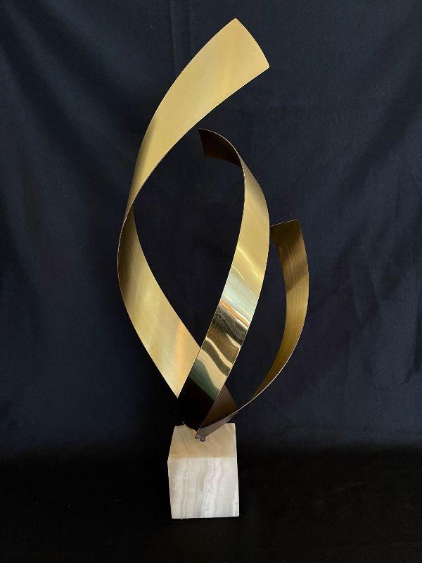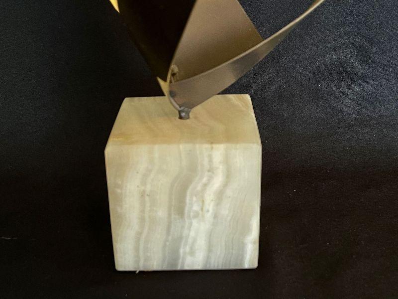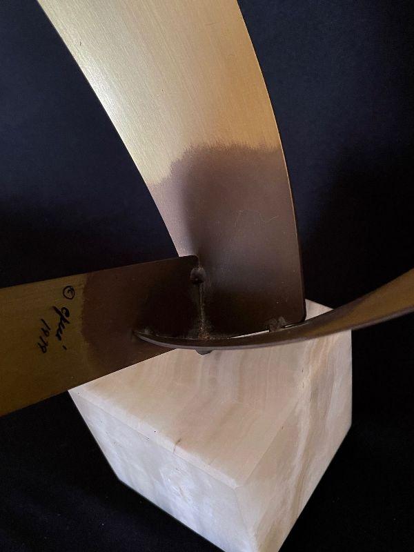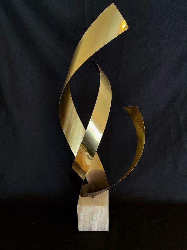 The subject item for auction sale is an original assembled brass sculpture of brass strips poised vertically, resembling a torch flame. The metal sculpture is mounted onto a figured alabaster base, signed and dated in ink. All original and in fine presentation condition.