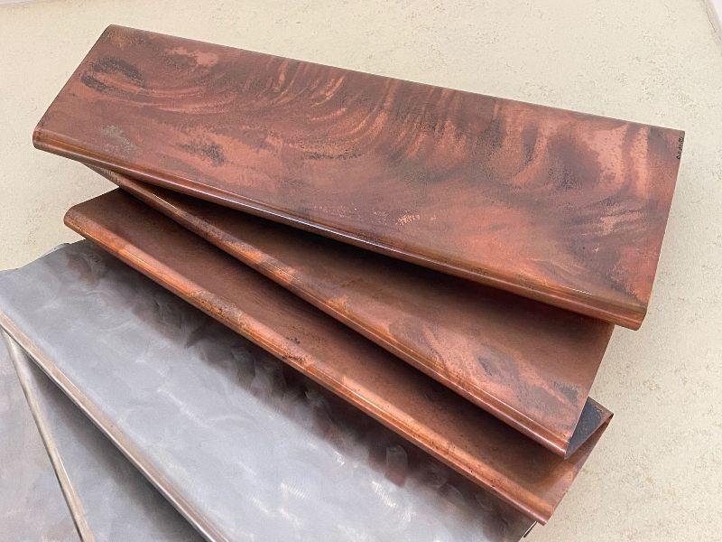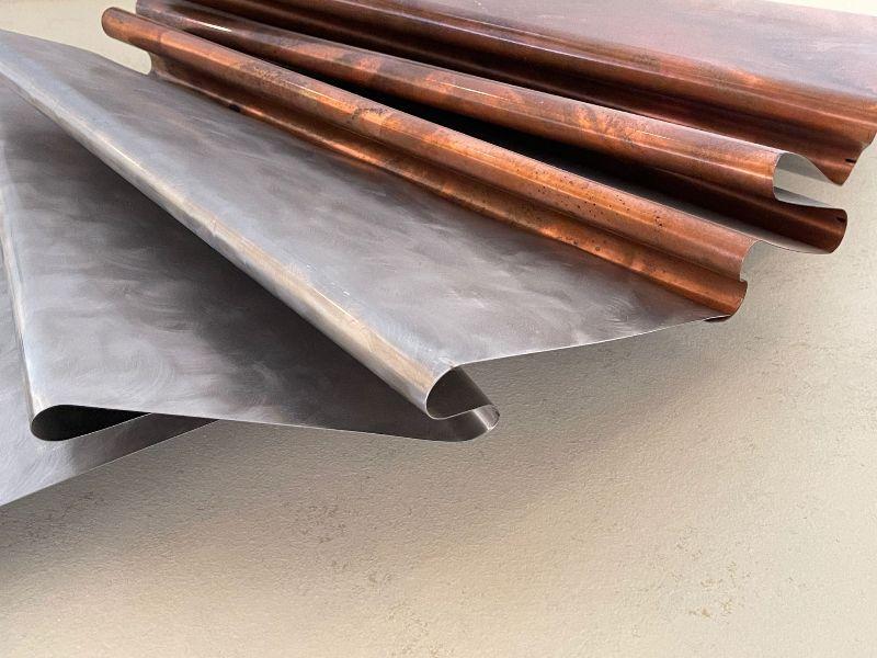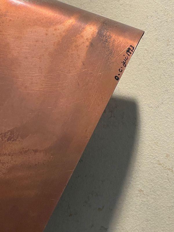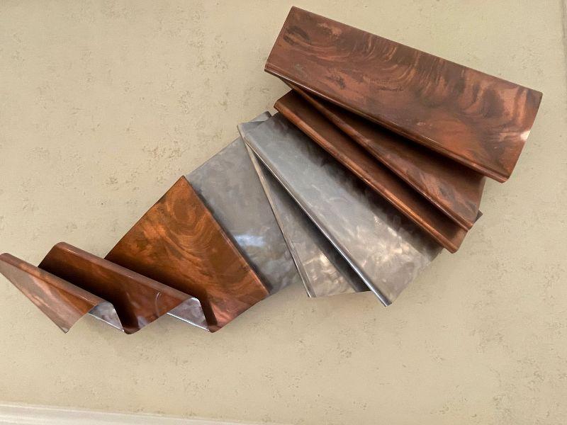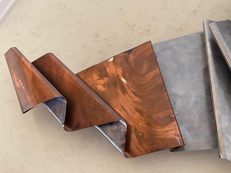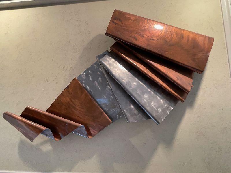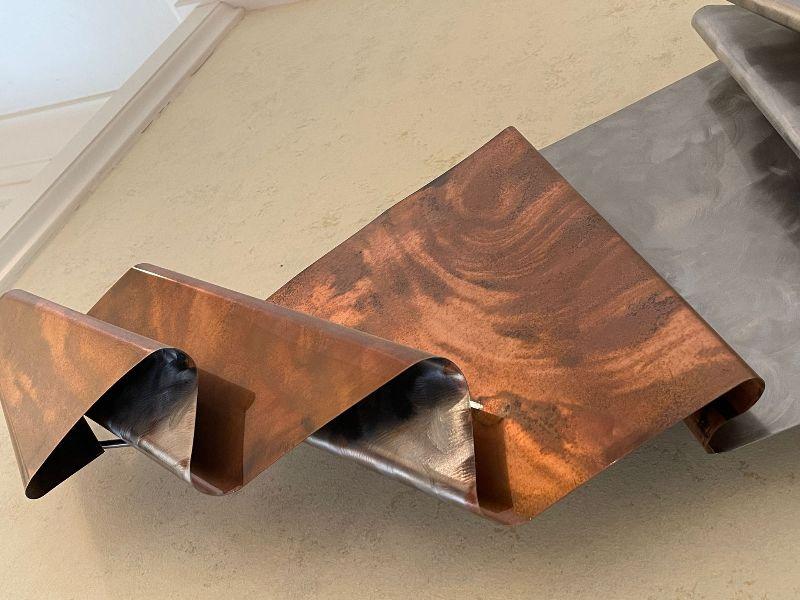 The Subject for auction is an original assembled sculpture resembling a suspended “folding ribbon” of steel - textured on one side with circular brushed patterns and the reverse a copper-toned enamel-like wash. In original, fine condition.