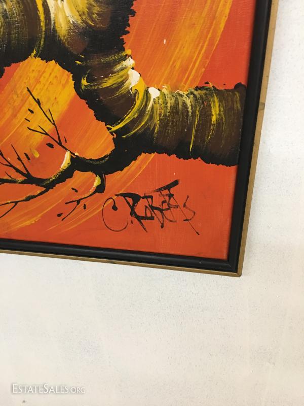 In good overall condition, frame has some scraps on it. canvas is fine. Original 1970's Commercial Art. Framed, 37" square.